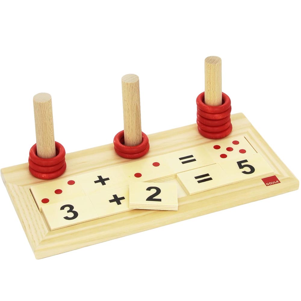 Juego didáctico educativo preescolar para aprender a sumar y restar al mismo tiempo que relacionan los conceptos de numero y cantidad. El juego incluye distintas maneras de aprender a hacer operaciones básicas ya sea con el número, con conjuntos de fichas o con anillas. Con todos estos elementos se proponen diferentes maneras de juego con los distintos elementos para aprender a sumar y restar los números del 1 al 10. Contenido: 10 fichas de madera numeradas del 1 al 10, 10 fichas de madera con conjuntos del 1 al 10, 2 fichas del 2 símbolo +, 2 fichas del símbolo -, 2 fichas del símbolo =, 20 anillas de madera para representar unidades, base de madera.
