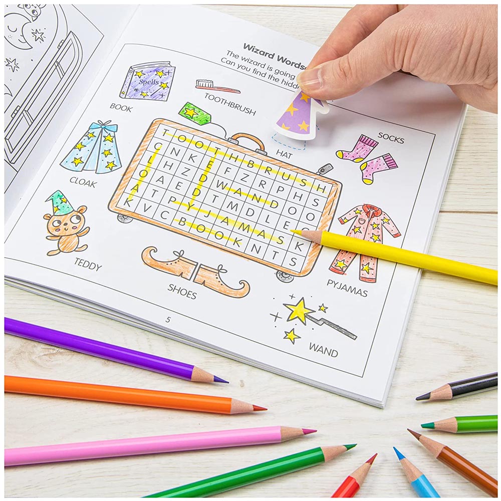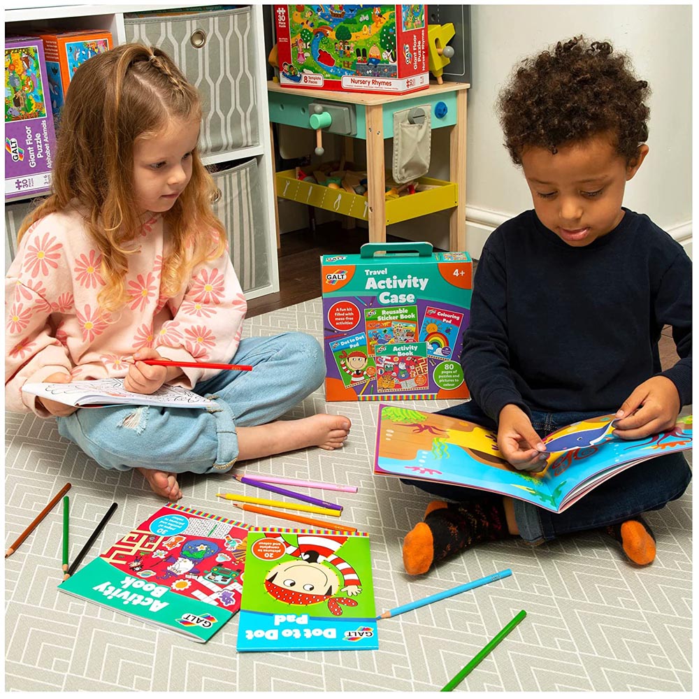 Un divertido set de actividades para llevar a todas partes y pasar horas de diversión. Ideal para llevar de viaje. Contiene: 1 cuaderno de actividades, 1 cuaderno de stickers reusables, 1 almohadilla para colorear, una almohadilla punto a punto, 10 lápices de colores y sacapuntas.