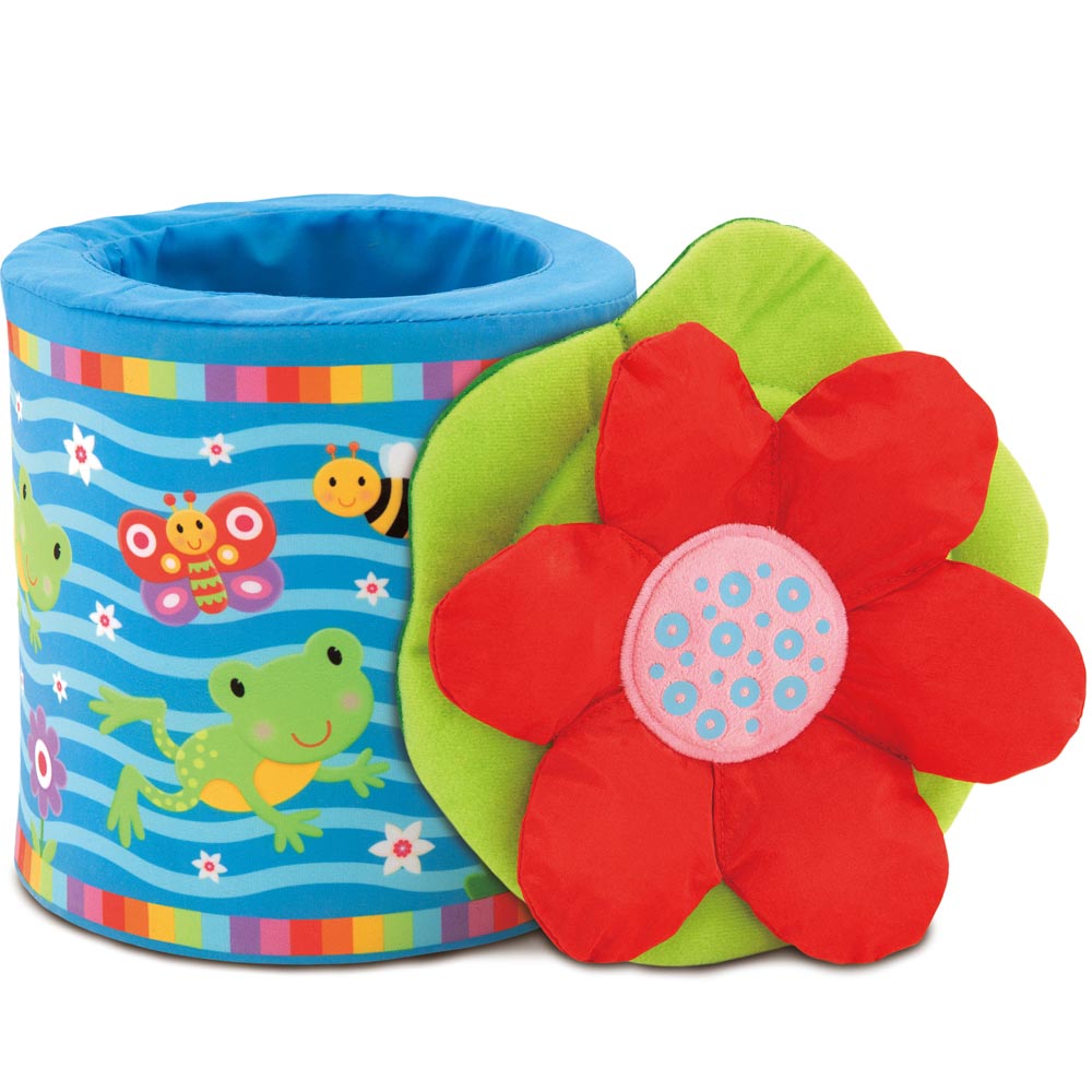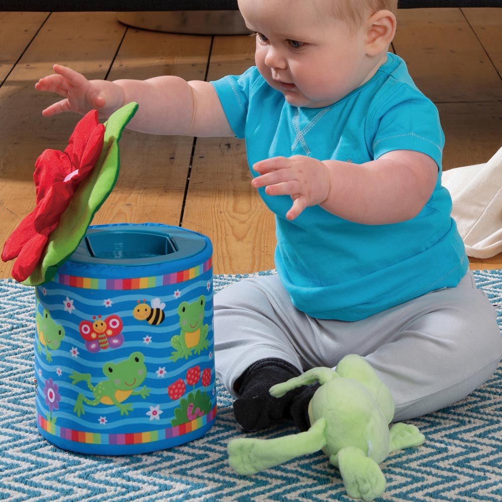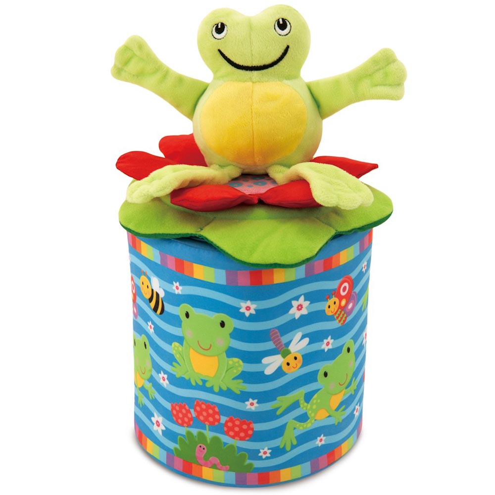Una versión suave y divertida del clásico juguete saltarín. Levanta la tapa y la rana salta de la caja. El juego se puede repetir una y otra vez. La rana rechinara y traqueteara. La tapa de hoja tiene pétalos arrugados y diferentes texturas para explorar. Suave y seguro, con tapa extraible y lavable a maquina. 20 cm
