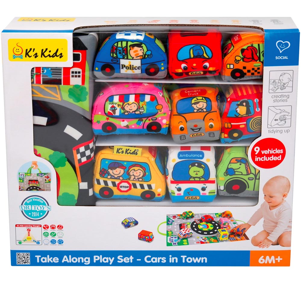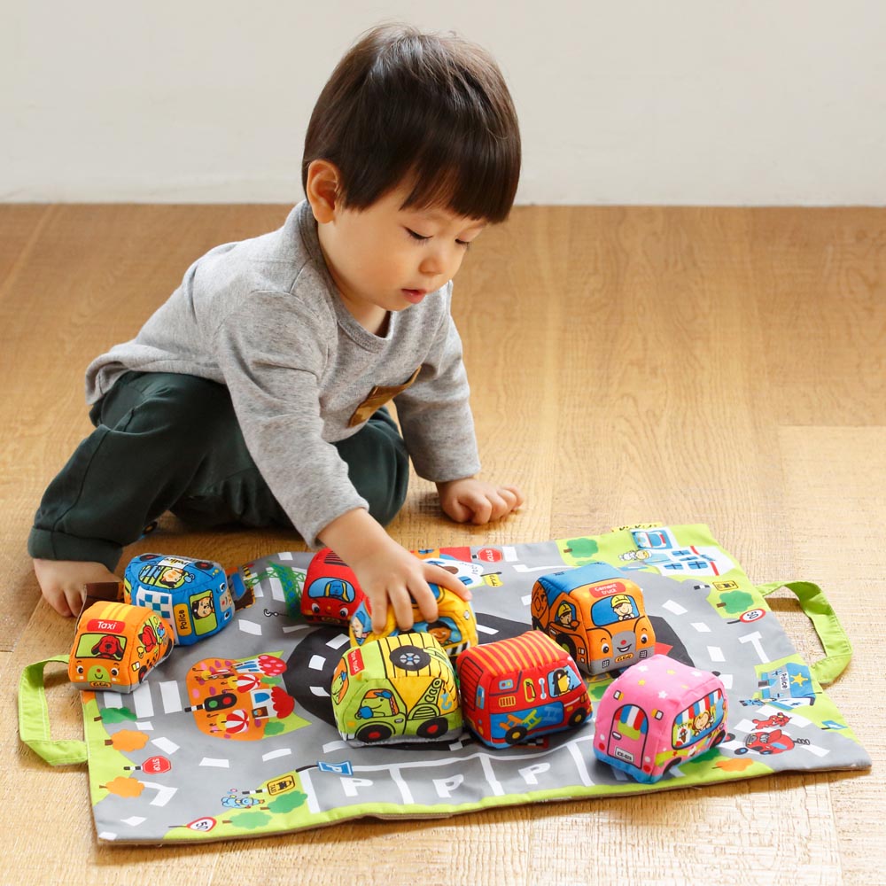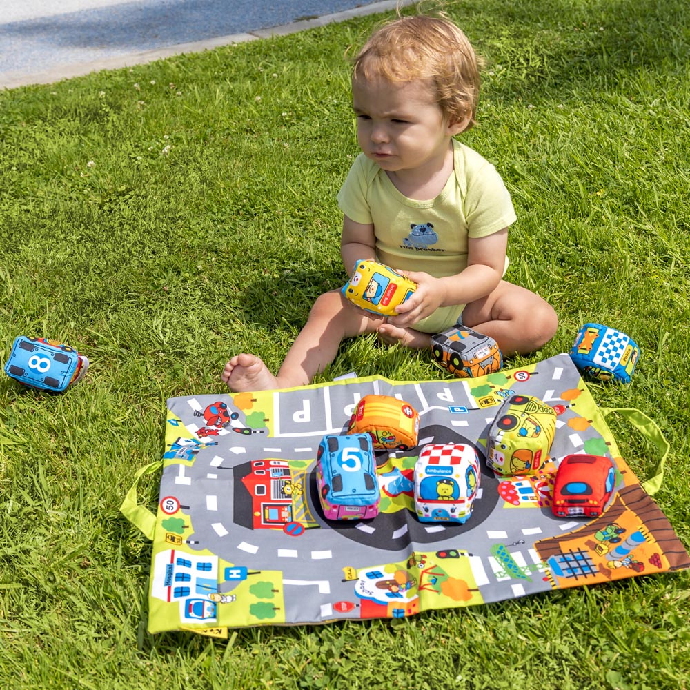 Mat de genero con una ciudad con calles impresa y escuela, centro de bomberos y mucho mas. 9 autos multicolores muestran diferentes números y ocupaciones, ideal para el aprendizaje y el juego de roles. los autos tiene sonajero, chirrido y sonido de arrugar. Al cerrarse se convierte en una maleta con asas fácil de transportar.