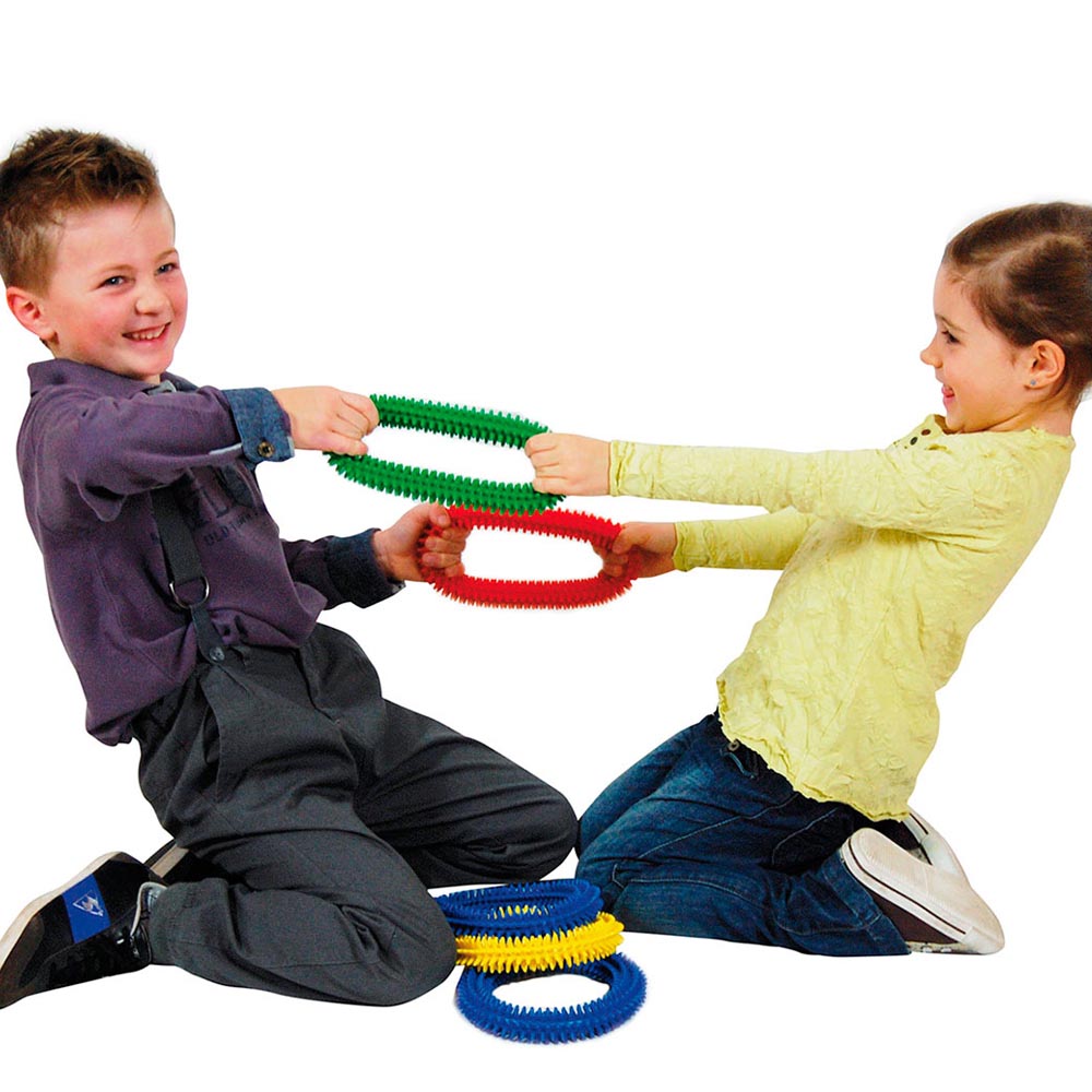 Anillo erizo, suave y flexible en 4 diferentes colores, ideales para la actividad motora y recreativa, los anillos se pueden utilizar para variados juegos en grupo en donde se estimula el agarre, los reflejos y la coordinación. Se hunden en el agua lo que permite hacer ejercicios de apnea y recuperación. Es un instrumento valido de masaje para manos y pies. Colores surtidos. Precio por unidad.
