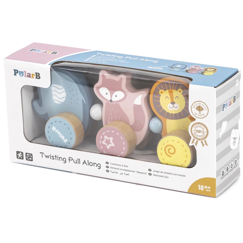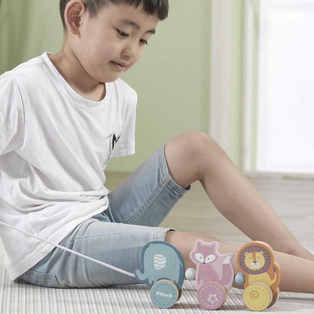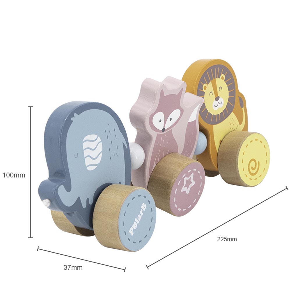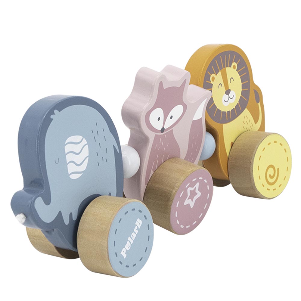 Hermoso arrastre con tres divertidos personajes: un tierno elefante, una divertida zorra y un gracioso león. Diseñado en colores pasteles. Ideal para que los niños y niñas lo lleven a todas partes de paseo. Fabricado en madera. De material suave y resistente. Recomendado a partir de los 18 meses de edad.