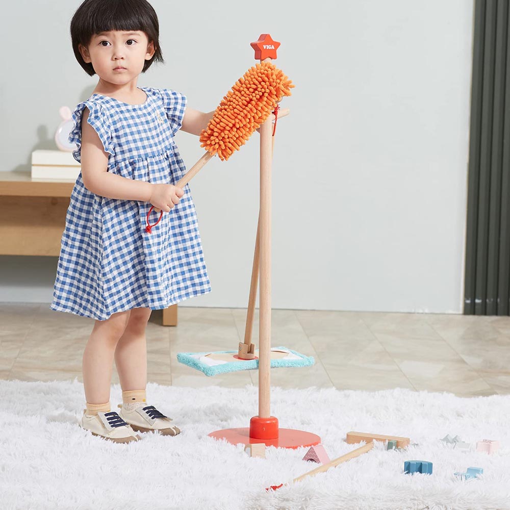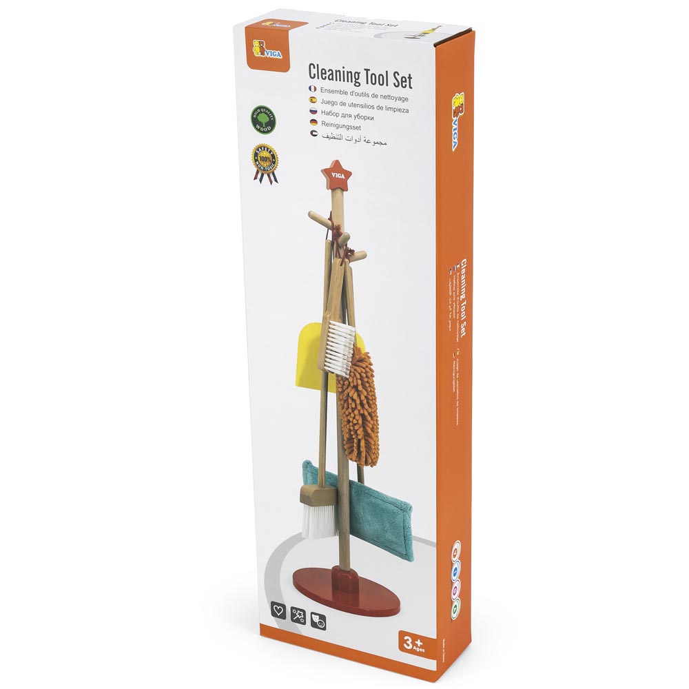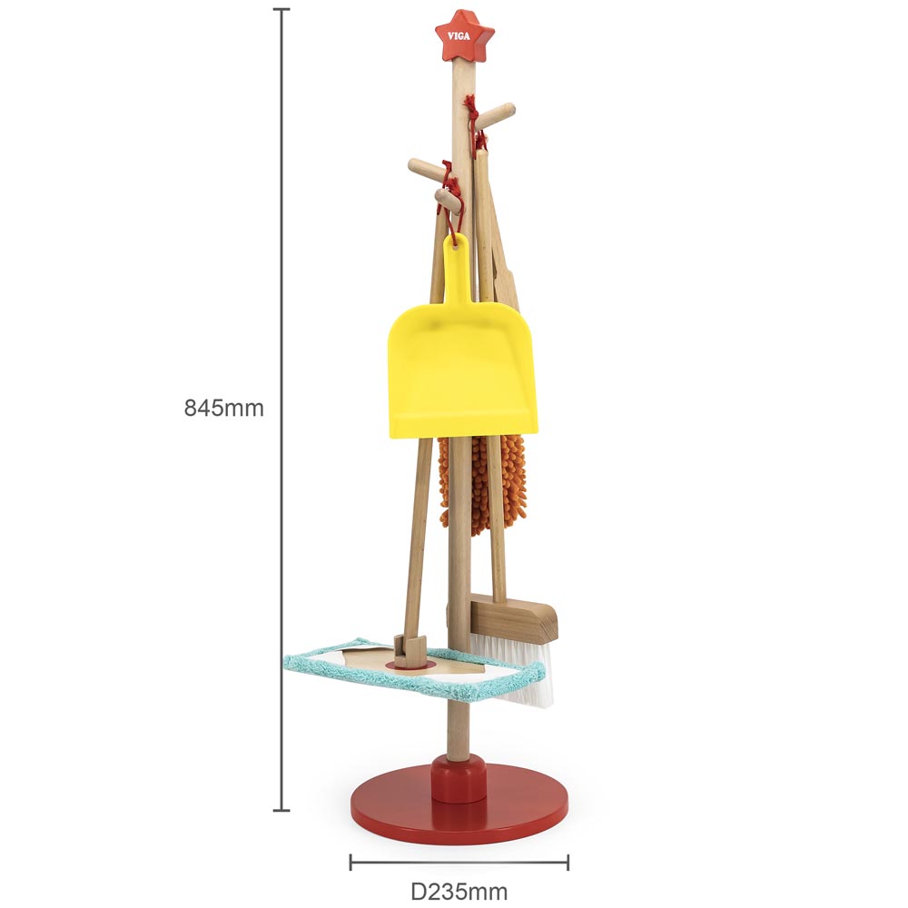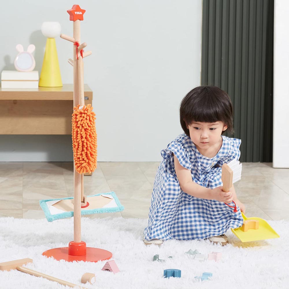Este hermoso set de limpieza incluye todos los accesorios para jugar imitando los elementos reales. Es de madera con colores vivos y alegres. Incluye mopa, escoba, pala, plumero y cepillo. Todos los accesorios se guardan de forma ordenada colgados en el perchero. Este tipo de juegos de rol ayudan a los niños a desarrollar sus habilidades motoras y a divertirse jugando a ser grandes. Los juegos de roles son ideales para estimular las habilidades sociales y la imaginación de niños y niñas.