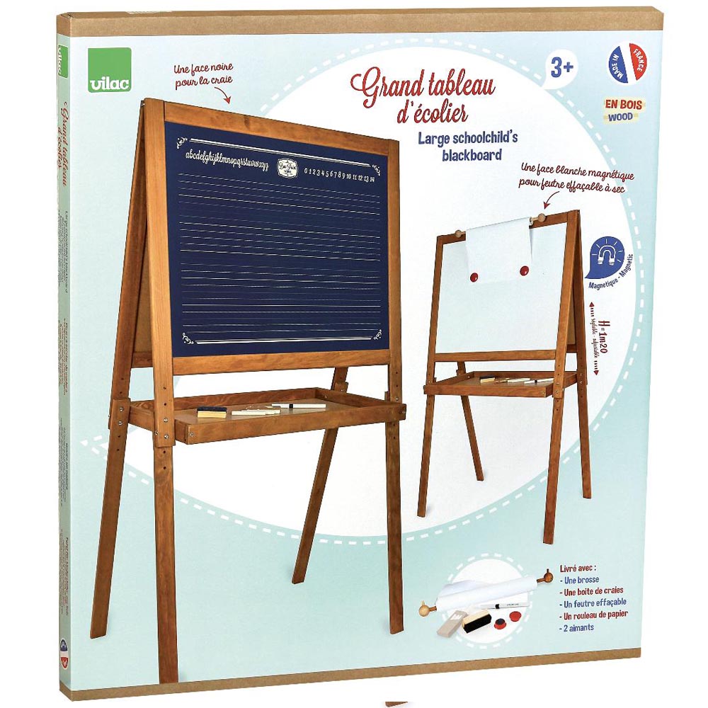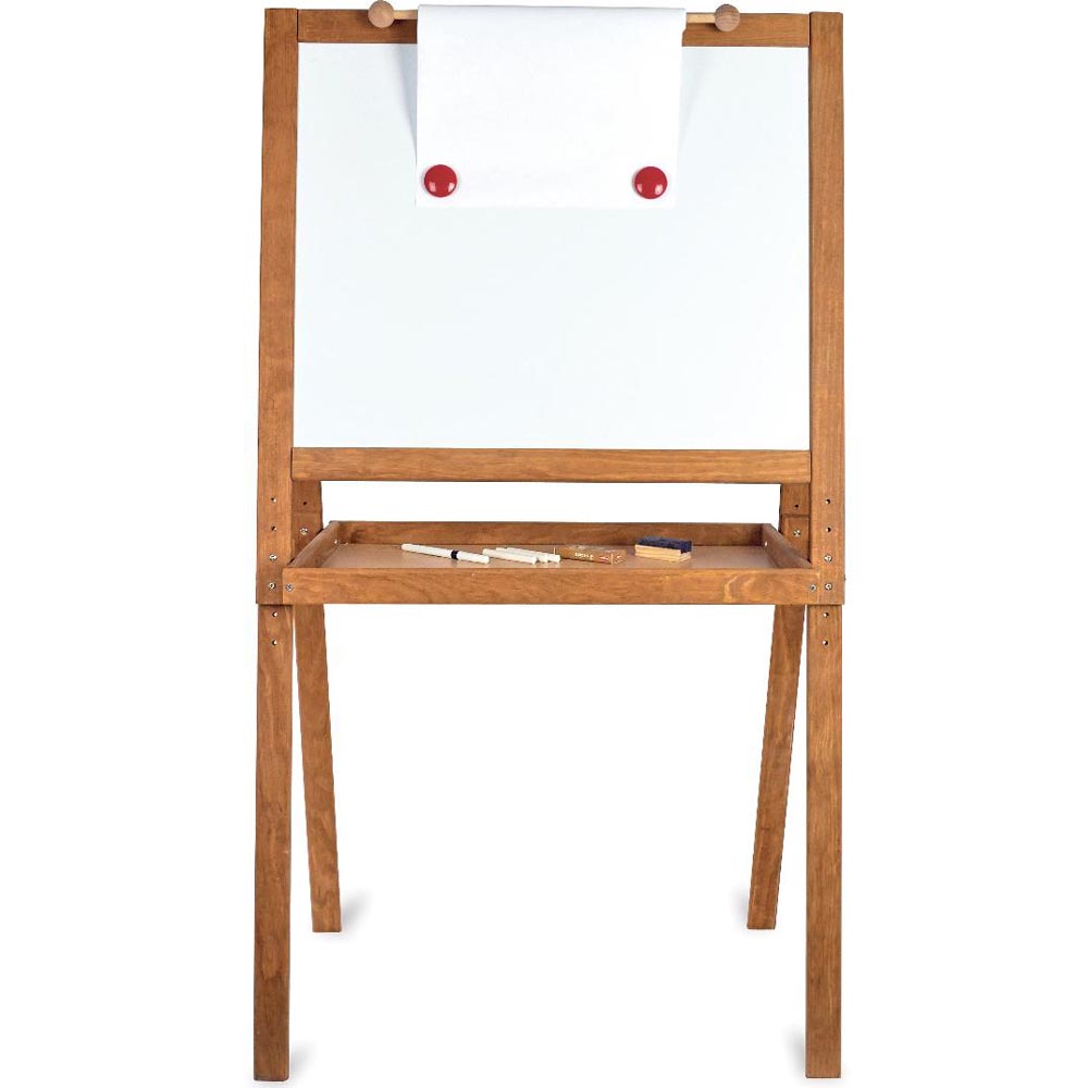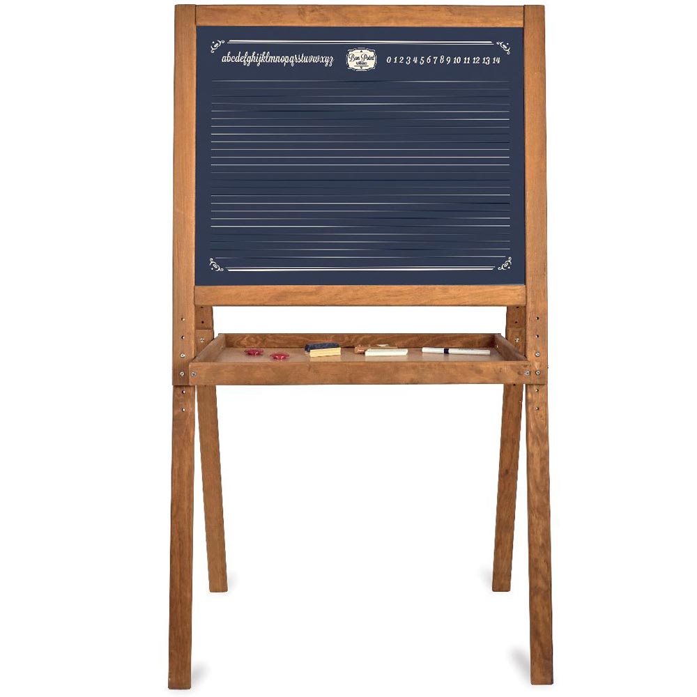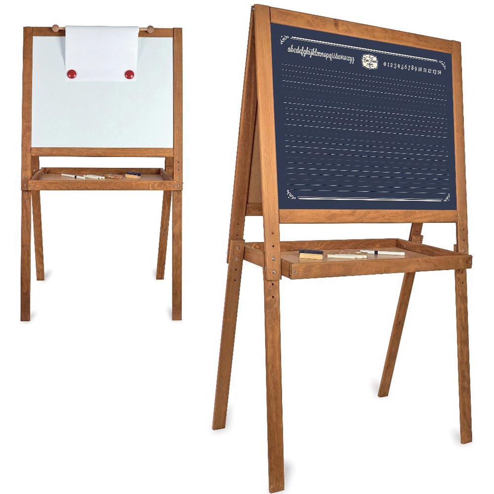 Esta es una gran pizarra de madera con un lado para líneas de tiza y otro lado blanco magnético para marcadores e imanes. Esta mesa también tiene un rollo de papel para dibujar. Incluye rollo de papel, imanes, pincel para pizarra, tizas y rotuladores. De material suave y resistente.