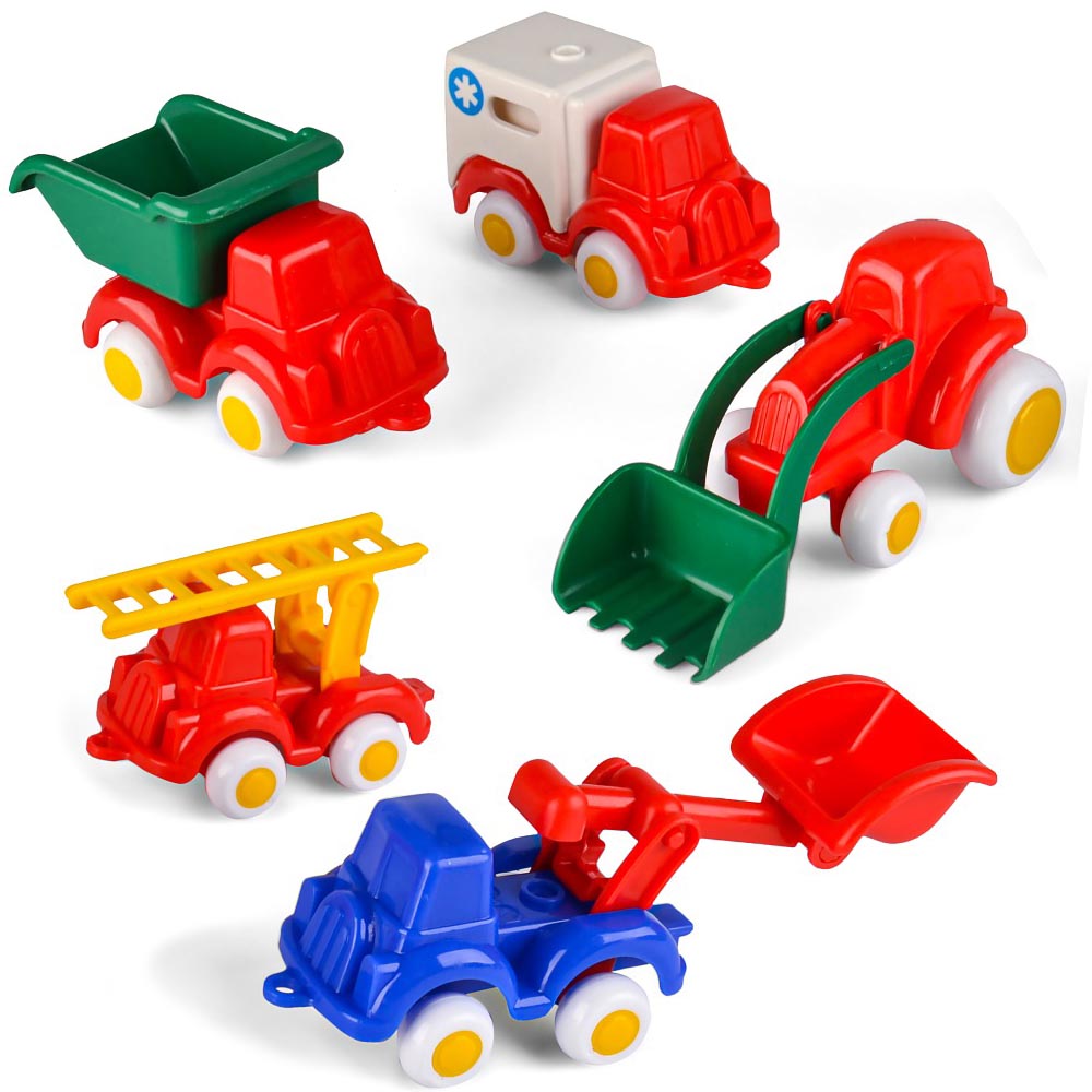 5 modelos de vehículos de construcción mini chubbies de material plástico, irrompible, seguros y de colores fuertes y brillantes. Seguros, suaves, simples, resistentes y silenciosos. Consultar por stock individual. Precio por unidad.
