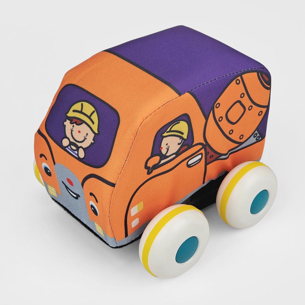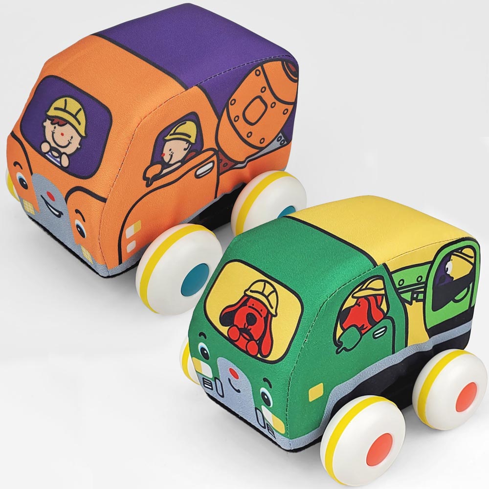 Encantador conjunto de vehículos que consta de 2 lindos autos suaves «pull back»: camión remolque y camión mezclador. Los niños Y niñas pueden jugar con los autos poniendo en juego su imaginación; nunca se cansan de empujarlos y tirar de ellos por todas partes. Una gran manera para que los más pequeños comiencen a observar acción y reacción y compartan su alegría con sus compañeros mientras juegan. La base de plástico se puede desmontar y el auto suave se puede lavar a máquina. De material suave y resistente.