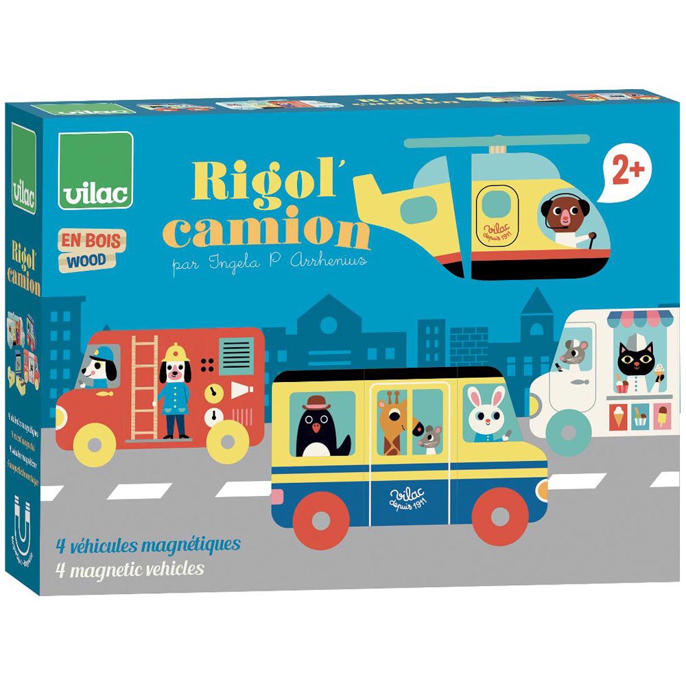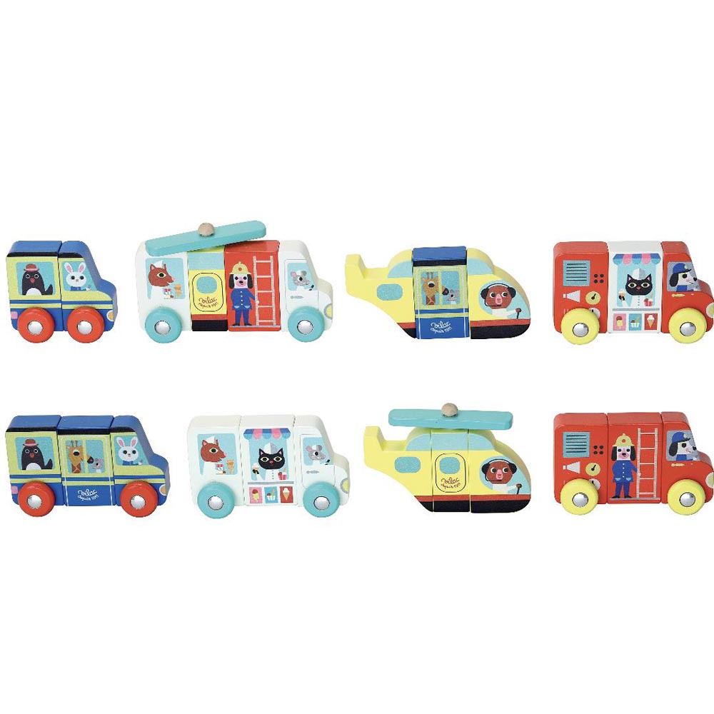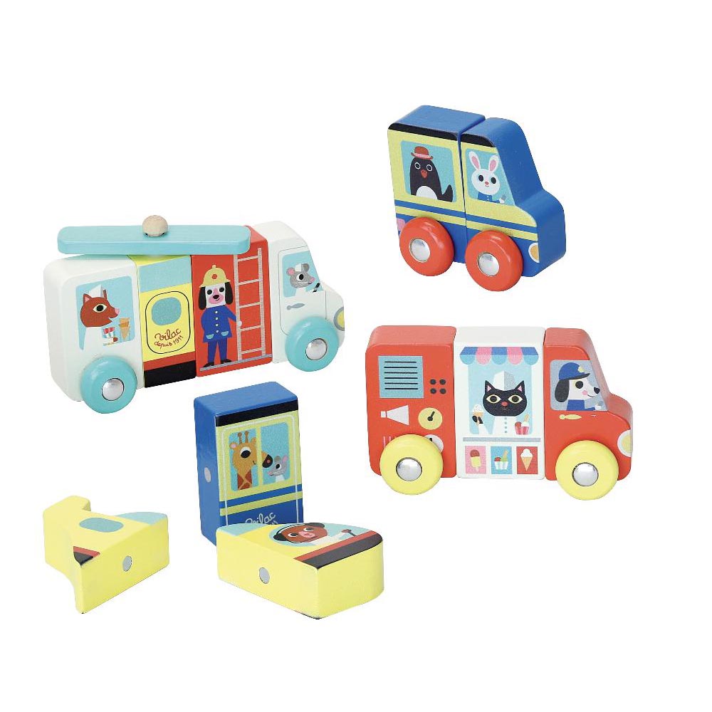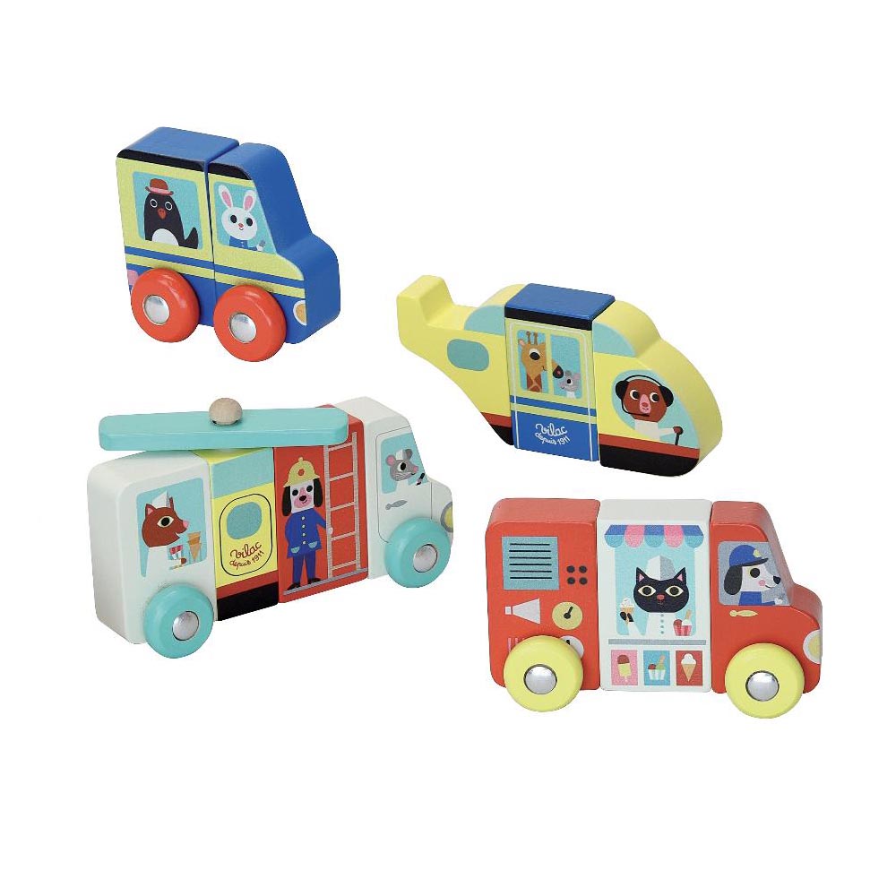Divertidos vehículos magnéticos de madera para pasar horas de diversión. De material suave y resistente y con las ilustraciones más divertida.