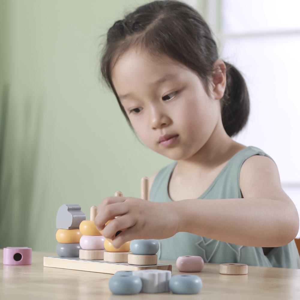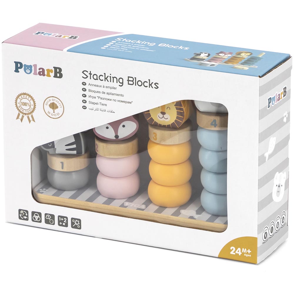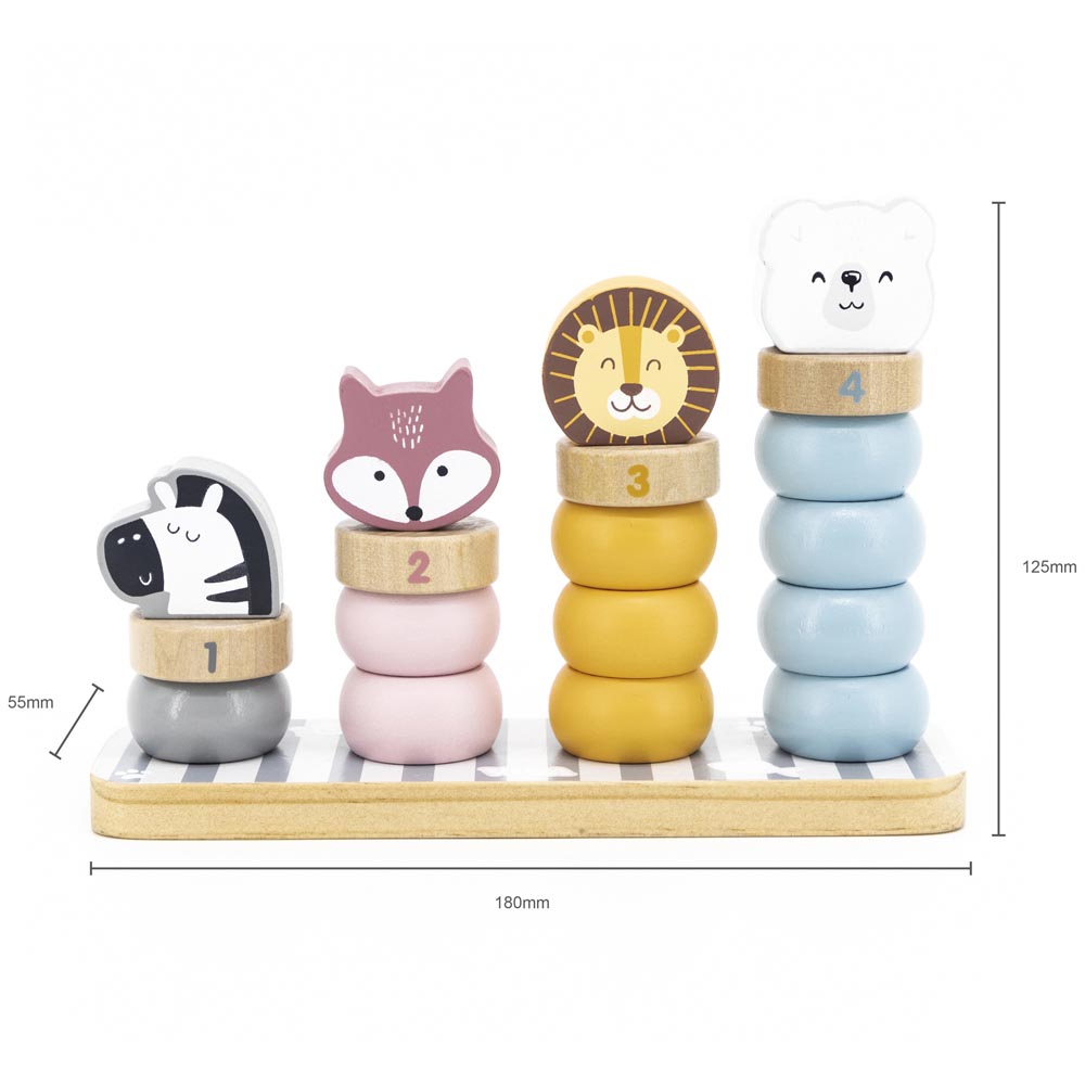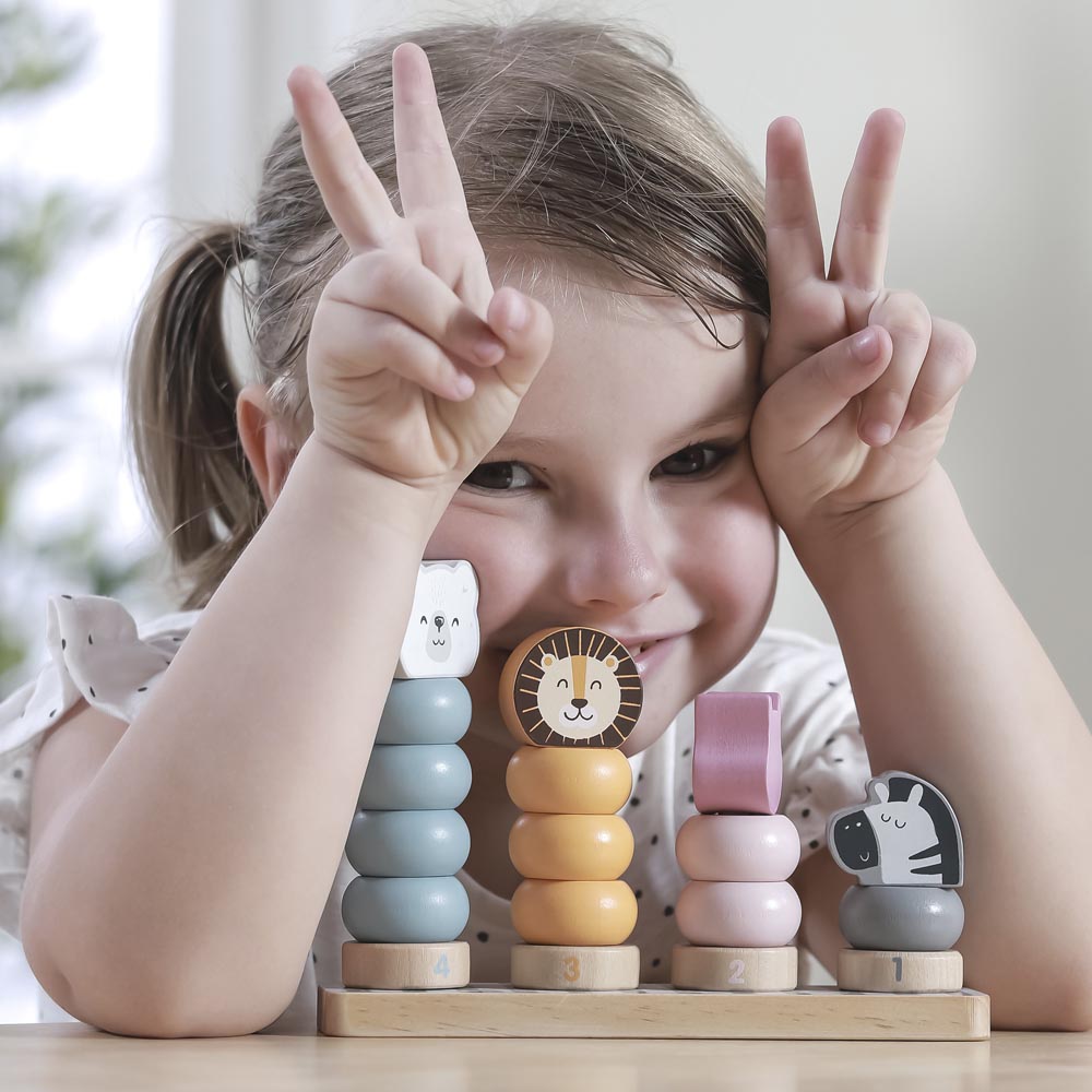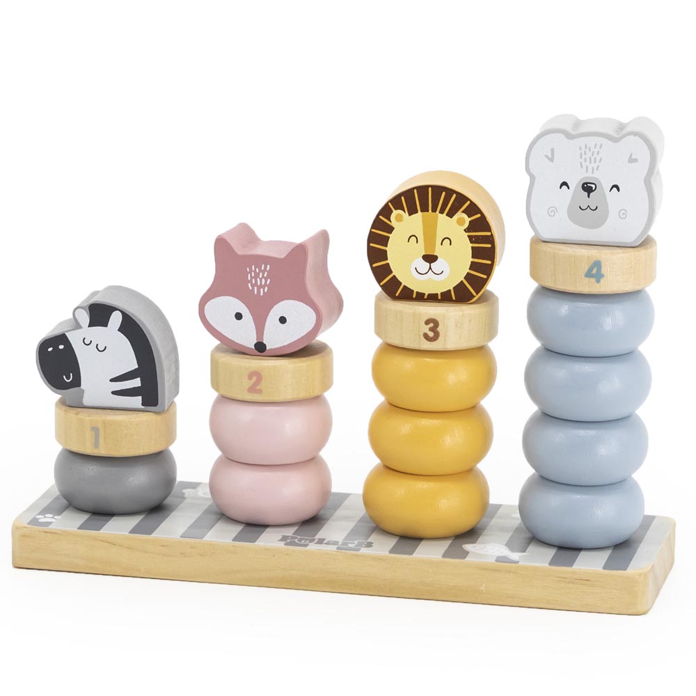 Divertido juego de apilamiento diseñado en suaves colores pasteles para pasar horas de diversión. Ideal para el desarrollo de la motricidad fina, el reconocimiento de colores y números, el pensamiento lógico matemático y mucho más. Fabricado en madera. De material suave y resistente. Incluye 18 piezas para apilar. Recomendado a partir de los 24 meses de edad.