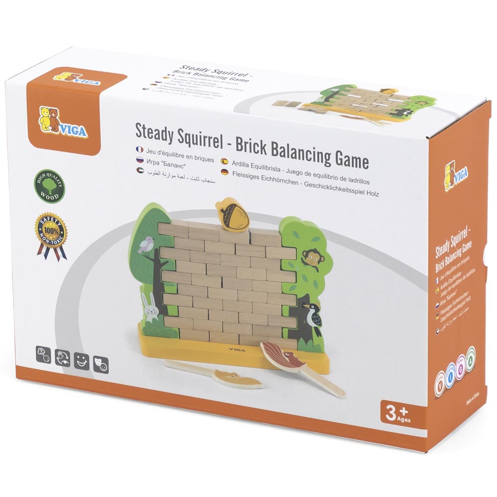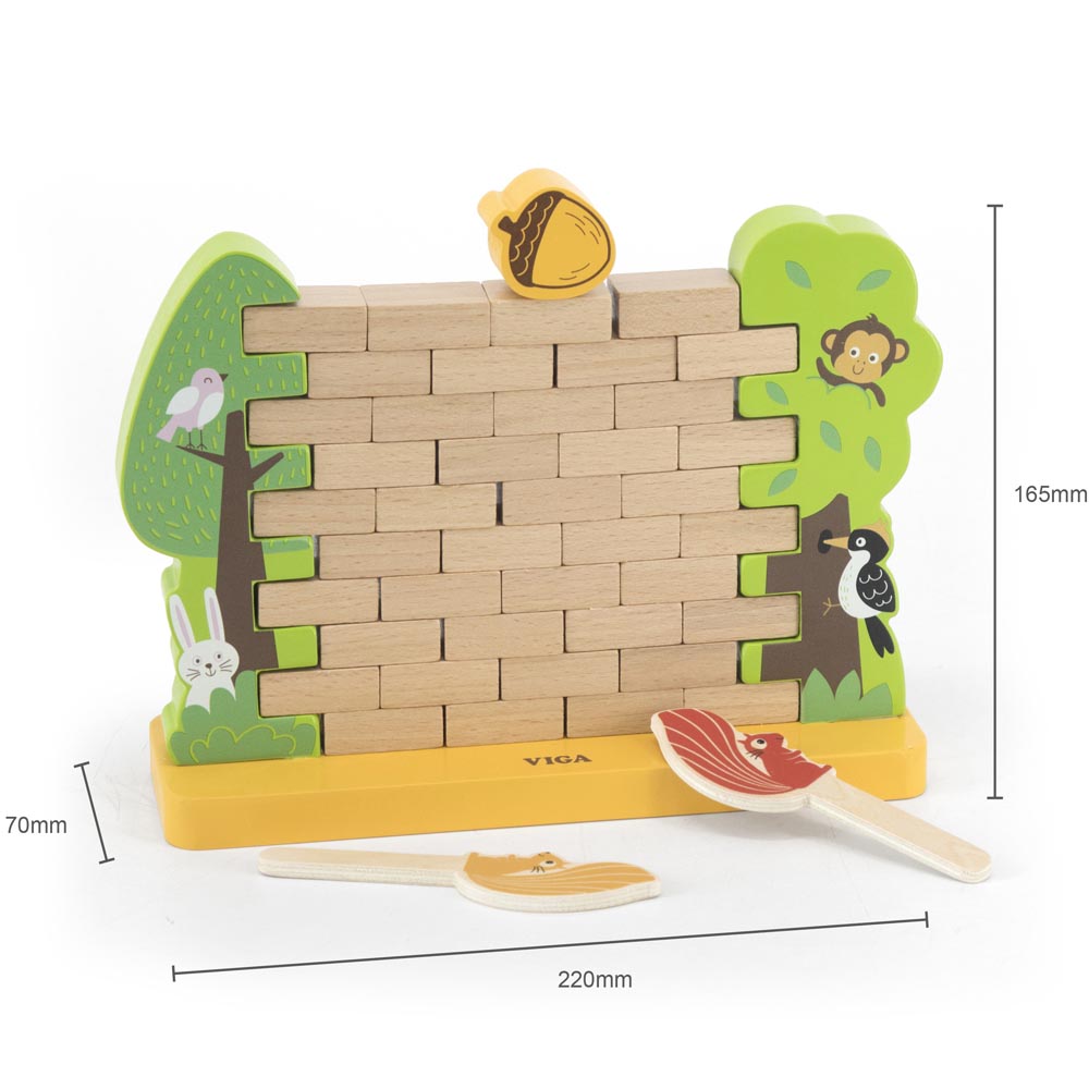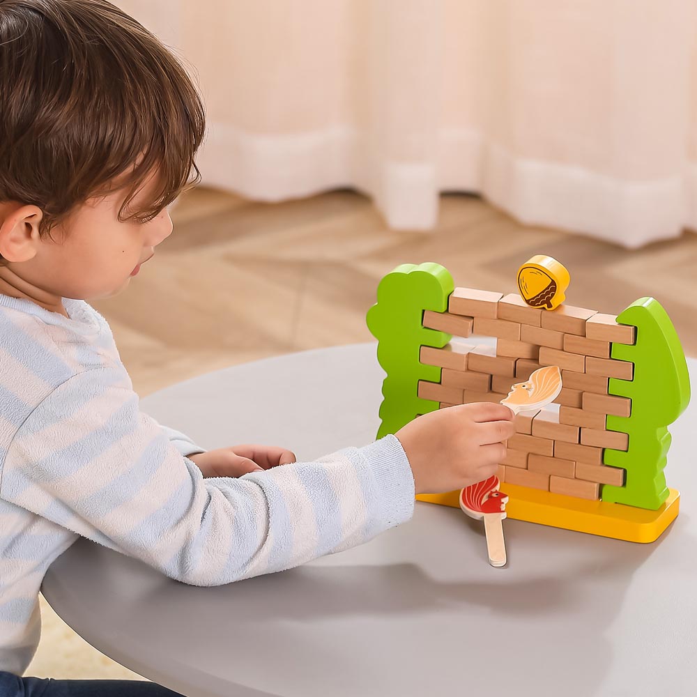 Este divertido juego pone en juego la motricidad fina, la concentración, la paciencia y el pensamiento lógico de los más pequeños de una forma muy divertida. Los niños y niñas deben construir la pared y colocar la nuez encima, luego con las divertidas ardillas tendrán que ir por turnos sacando cada una de las maderitas sin que caiga la nuez ni los árboles a los lados. Para jugar entre dos jugadores. Desarrolla la coordinación mano-ojo. Un entretenido juego para toda la familia. De material suave y resistente.