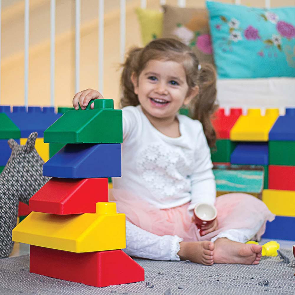 Divertidos bloques gigantes para comenzar a construir desde la primera infancia. Estos bloques coloridos, gigantes, suaves y flexibles, se unen y se apilan alto, un juego ideal para desarrollar habilidades motrices y creativas. Los niños y niñas además de construir pueden clasificar y reconocer colores y formas. Los bloques están hechos de material ligero, duradero, lavable y no tóxico que es seguro para niños y niñas. Los bloques son ideales para manos pequeñas, con un tamaño de bloque básico que mide 6,35 cm de largo y ancho por 5,08 cm de alto.
