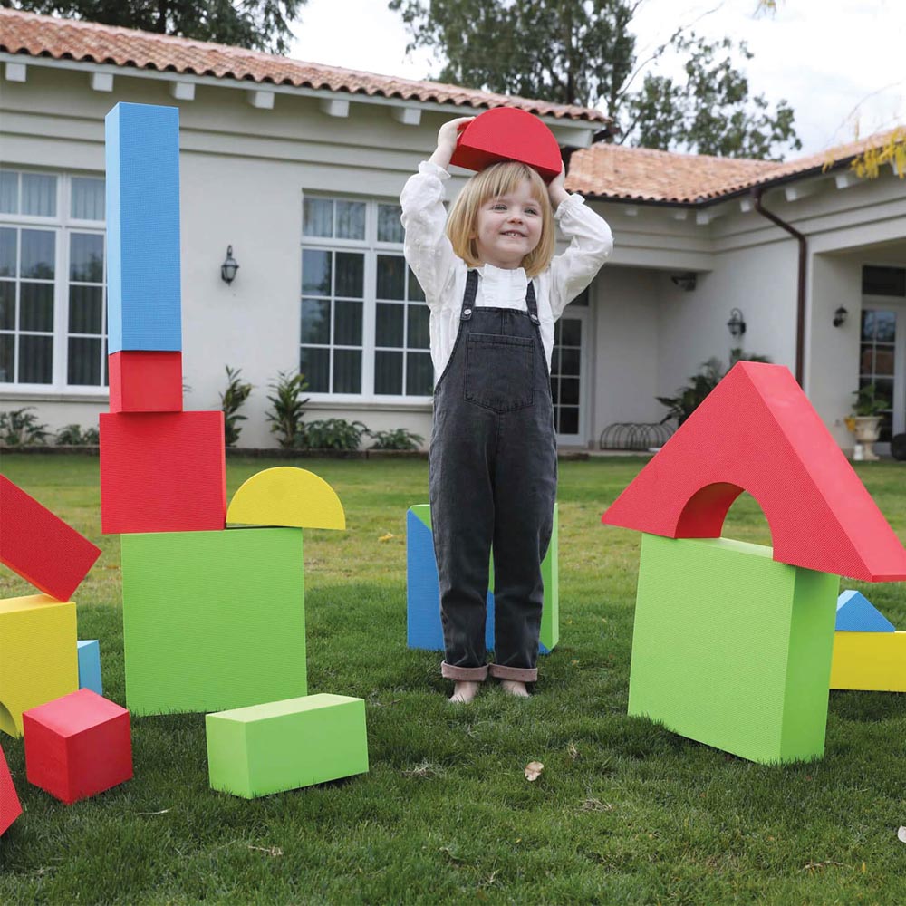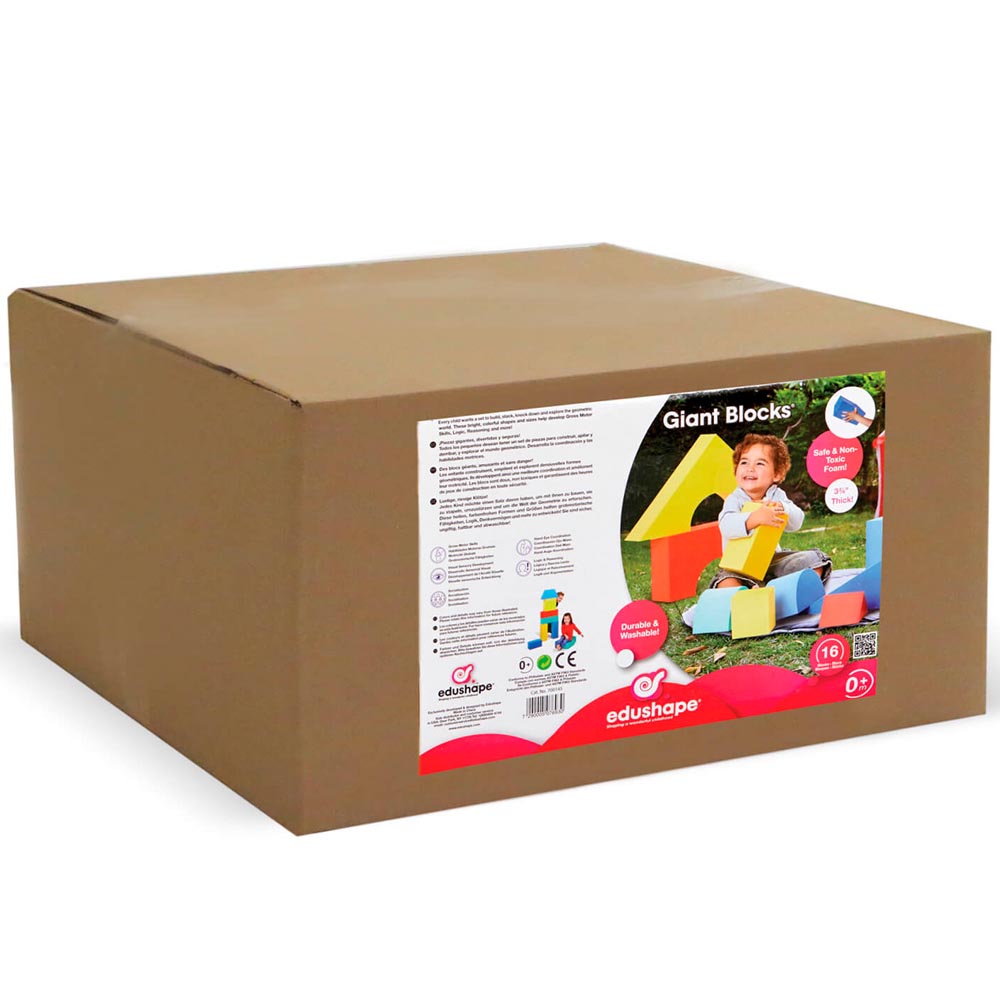 16 bloques gigantes de espuma, suaves y livianos. De 11 cm de espesor cada uno. 2 cuadrados (20 x 20 x 11 cm), 4 rectángulos, 2 rectángulos chicos, 2 triángulos, 1 triangulo chico, 2 triángulos escalenos, un trapecio, 1 puente y un medio circulo. En 4 colores (verde, azul, amarillo y rojo). Bloques gigantes y livianos para para armar y crear sin limites. De excelente calidad y diseño. Presentación en caja de cartón.