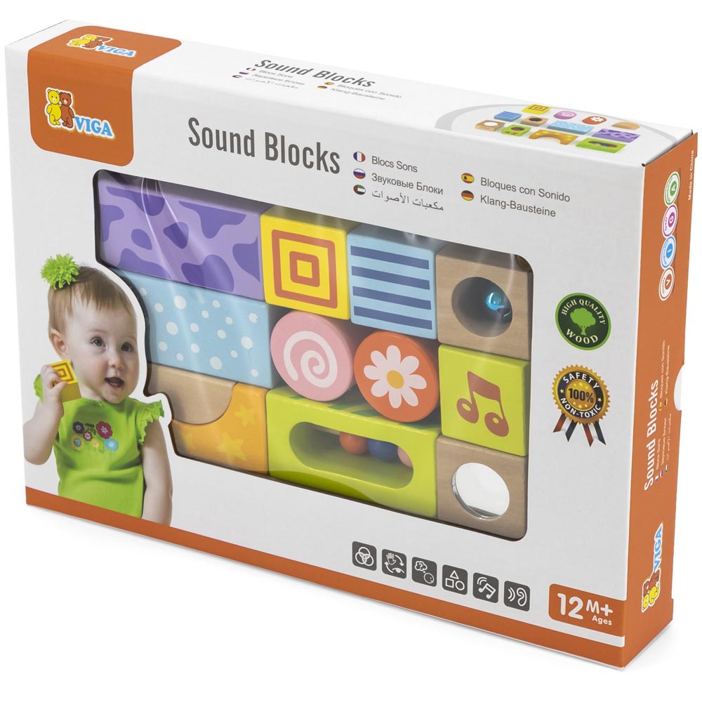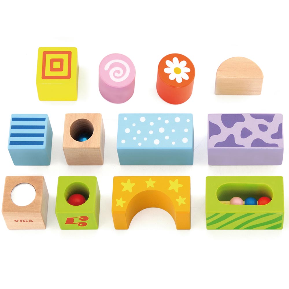 12 bloques de madera bellamente diseñados en una variedad de formas y colores. Los coloridos bloques de madera hacen 9 sonidos diferentes. De colores suaves y los bordes redondeados hacen de este un gran juguete sensorial para los mas pequeños. Cada bloque emite un sonido cuando se agita. Confeccionado con tintas no toxicas. 4 cm bloque mas pequeño.