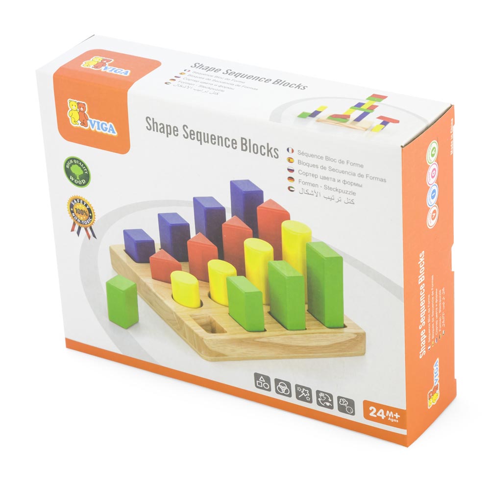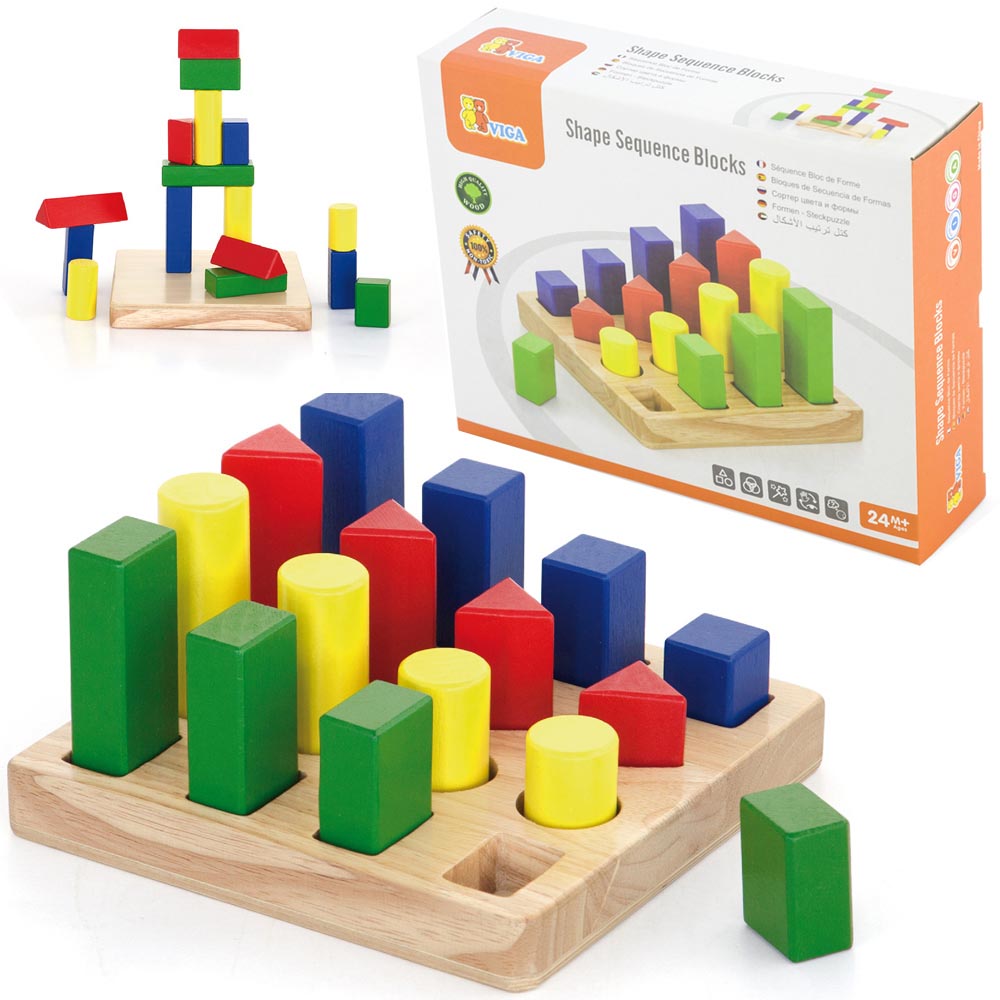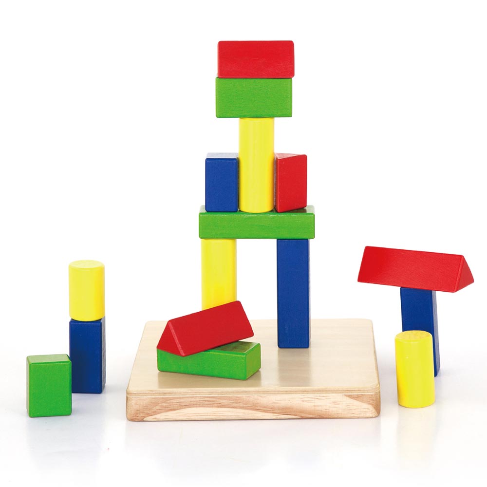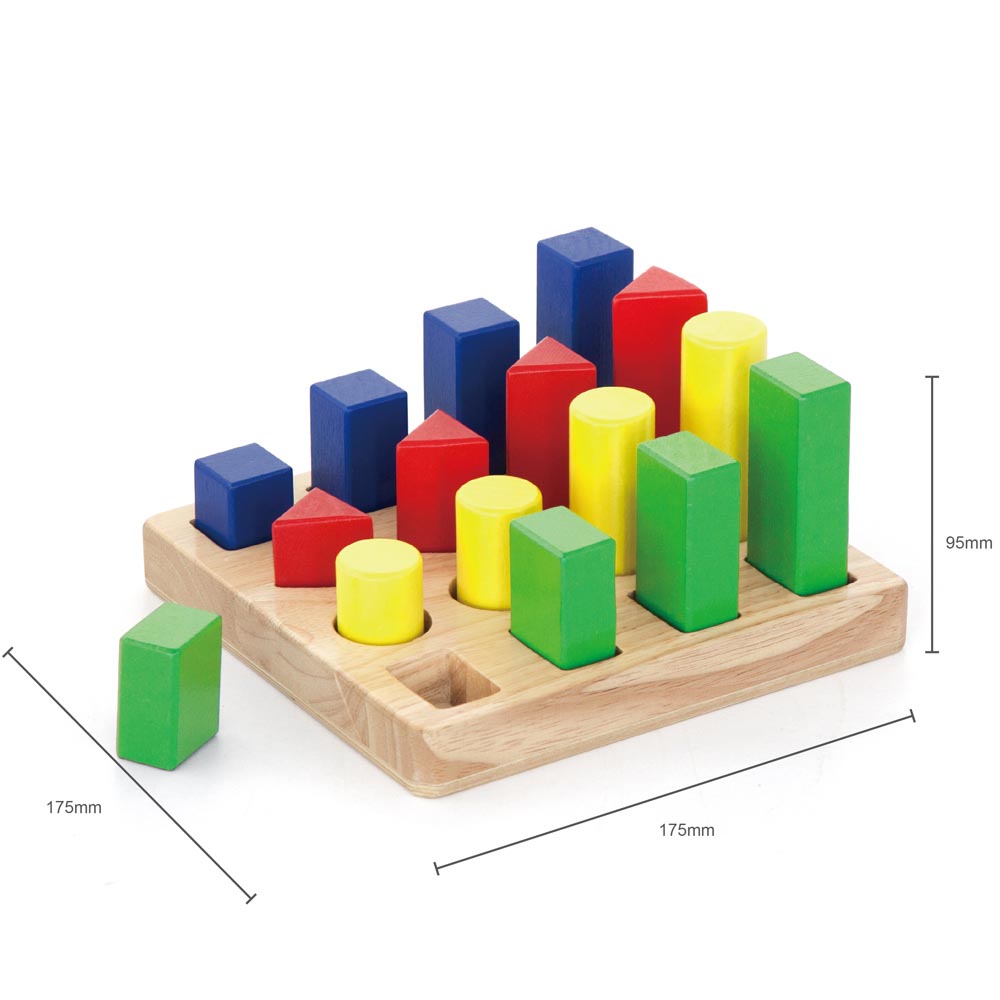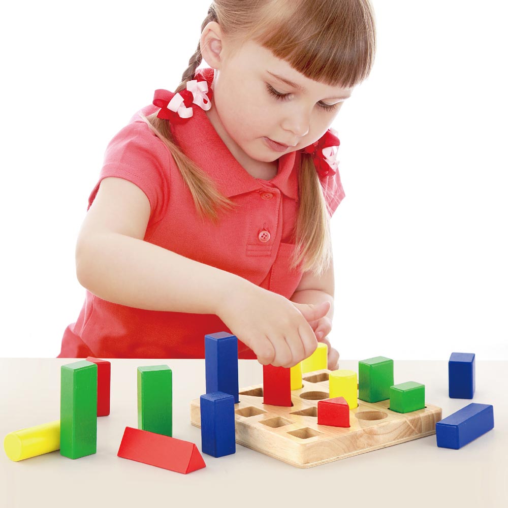 16 bloques de madera cuadrados, triángulos, círculos y rectángulos en alturas crecientes mas base para clasificarlos. Fomenta la creatividad y las habilidades de coordinación mano ojo.