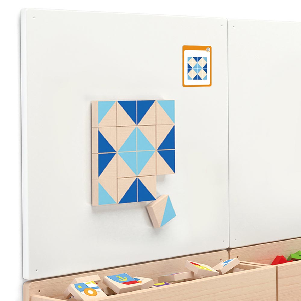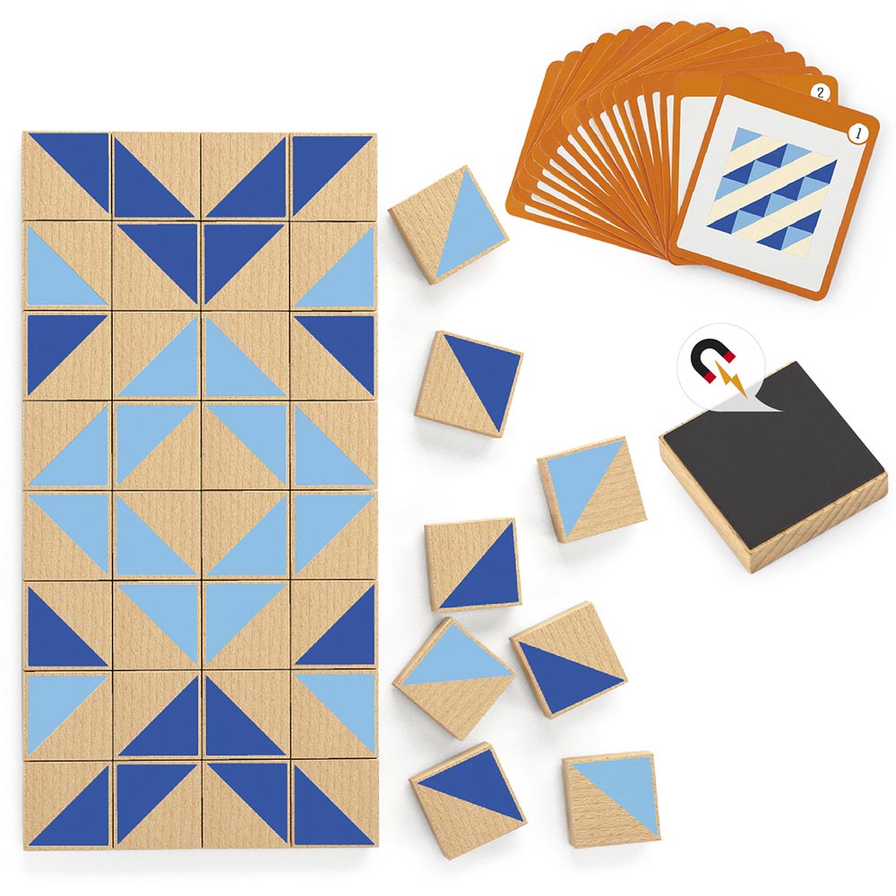 Estos bloques magnéticos invitan a los mas pequeños a conocer los tangram de una forma muy divertida. Incluye 20 cartas con ejemplos para que los niños y niñas diseñen siguiendo un patrón. Este juego estimula la coordinación mano-ojo y el desarrollo de habilidades cognitivas variadas. En la reproducción de las imágenes de las cartas los niños y niñas aprenden a modelar patrones y organizar espacialmente lo que ven mientras que a su vez pueden crear sus propios diseños dejando volar su imaginación. Incluye 40 bloques contenidos en una bolsa de genero fácil de lavar. 5 cm aprox cada pieza.