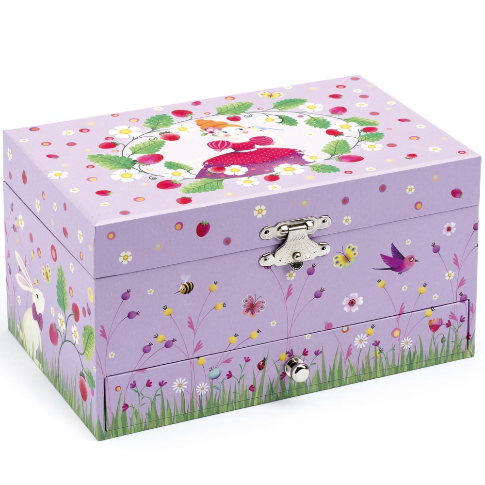 Caja musical de madera bellamente decorada para guardar pequeños tesoros en su interior de terciopelo. Contiene una figurita de plástico en su interior que gira con la melodía y un pequeño espejo. Melodía «La Flauta Mágica» Mozart. Viene en una decorativa caja de cartón.