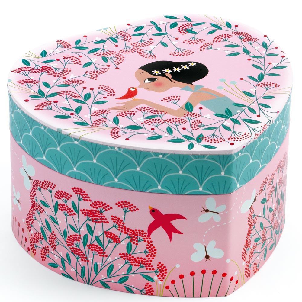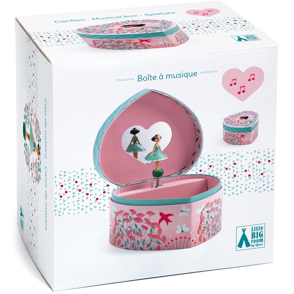 Esta preciosa caja musical en forma de corazón está decorada con delicadas flores, pájaros y una ilustración de una bailarina en la parte delantera. Dale cuerda, abre la caja y observa a la princesa bailando al ritmo de la melodía «Invitación a la danza» de Carl María von Weber, frente a un espejo en forma de corazón. El interior de la caja está cubierto con un suave fieltro para proteger las joyas y los pequeños tesoros. Un hermoso objeto que los pequeños adorarán durante años. ¡Un regalo ideal para un cumpleaños o un bautizo! Fabricado con papel y cartón certificado FSC®.