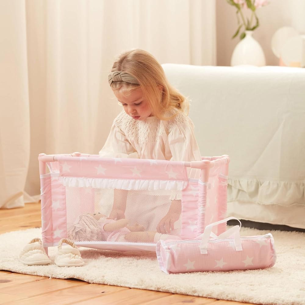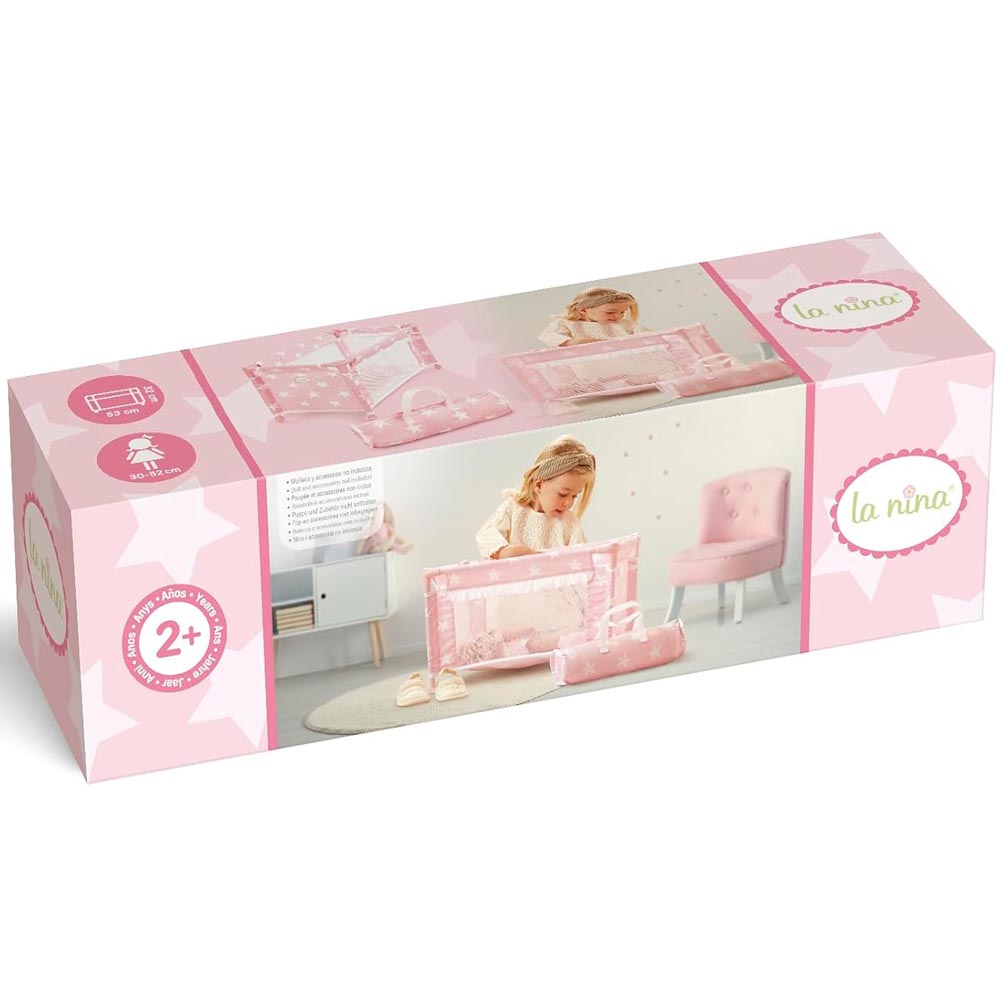 Ya puedes llevarte de vacaciones a tus muñecas con esta hermosa cama de viaje plegable y muy práctica. Incluye bolsa para guardarla y facilitar su transporte. Ideal para muñecas de 30 a 52 cm. Estructura de plástico rosa, con acabado de calidad, muy sólida y estable.
