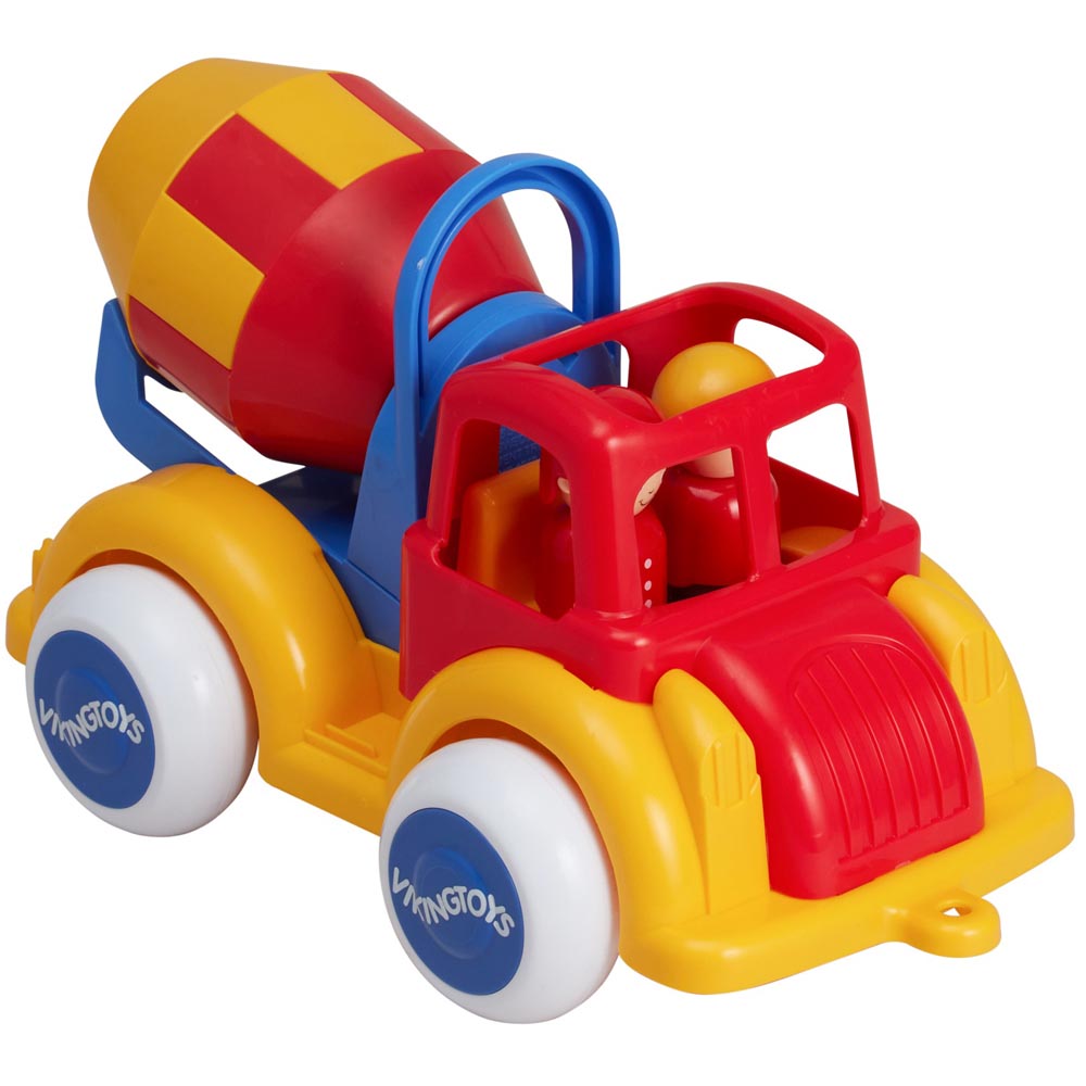 Camión betonero con una figura. Las ruedas de goma giran con facilidad, tienen ejes firmes y no se salen. Sus bordes son suaves y redondeados sin filos, por lo que son seguros para párvulos. De material resistente, irrompible. De excelente diseño y brillantes, vivos y variados colores. No toxico. Seguros, suaves, simples, resistentes y silenciosos.