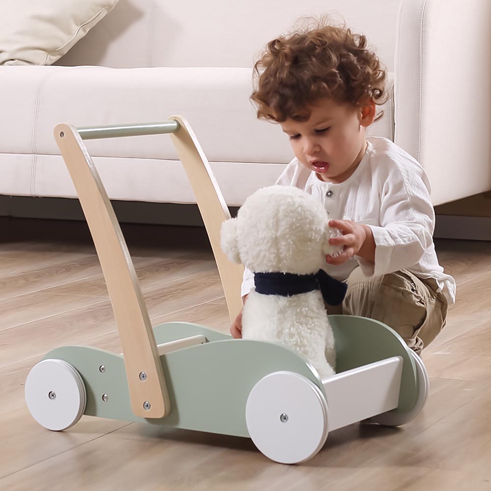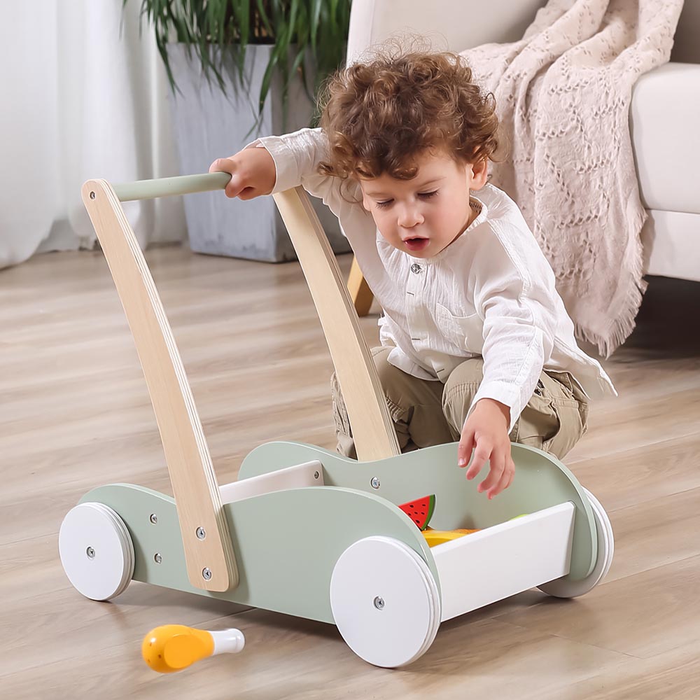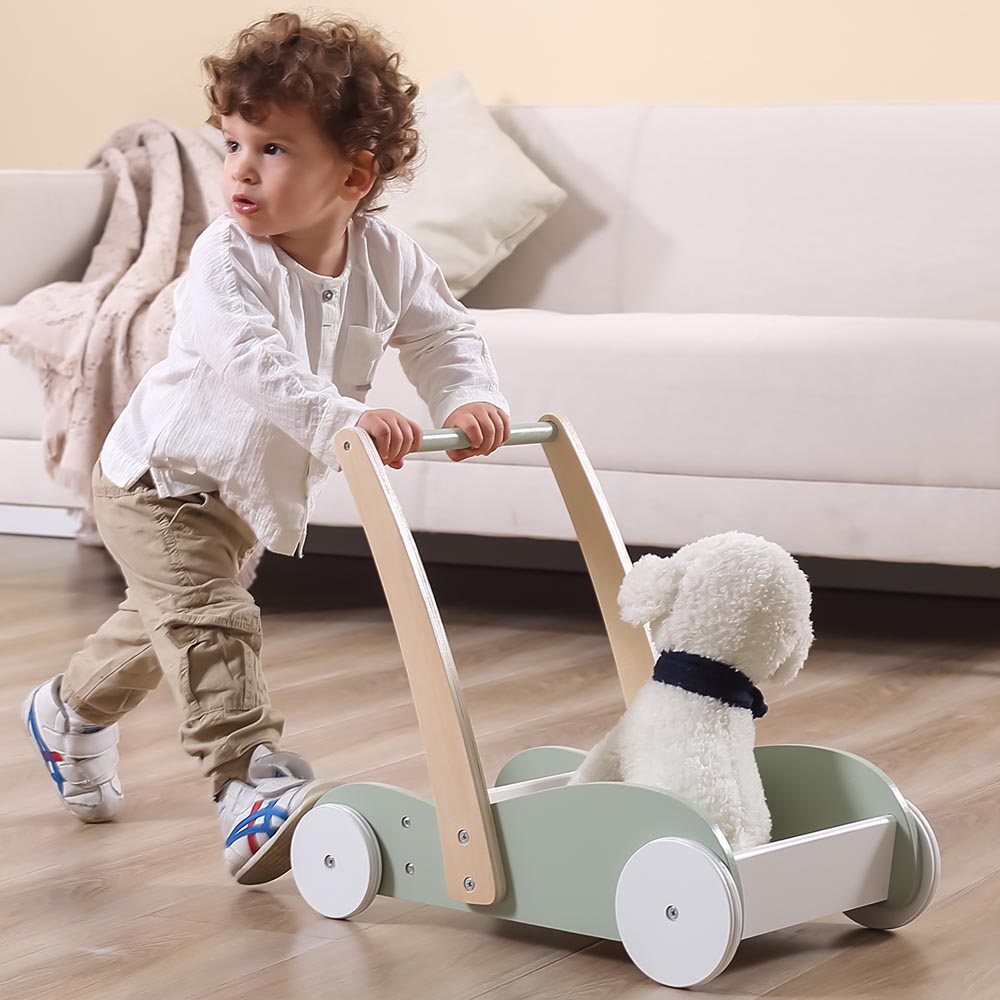 El diseño resistente de este hermoso carro de arrastre brinda apoyo y estabilidad mientras los pequeños dan sus primeros pasos, lo que ayuda a desarrollar habilidades para caminar y mantener el equilibrio. Viene con un baúl de juguetes grande para que los niños pequeños pongan sus juguetes favoritos y empujen el andador donde quieran. El anillo de goma antideslizante en la rueda aumenta la fricción y garantiza la seguridad de los niños cuando juegan.