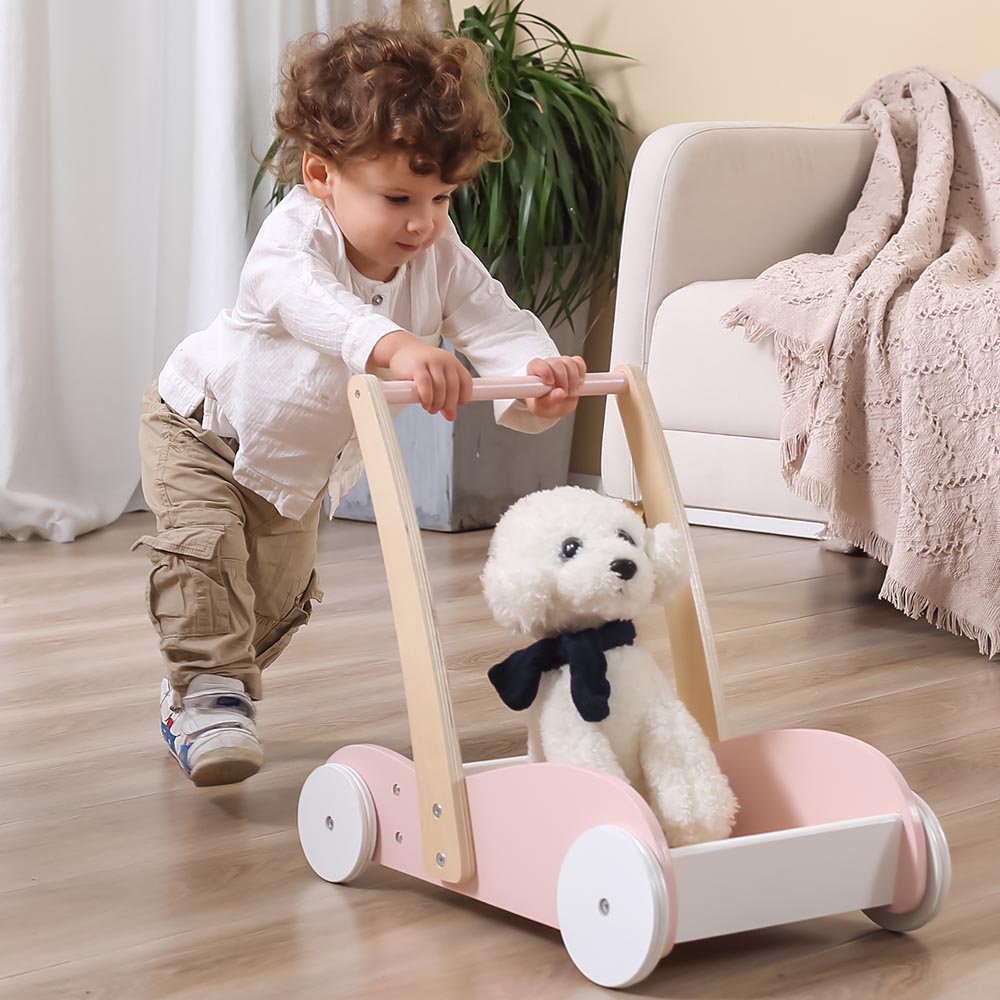 El diseño resistente de este hermoso carro de arrastre brinda apoyo y estabilidad mientras los pequeños dan sus primeros pasos, lo que ayuda a desarrollar habilidades para caminar y mantener el equilibrio. Viene con un baúl de juguetes grande para que los niños pequeños pongan sus juguetes favoritos y empujen el andador donde quieran. El anillo de goma antideslizante en la rueda aumenta la fricción y garantiza la seguridad de los niños cuando juegan.