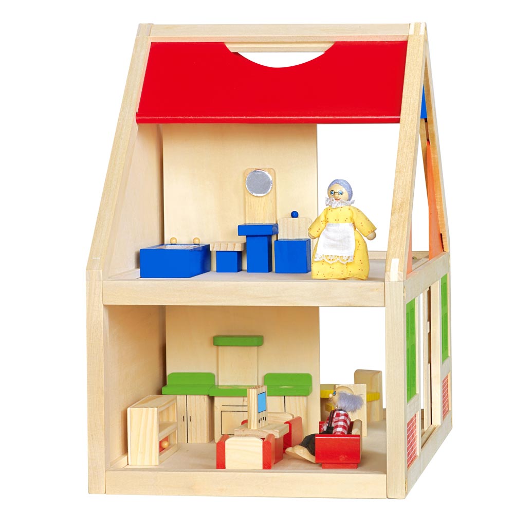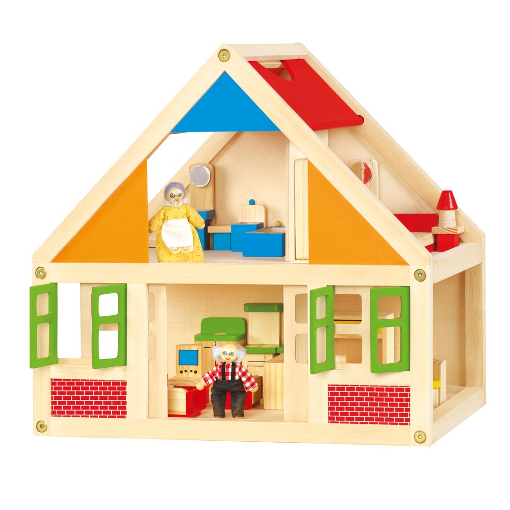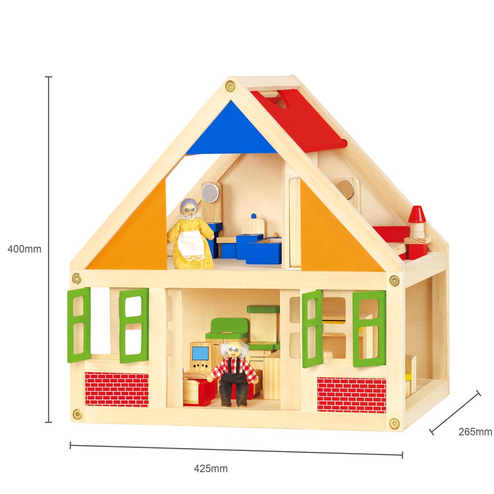 Casa de muñecas construido de madera de gran calidad y pintada a mano con pinturas no toxicas. Las puertas y las ventanas pueden abrirse y cerrarse. Contiene 24 piezas de accesorios de 1 dormitorio (1 cama 12 x 6 cm, 1 velador, 1 lámpara, 1 closet, 1 cómoda), 1 baño (1 lavatorio, 1 tina, 1 wáter, 1 piso), 1 living (1 mueble, 1 sofá 10 x 4 cm, 2 sillones, mesa, tele), 1 cocina (1 lavaplatos-horno 13 x 8 cm, 1 mueble) y 1 comedor (mesa y 4 sillas) y 2 figuras de abuelos con ropas de genero 10 x 4 cm. Fácil de armar.