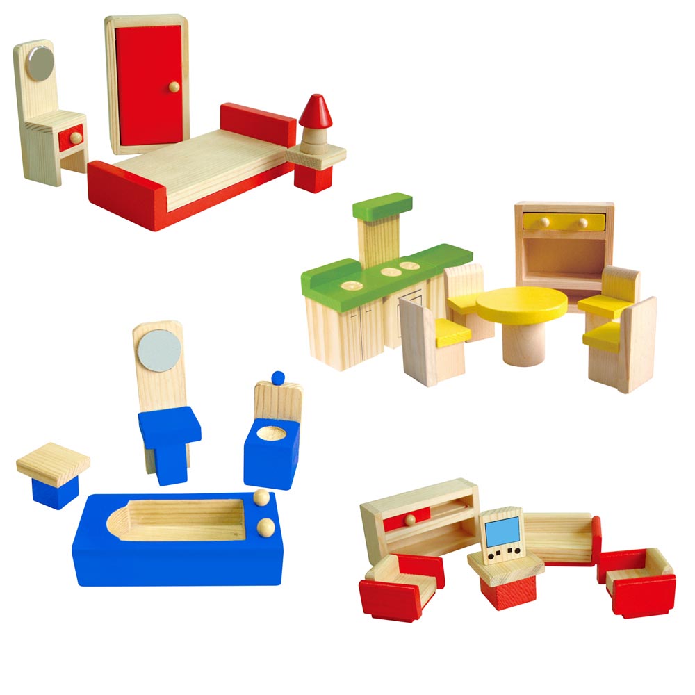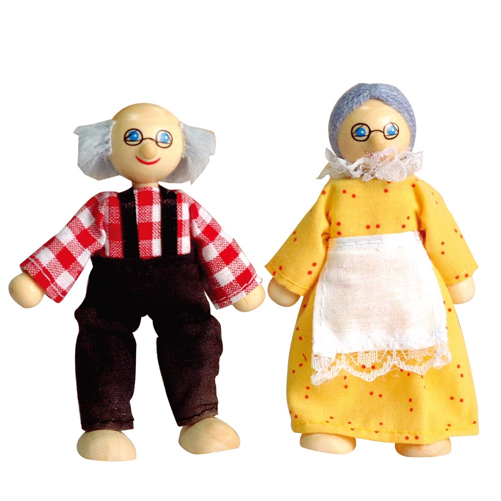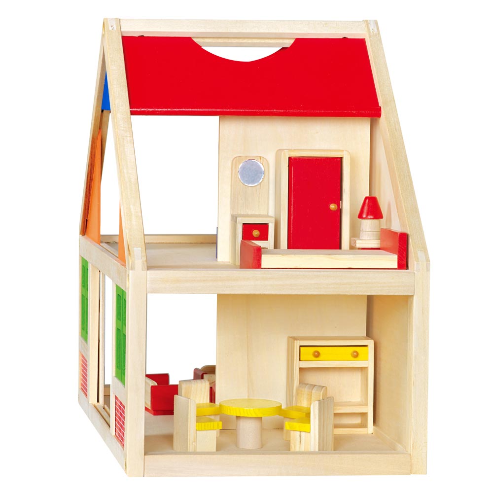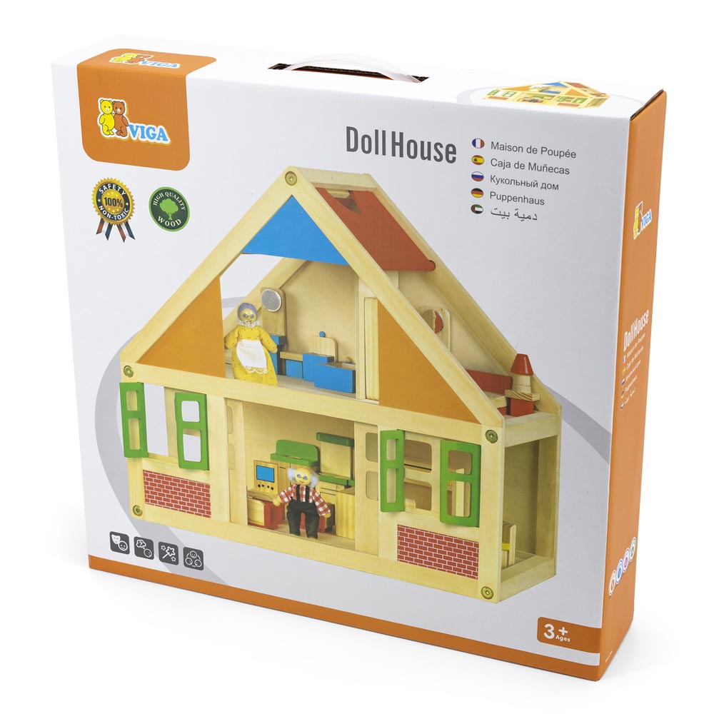 Casa de muñecas construido de madera de gran calidad y pintada a mano con pinturas no toxicas. Las puertas y las ventanas pueden abrirse y cerrarse. Contiene 24 piezas de accesorios de 1 dormitorio (1 cama 12 x 6 cm, 1 velador, 1 lámpara, 1 closet, 1 cómoda), 1 baño (1 lavatorio, 1 tina, 1 wáter, 1 piso), 1 living (1 mueble, 1 sofá 10 x 4 cm, 2 sillones, mesa, tele), 1 cocina (1 lavaplatos-horno 13 x 8 cm, 1 mueble) y 1 comedor (mesa y 4 sillas) y 2 figuras de abuelos con ropas de genero 10 x 4 cm. Fácil de armar.