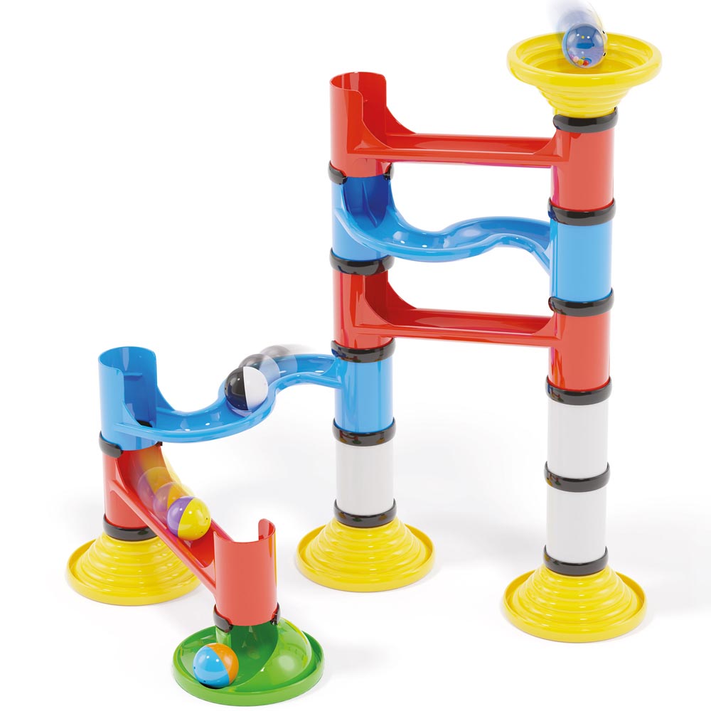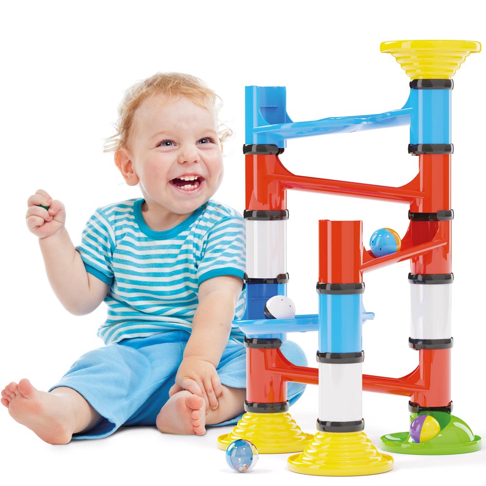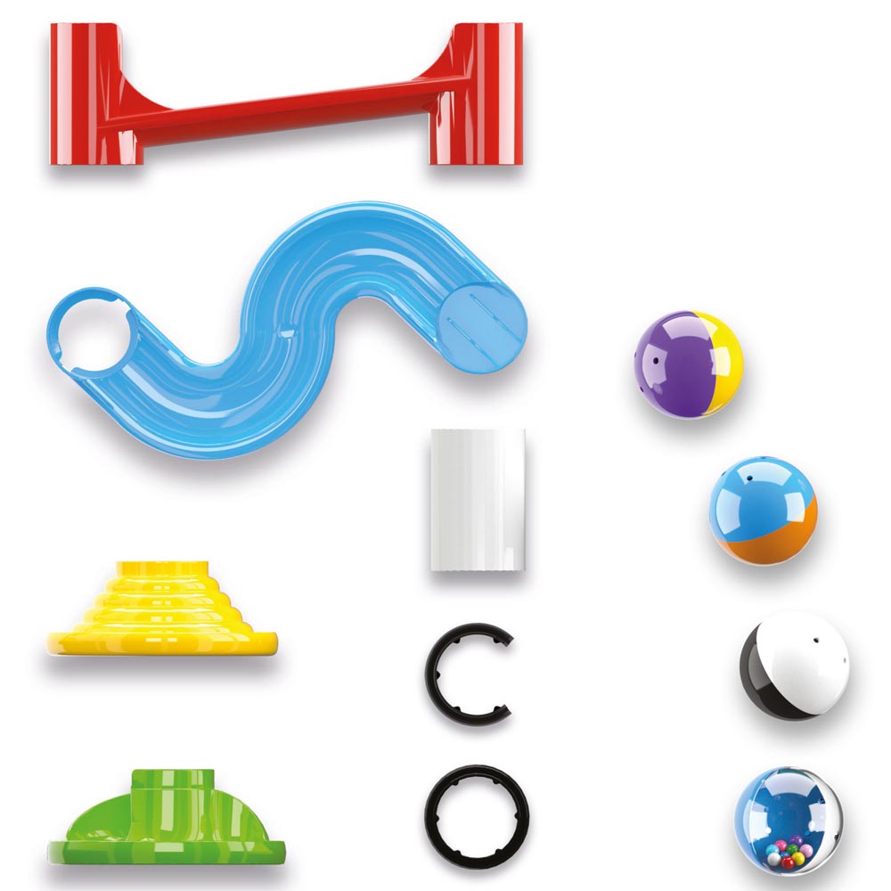 Con Migoga Junior, incluso los más pequeños pueden jugar con una pista de canicas diseñada especialmente para ellos. Las piezas son muy grandes y de diferentes colores para que se reconozcan fácilmente. Las conexiones son fáciles e intuitivas, y se pueden crear múltiples pistas rápidamente. Las canicas tienen 4,5 centímetros de diámetro y algunas producen un sonido metálico. Ruedan por la pista intencionadamente despacio para prolongar la magia y la sorpresa del niño. Los niños también pueden aprender y explorar al mismo tiempo. Con Migoga Junior, los niños tienen garantizadas horas de diversión y un juego completamente seguro. Utilizamos únicamente materiales de alta calidad y cumplimos con todas las normas de seguridad. Jugar con Migoga Junior estimula a los niños a experimentar para encontrar nuevas soluciones, a observar con interés el mundo que les rodea y a probar nuevas ideas mediante el método de ensayo y error. Incluye 4 canicas, 3 pistas blancas rectas, 2 pistas en forma de S, 4 bases de embudo / iniciadores,1 pieza de base para atrapar bolas, 8 anillos, 6 anillos abiertos, 3 columnas. Fabricado en material suave y resistente.