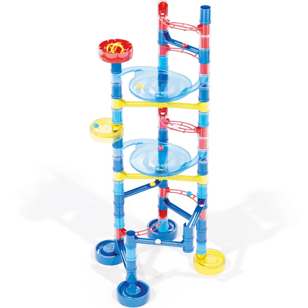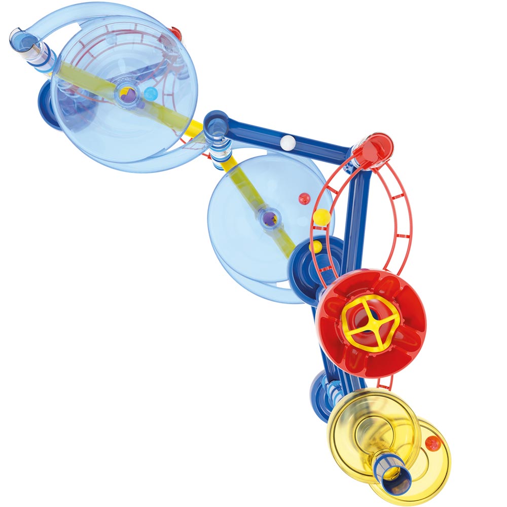 Bolas de colores que despegan al mismo tiempo pero siguen diferentes caminos, a través de corrientes oceánicas, aguas profundas, islas tropicales y mundos submarinos, navegando por vórtices, líneas rectas y curvas, en esta pista de mármol que presenta las formas y colores del océano. Hay un montón de piezas para construir pistas como las de las ilustraciones, o para crear unas completamente nuevas y originales. Los toboganes, puentes, columnas y espirales se pueden unir fácilmente en infinitas combinaciones para un tiempo de juego divertido sin fin. La creatividad y el razonamiento son indispensables para construir pistas bonitas y, lo que es más importante, otras que funcionen. Solo se utilizan materiales de alta calidad, resistentes e inastillables, para garantizar que encajen con precisión y formen una estructura sólida. Incluye: 1 + 1 salida múltiple, 5 pistas rectas cortas, 7 raíles curvos, 50 columnas transparentes y de colores, 2 embudos, 2 interruptores, 5 + 5 bases / caracoles, 2 tapón de caracol eva, 12 canicas de colores.