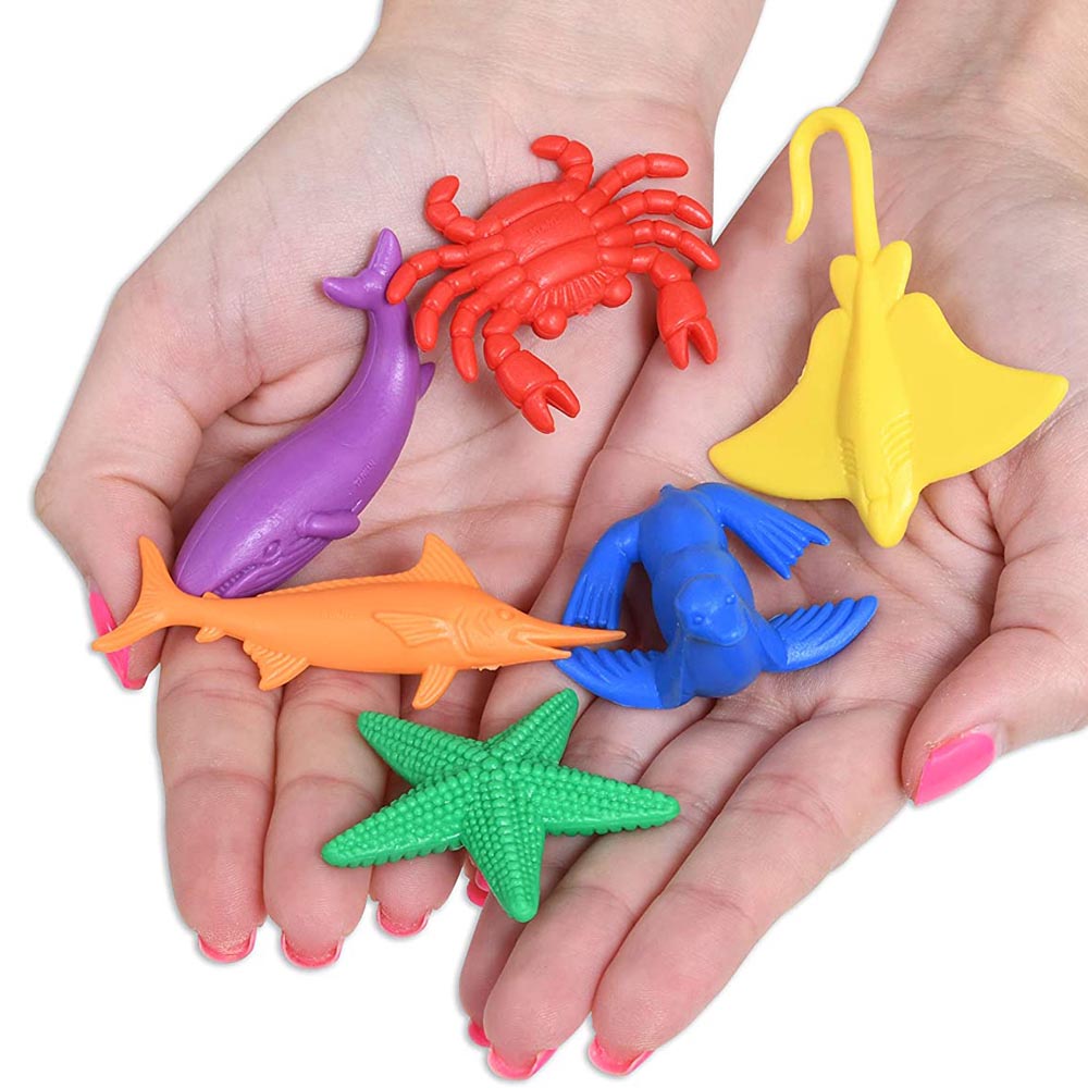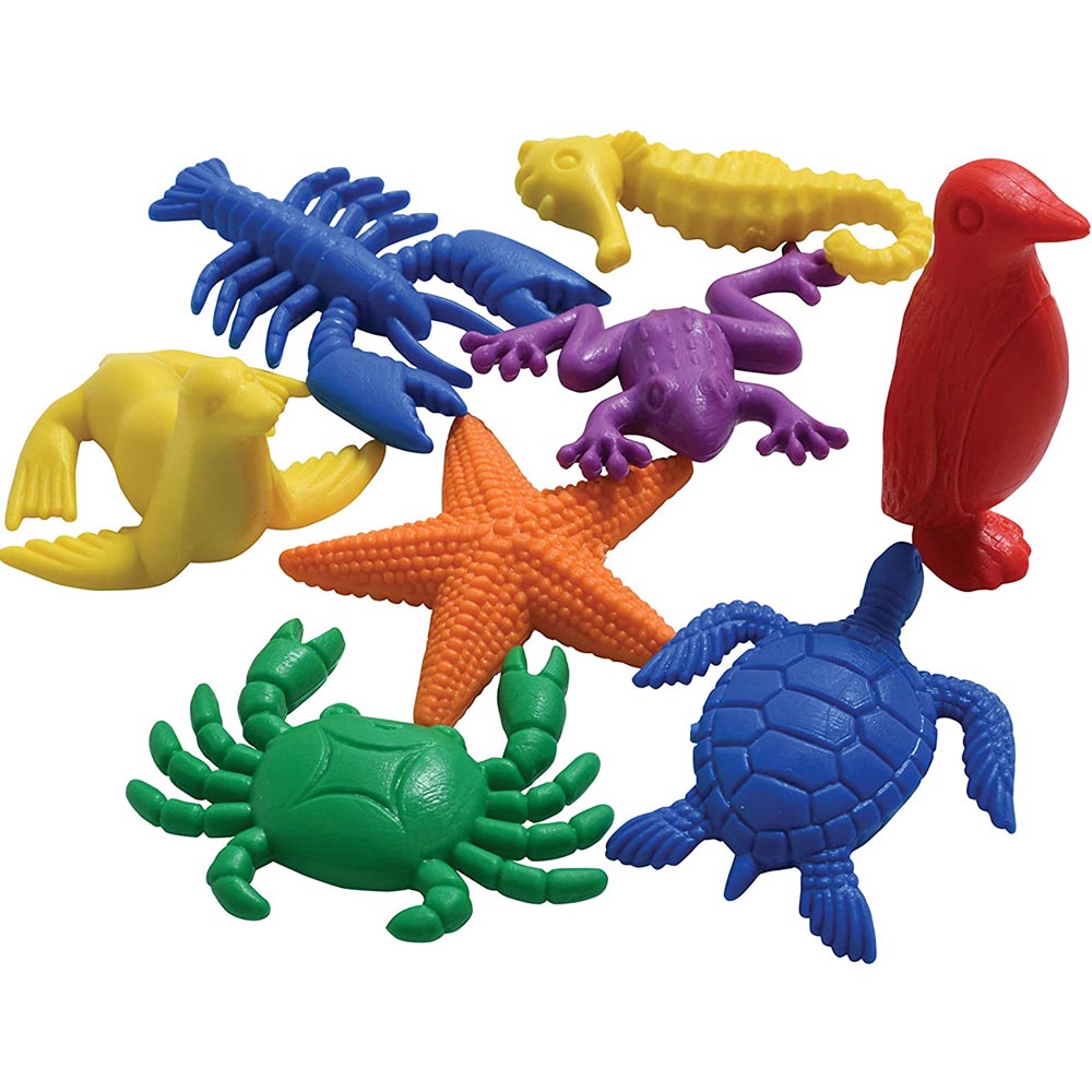 84 animales acuáticos de goma de 14 tipos diferentes (manta raya, sapo, cangrejo, estrella, pez espada, tiburón, pulpo, caballo de mar, tortuga, pingüino, foca, camarón, delfín y ballena) y en 6 colores distintos (amarillo, rojo, verde, azul, naranjo, morado). Ideales para desarrollar habilidades matemáticas. Excelente calidad. En envase plástico. 5 cm aprox. manta raya.