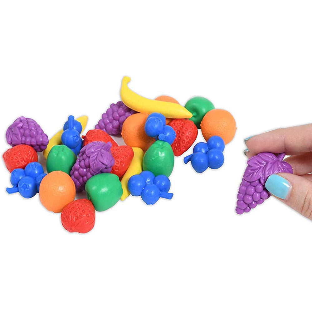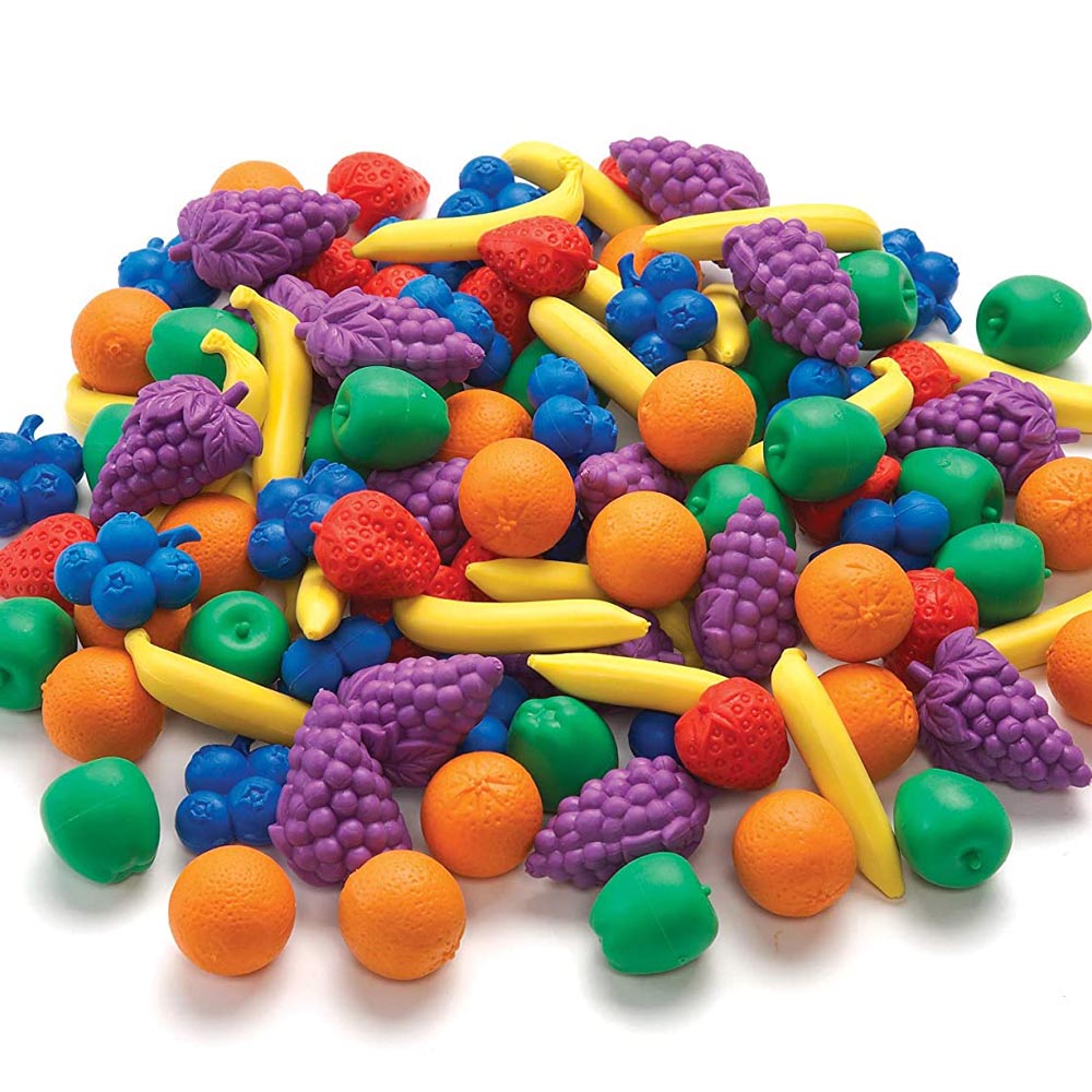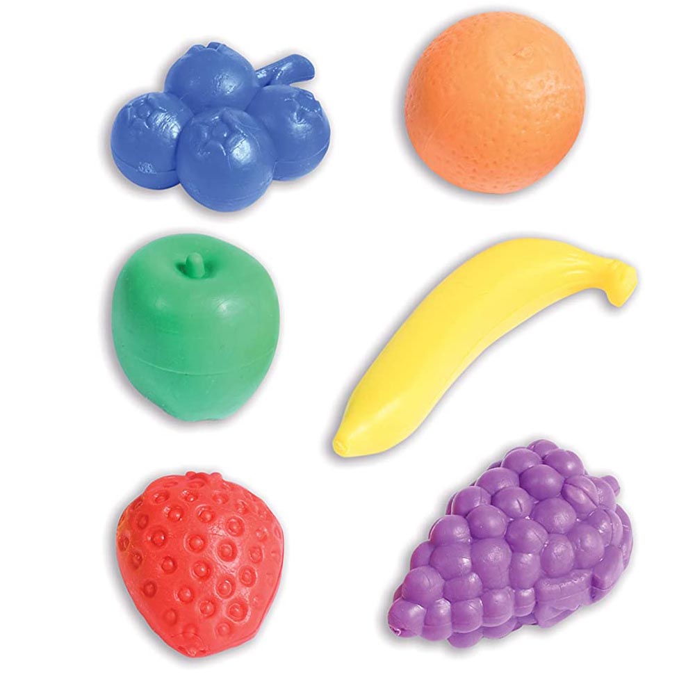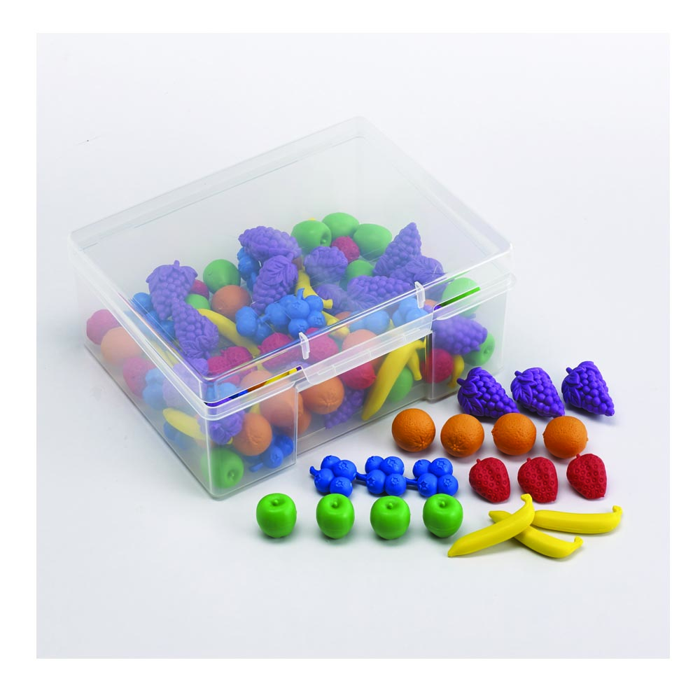 Tonel con 108 frutas, plátanos, moras, frutillas, uvas y manzanas. Cada fruta tiene su color y tamaño correspondiente. Para aprender a clasificar, contar e identificar colores y formas.