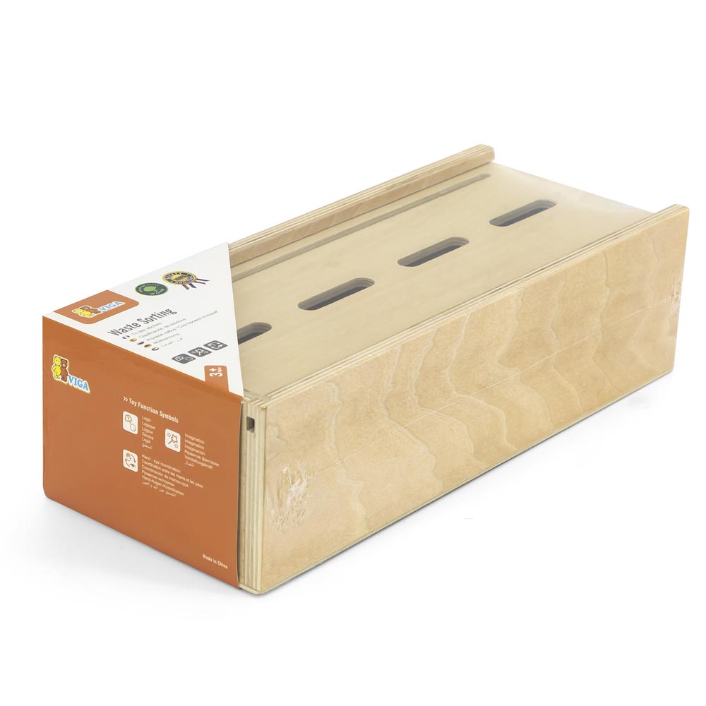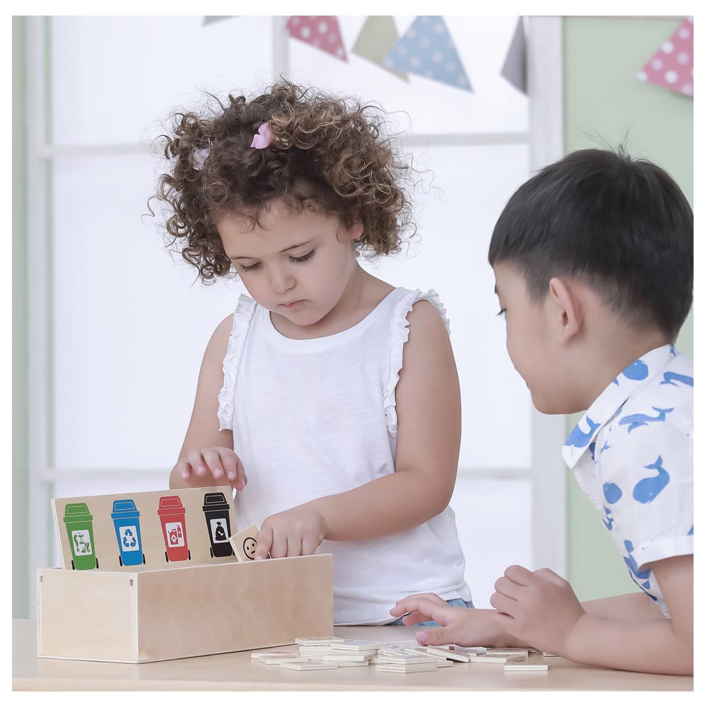 Divertido juego para enseñar a los más pequeños y las más pequeñas a clasificar los desechos. Ayuda a desarrollar la capacidad de diferenciación y clasificación por colores y otros conceptos. Además de educar a los más pequeños en el cuidado del medio ambiente y el reciclaje. Contiene una caja con tapas con 4 agujeros y soporte para una tarjeta de 28 x 6 cm con los 4 contenedores de colores, 50 fichas cuadradas de madera (5 x 5 cm aprox) que combinan con los contenedores de basura, 2 dados con puntos de colores para diferentes formas de jugar e instrucciones. Se puede jugar con 1 jugador o en equipo.