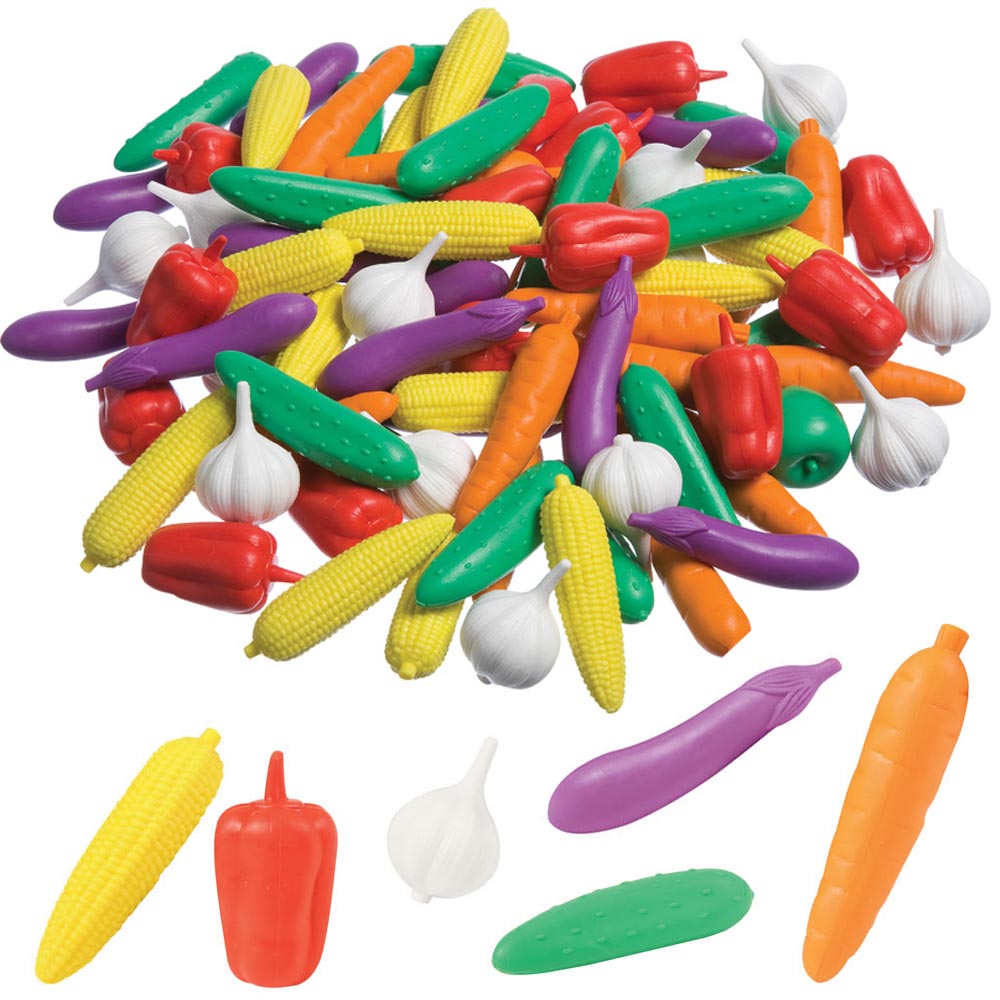 144 vegetales de goma de 6 tipos diferentes (choclo, zanahoria, pimentón, berenjena, ajo y pepino) en 6 colores distintos (amarillo, naranjo, rojo, blanco, morado y verde). Ideales para desarrollar habilidades matemáticas. Excelente calidad. En envase plástico. 5 cm aprox. el choclo.