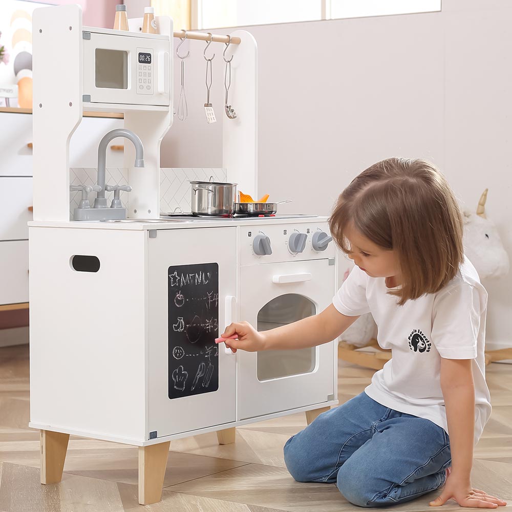 Esta divertida cocina incluye horno, cocina, microondas, pileta y mesón. todo lo que los niños y niñas necesitan para aprender a hacer todas las actividades de la cocina. y para hacerla aún más divertida contiene una pizarra negra en la puerta del horno para que puedan hacer entretenidos dibujos. con sonidos y luz esta cocina es muy realista, funciona con baterías. incluye accesorios de metal y madera.