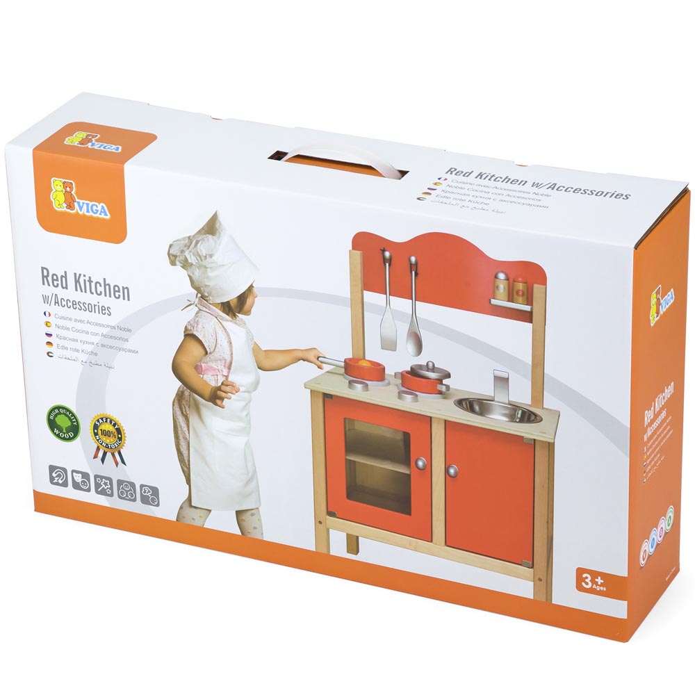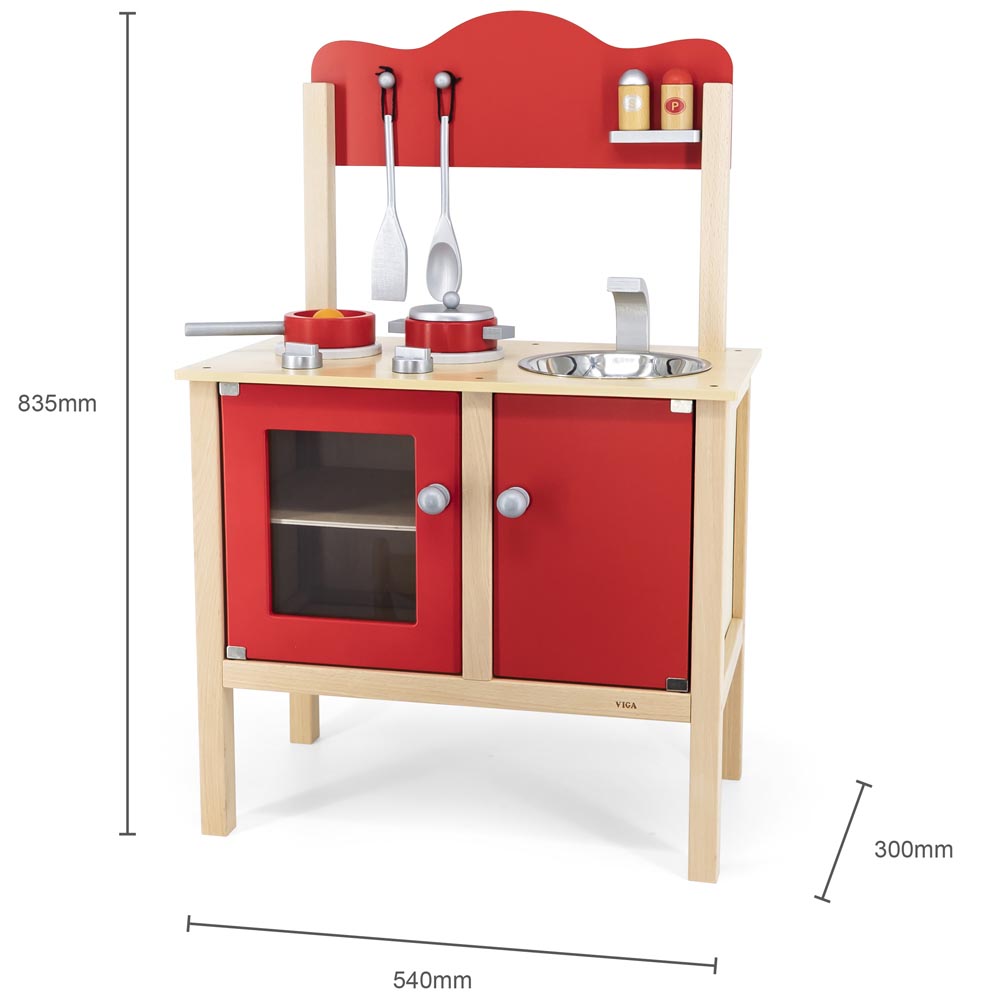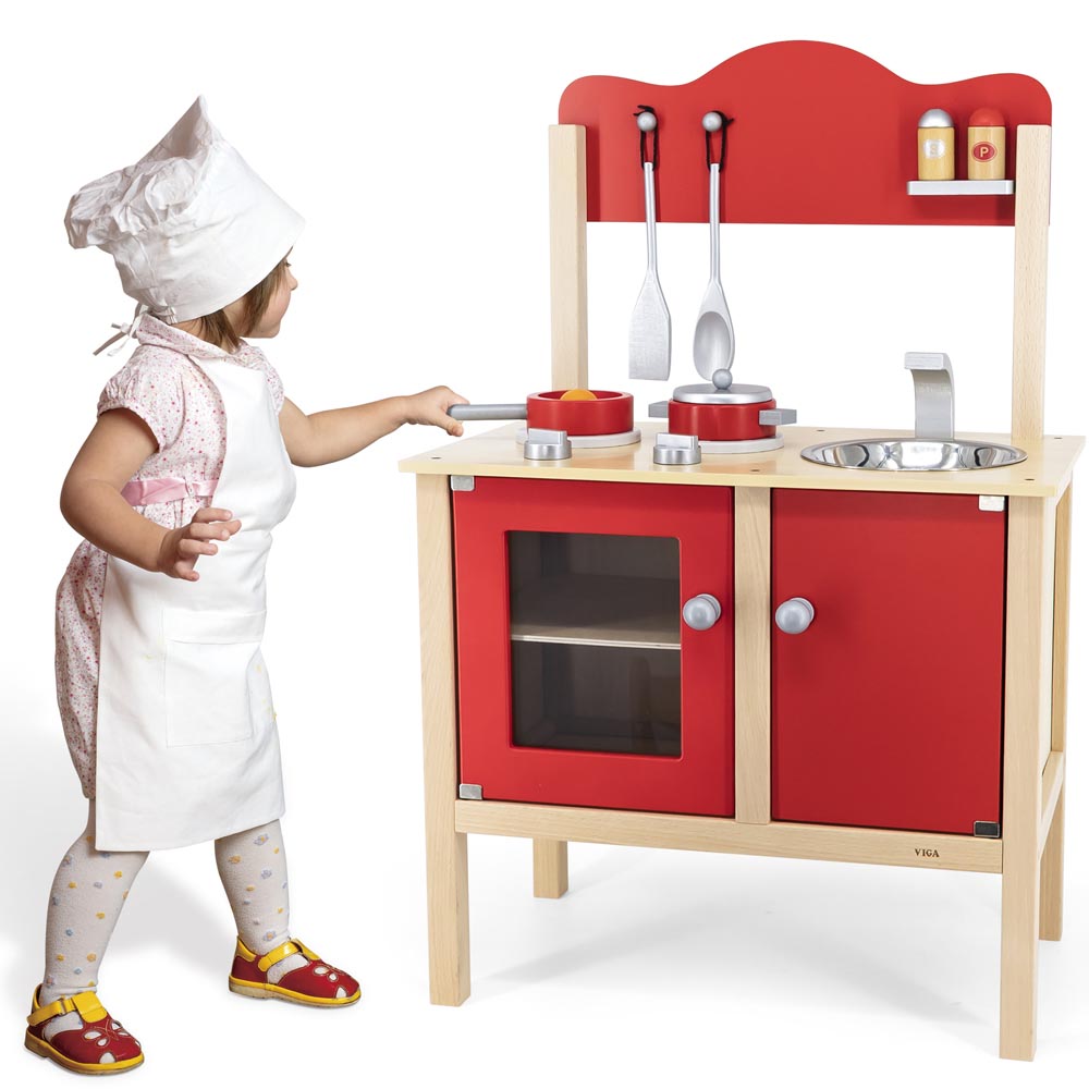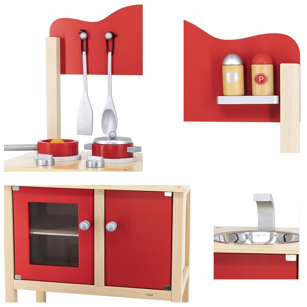Cocina roja con accesorios. Completa cocina con lavadero y mueble para guardar. Incluye 2 cucharas, olla, sartén, huevo y saleros. De gran calidad y diseño.