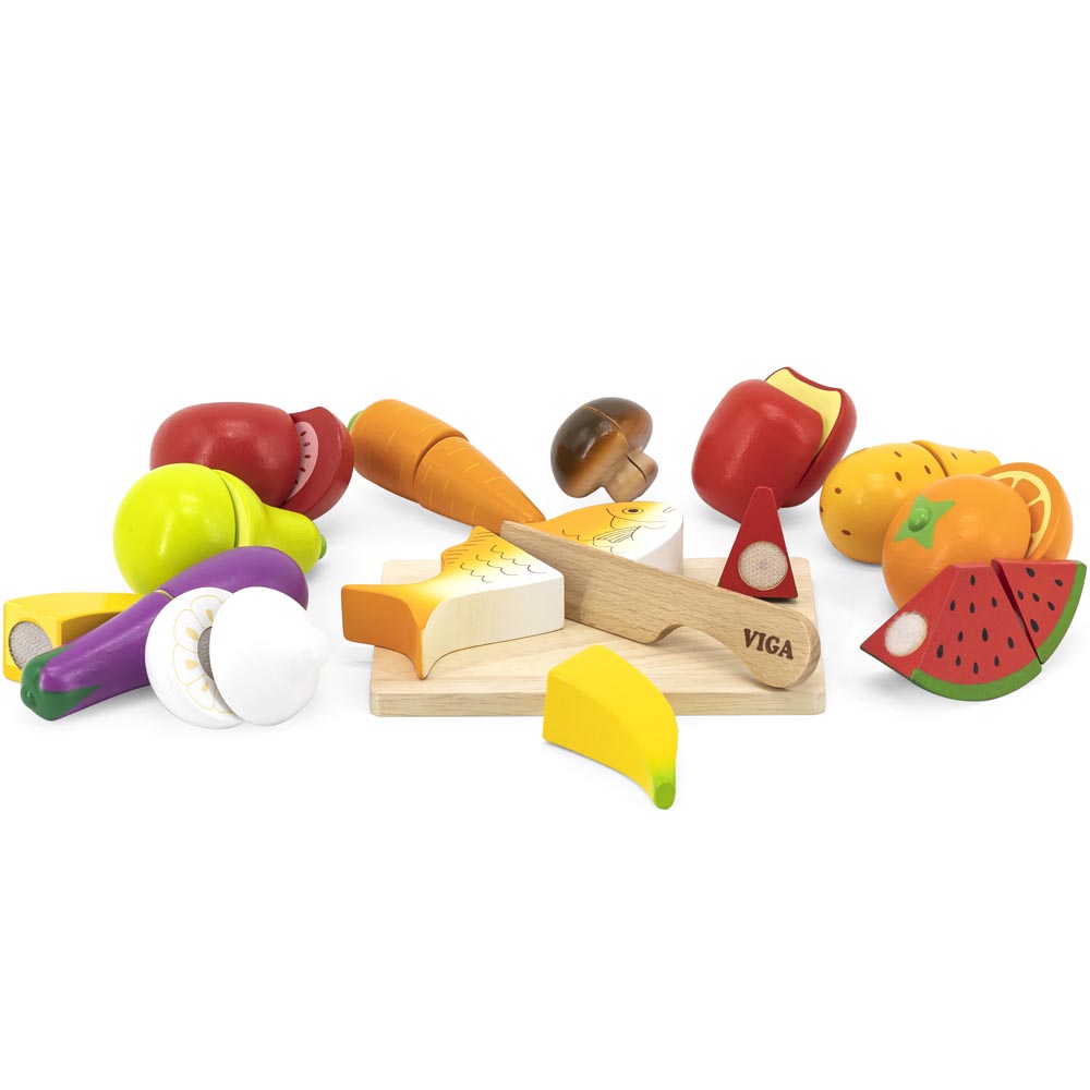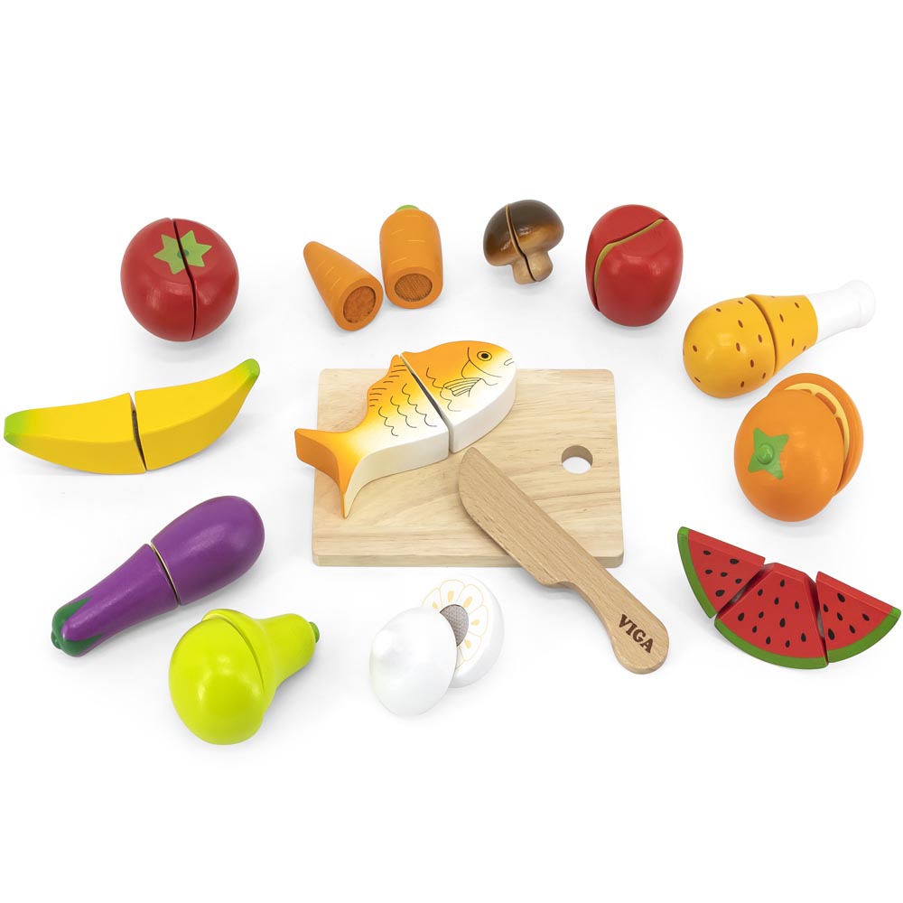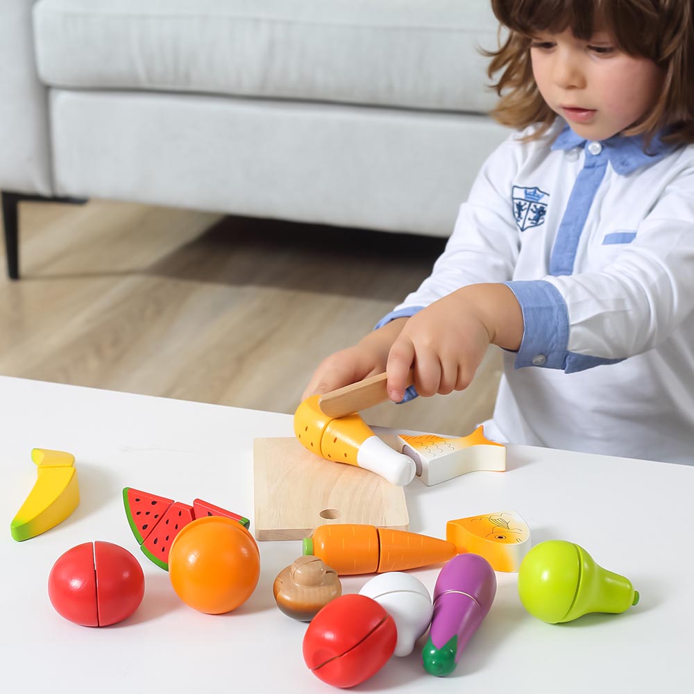 Divertido set de alimentos para cortar de material suave y resistente y colores vivos que resultará muy atractivo para los más pequeños. Un divertido accesorio para juegos de rol en los cuales los niños y niñas desarrollan habilidades sociales, ponen en juego su creatividad e imaginación, estimulando a su vez el uso del lenguaje y el reconocimiento de nuevos alimentos y vocabulario. Al cortar los diferentes alimentos los niños y niñas desarrollan las habilidades motoras necesarias para comenzar a hacerlo también en sus comidas cotidianas.