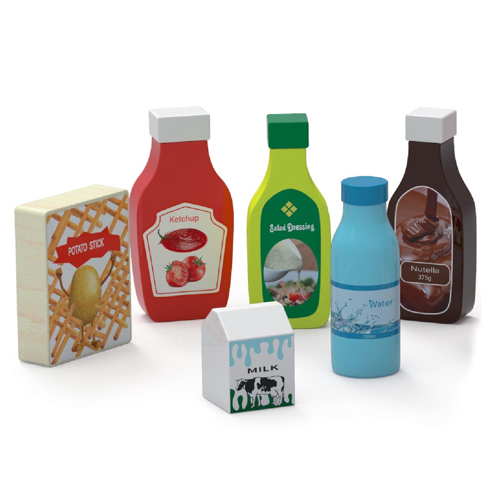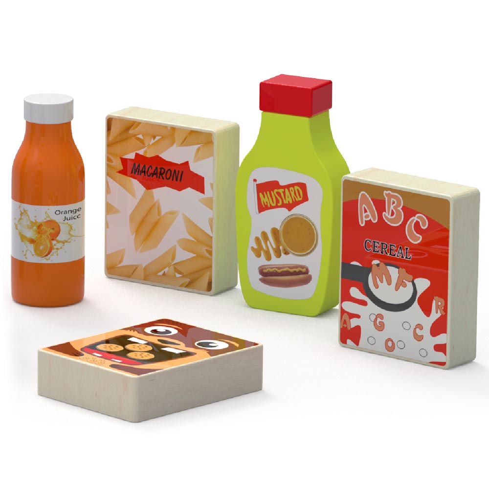 Alimentos y envases hechos de madera de caucho natural y libre de químicos. contiene 12 envases de alimentos y bebidas que estimulara la imaginación y el pensamiento critico, así como mejorara las habilidades sociales. 1 botella agua (14 cm), 1 botella jugo, 1 botella bebida cola, 1 frasco nutella, 1 frasco aliño, 1 frasco kétchup, 1 frasco mostaza, 1 caja cereal, 1 caja fideos, 1 caja papas fritas, 1 caja leche (5 x 5 x 6,9 cm), 1 caja galletas (3 x 11,6 x 9,1 cm).