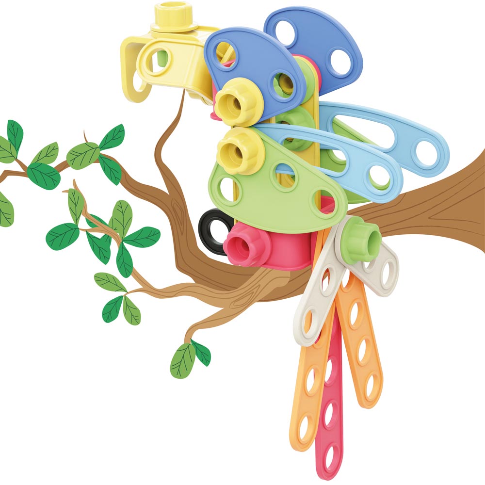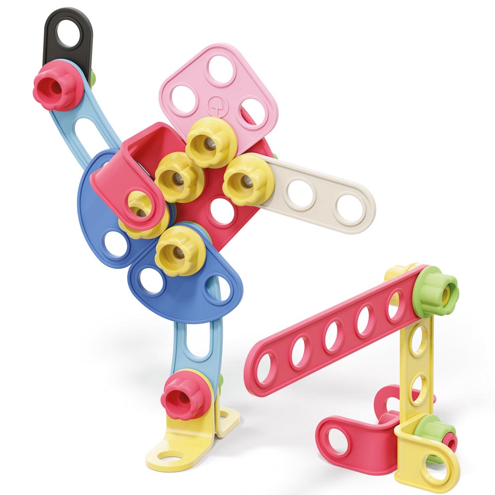 Un juego de construcción con tornillos y pernos que estimula la imaginación. No se necesitan herramientas y se desarrollan principalmente las habilidades manuales. Incluye 10 tornillos, 10 tuercas, 4 arandelas, 2 bujes, 2 ruedas, 24 listones y formas perforadas. Fabricado en material suave y resistente.