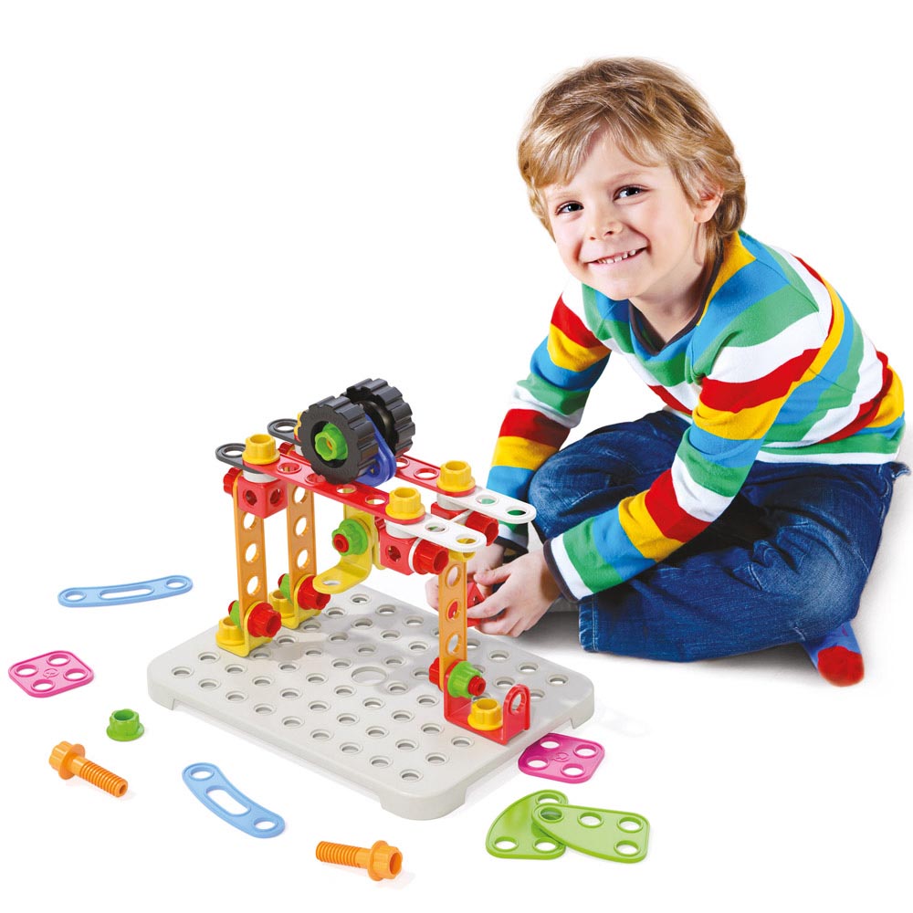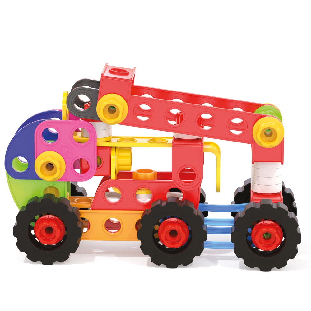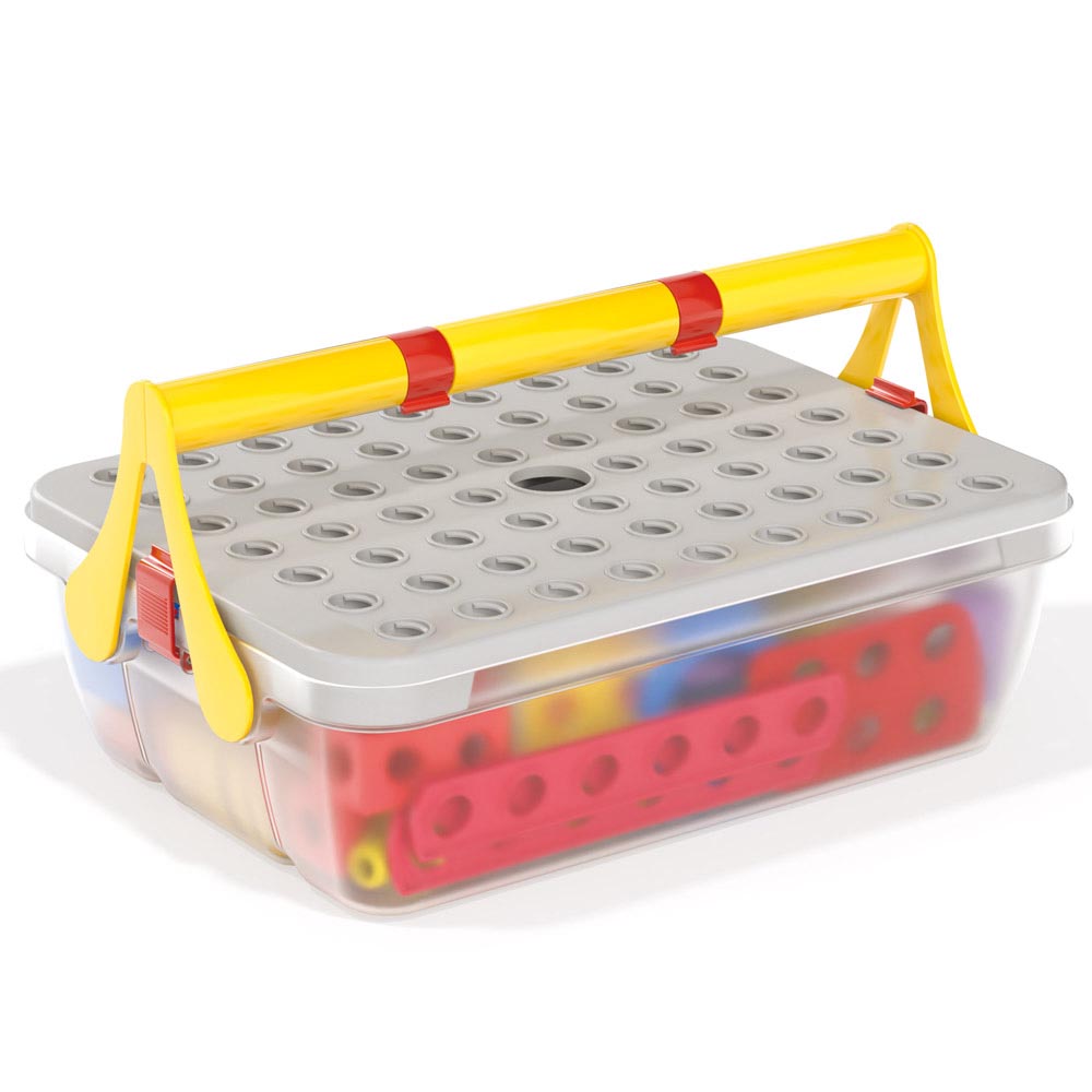 Tecno jumbo toolbox tiene todo lo que un niño necesita para construir un mundo de camiones, excavadoras, grúas o cualquier otra cosa que se le ocurra. Tornillos, pernos, tuercas de mariposa, ruedas y placas perforadas, fabricados en plástico resistente irrompible, se pueden ensamblar sin herramientas especiales. Todo lo que necesita un niño es un par de manos y mucha imaginación. Cuando termina el tiempo de juego, todo vuelve a encajar en la práctica caja de herramientas. La caja tiene un asa y una tapa que se puede utilizar como base para jugar. Este juguete de construcción estimula la coordinación, así como la lógica y la creatividad, ayudando a los niños a comprender los principios básicos de la mecánica mientras se divierten. Incluye: 24 elementos roscados bidimensionales, 14 elementos roscados tridimensionales, 46 tornillos, pernos y arandelas, 1 caja de almacenamiento con asas, 1 álbum con 5 ejemplos.