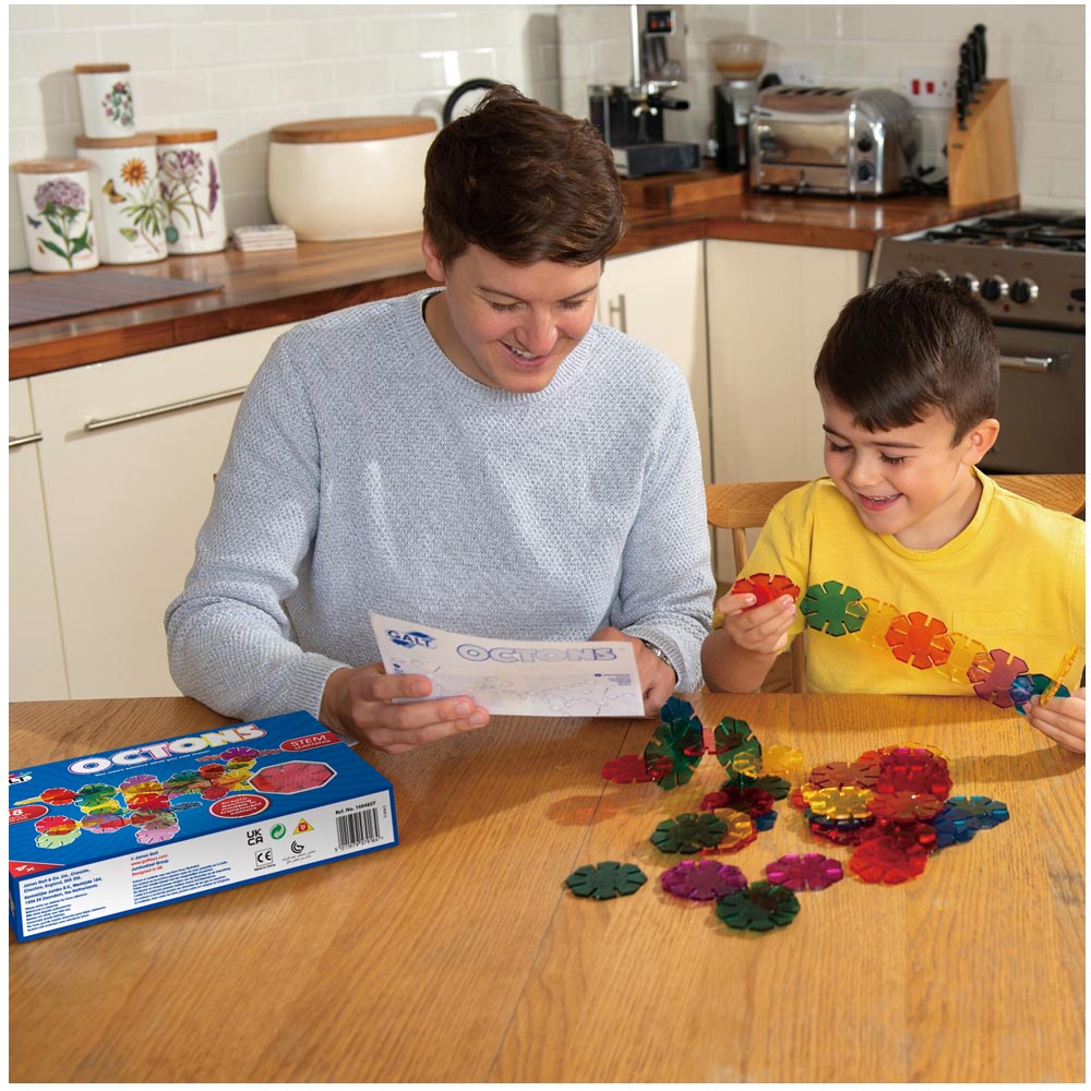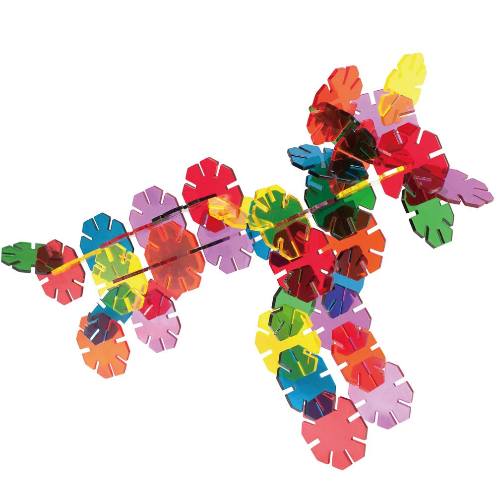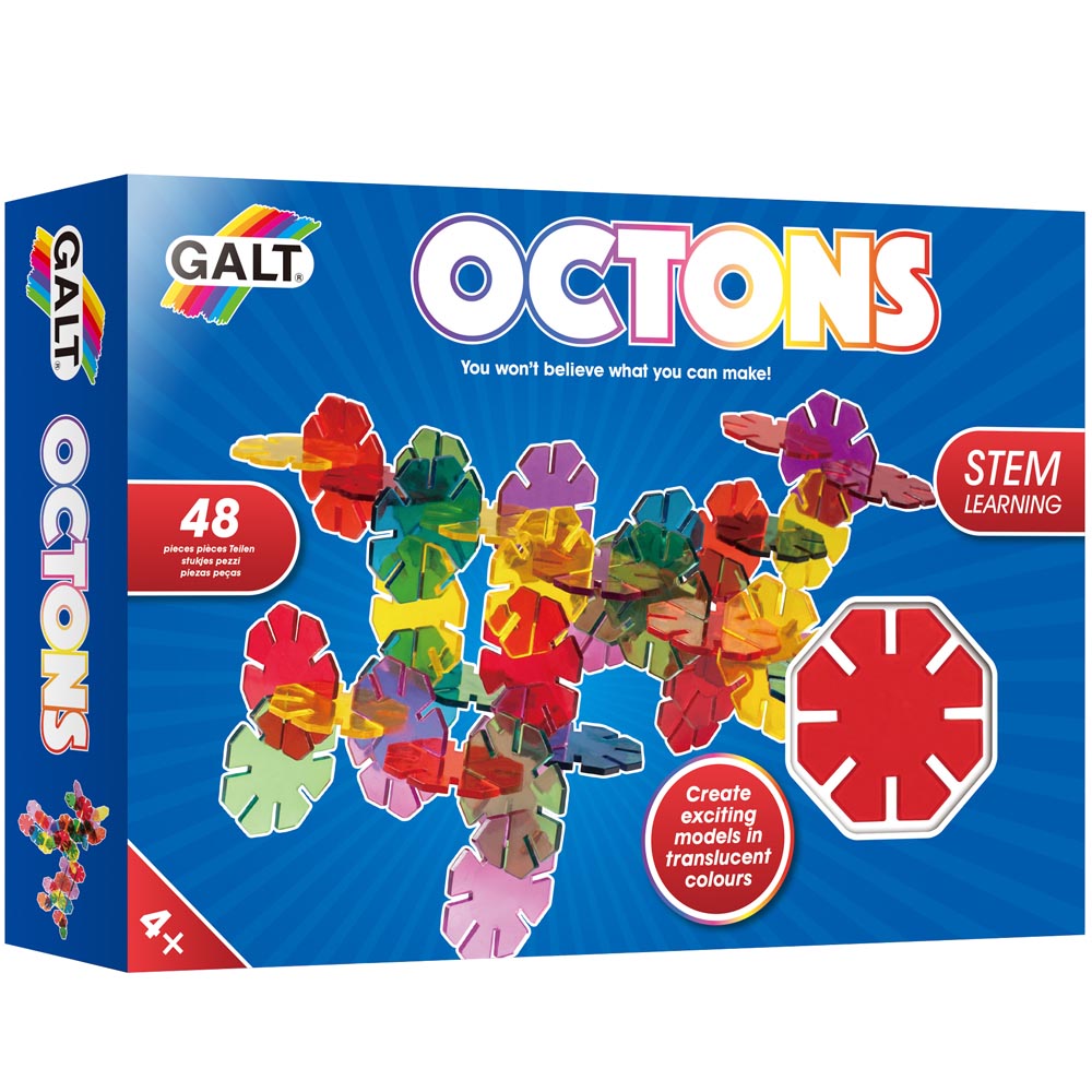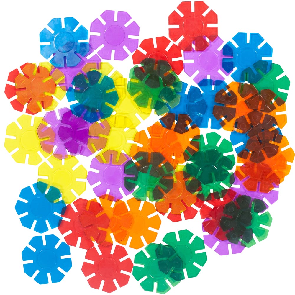 Hermoso juego para construir. Octógonos traslucidos combinados con 4 formas de conexión. Hay mas oportunidades de diseño. Contiene 48 pz de plástico encajables y guía con ejemplos ilustrados.