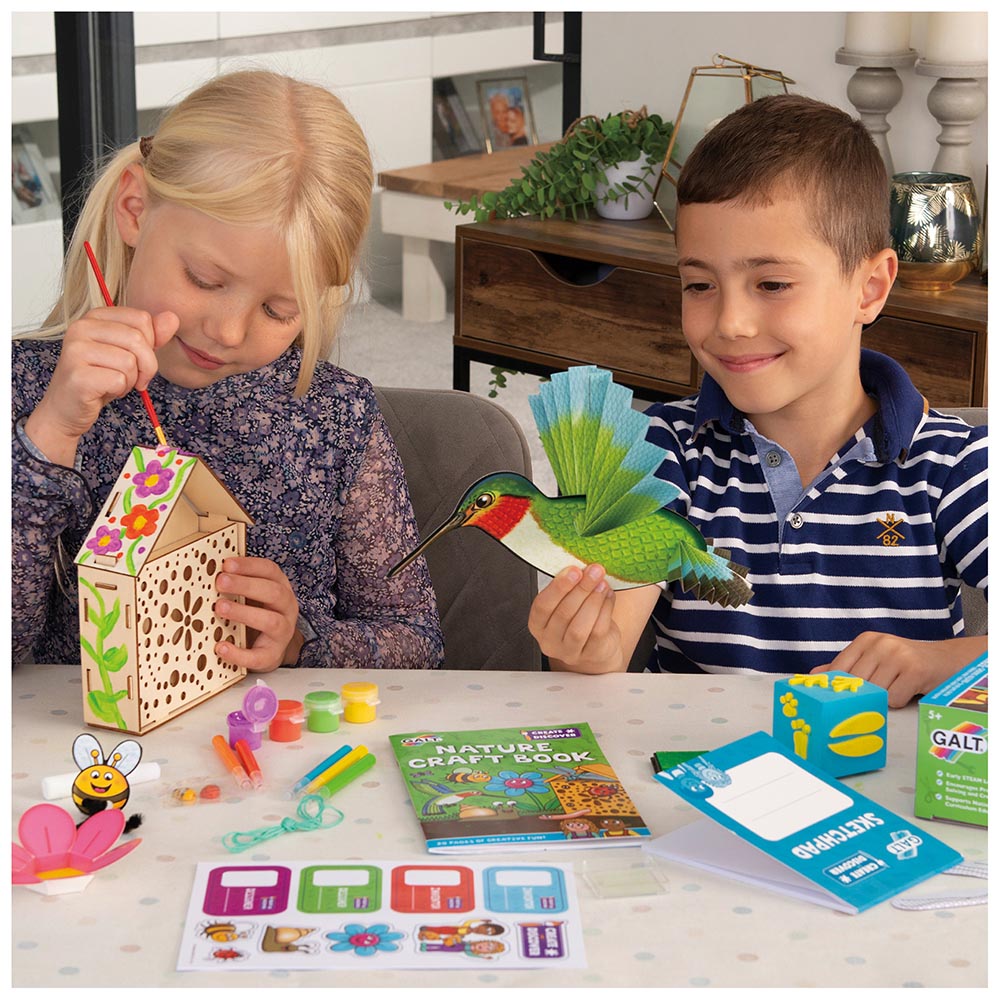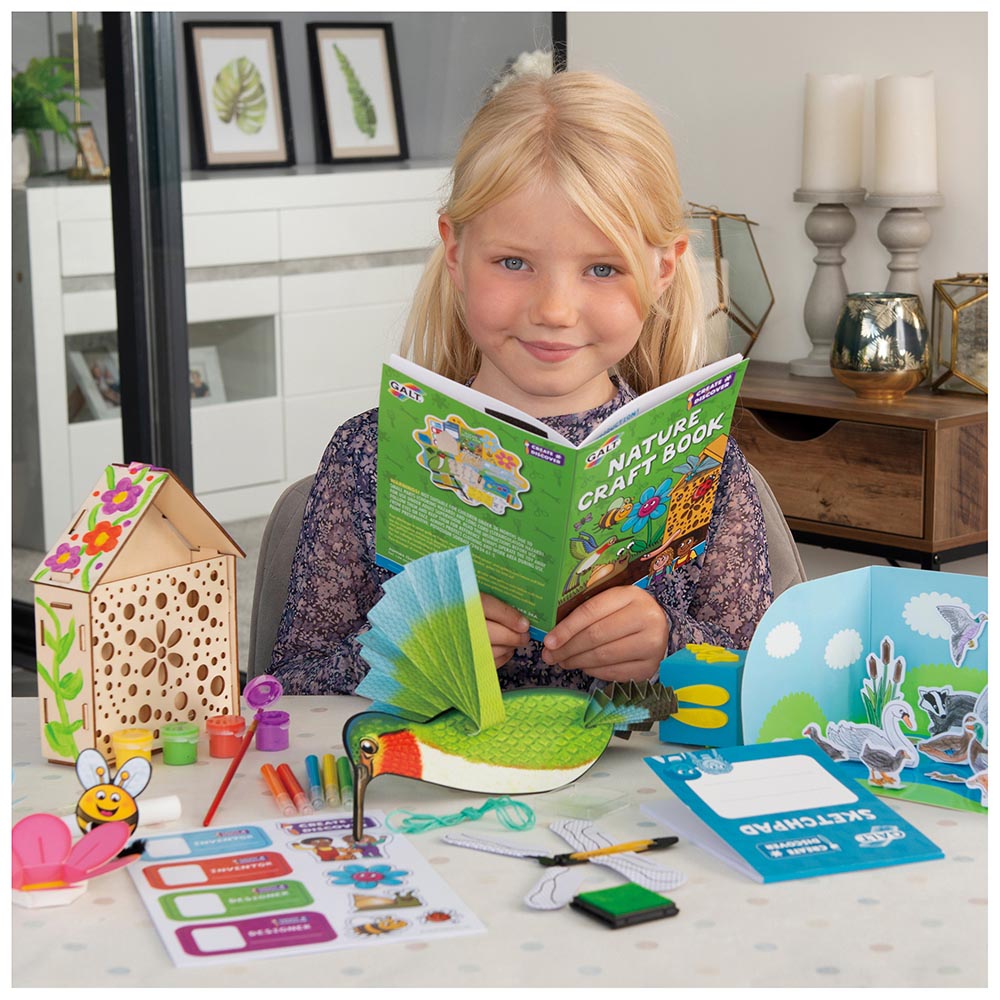 Entretenido kit de manualidades salvajes para niños que fomenta el pensamiento temprano y el creativo. Incluye un libro de 20 proyectos a todo color con 6 actividades emocionantes. Aprenda mas sobre la naturaleza mientras crea una libélula voladora, estampa huellas y construye una casa para insectos. Crea un hábitat de estanque en 3D, un modelo de colibrí colgante y aprenda como las abejas polinizan las flores.