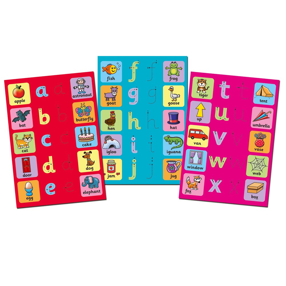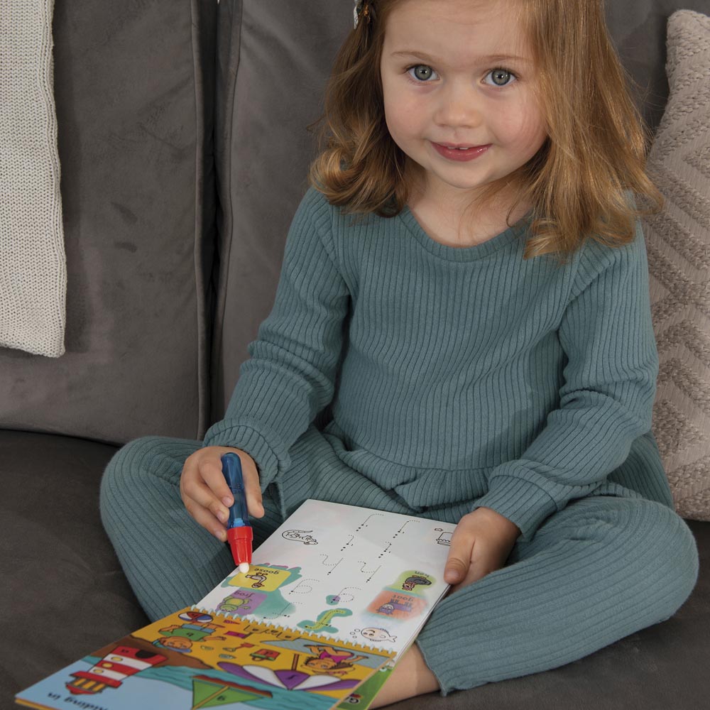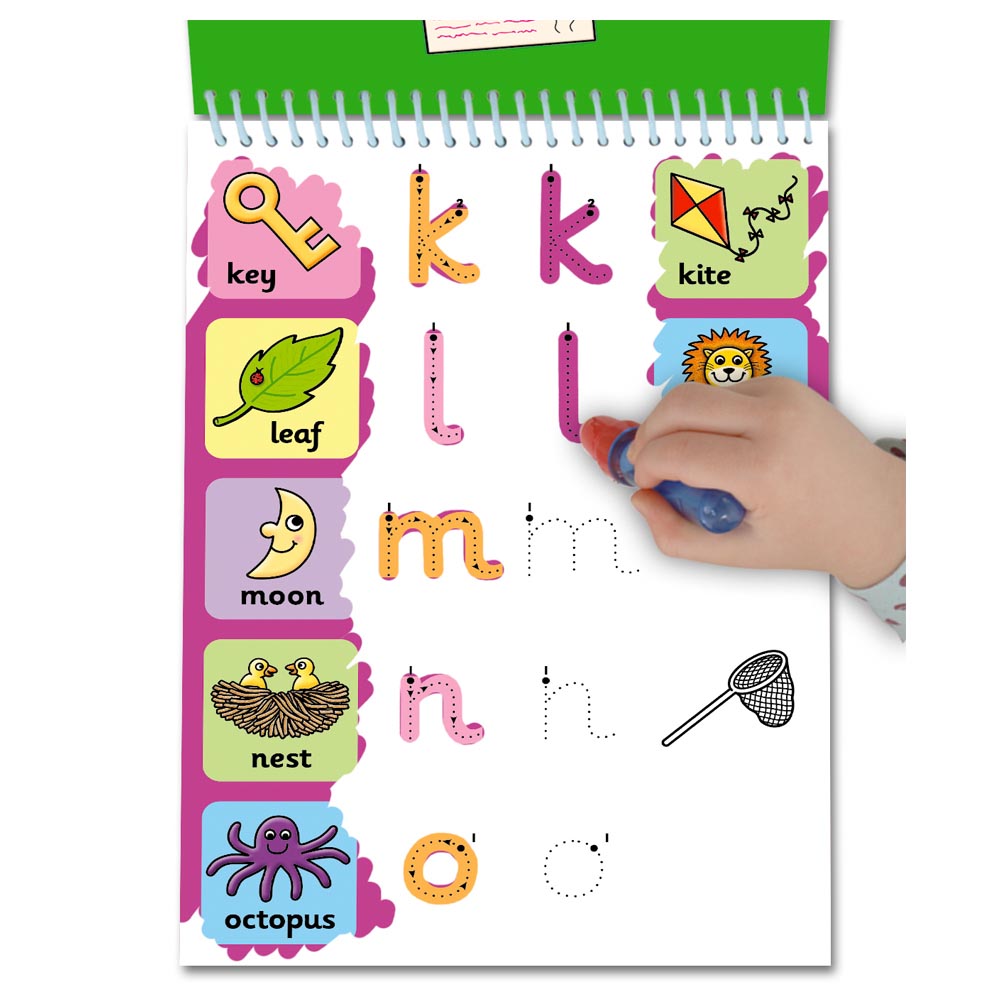 Divertida forma de desarrollar habilidades de escritura y aprender el alfabeto con 6 tablas reutilizables. Use el lápiz de agua para formar las letras del alfabeto siguiendo las líneas de los puntos y vea aparecer las letras de colores. Luego revela 2 imágenes con palabras que empiezan con la letra. Las letras, imágenes y palabras aparecerán y luego desaparecerán una y otra vez.