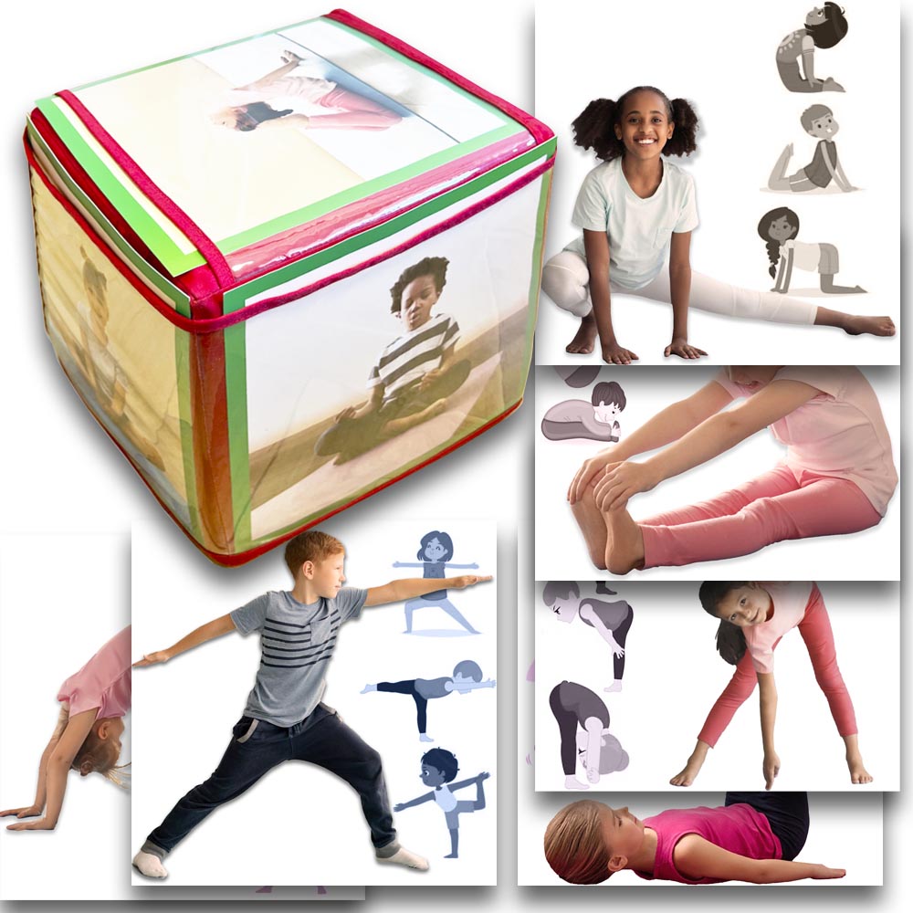 Cubo de espuma con bolsillo en cada una de sus caras, que permite ubicar tarjetas impresas con imágenes para realizar 12 posturas de yoga. Materialidad: cubo relleno de espuma y bolsillos transparentes plásticos. Tamaño cubo: 30 x 30 x 30 cm; tarjetas: 17,5 x 17,5 cm. Colores surtidos.