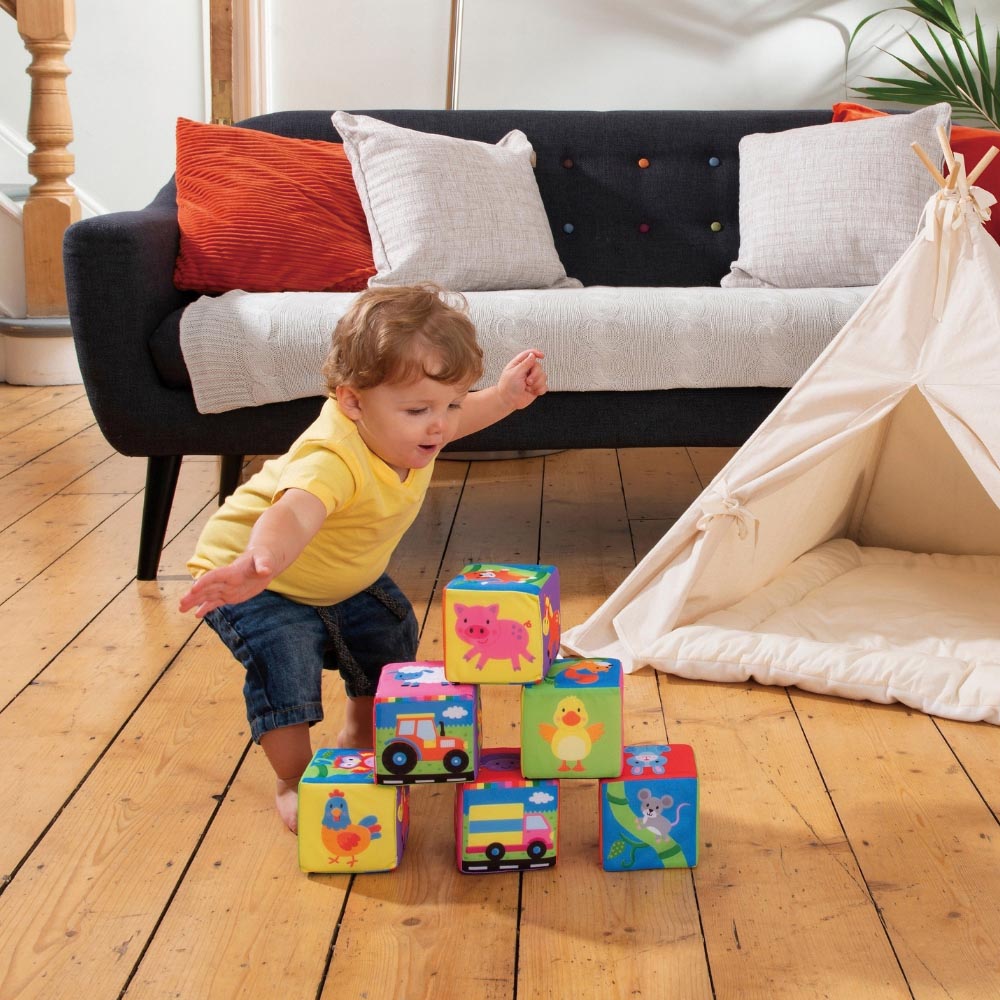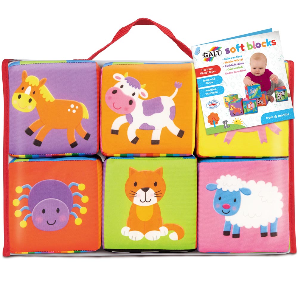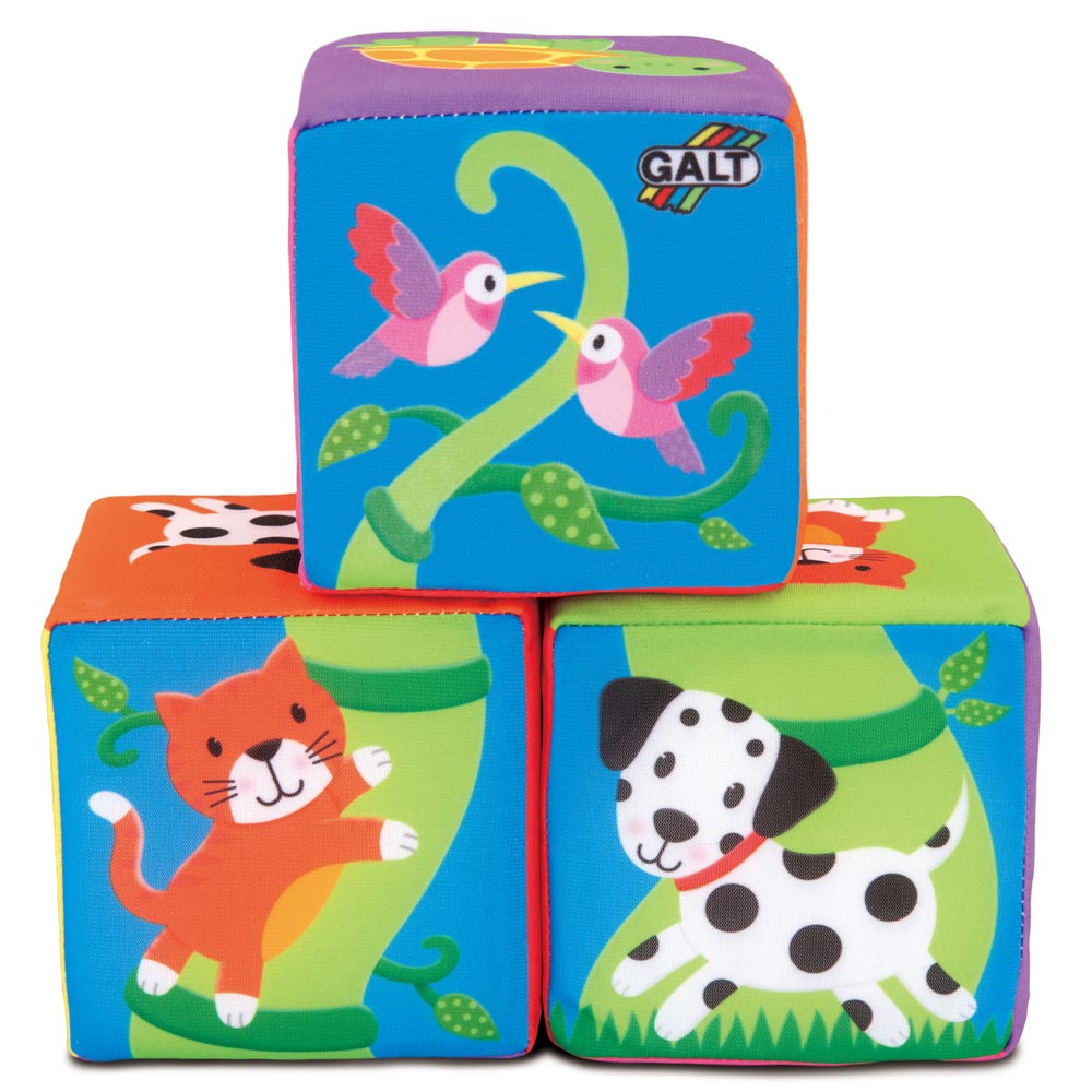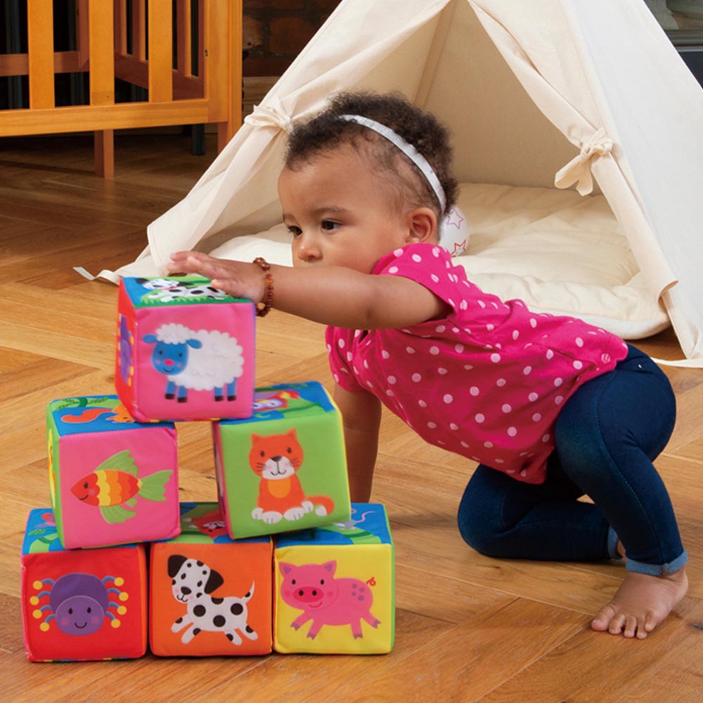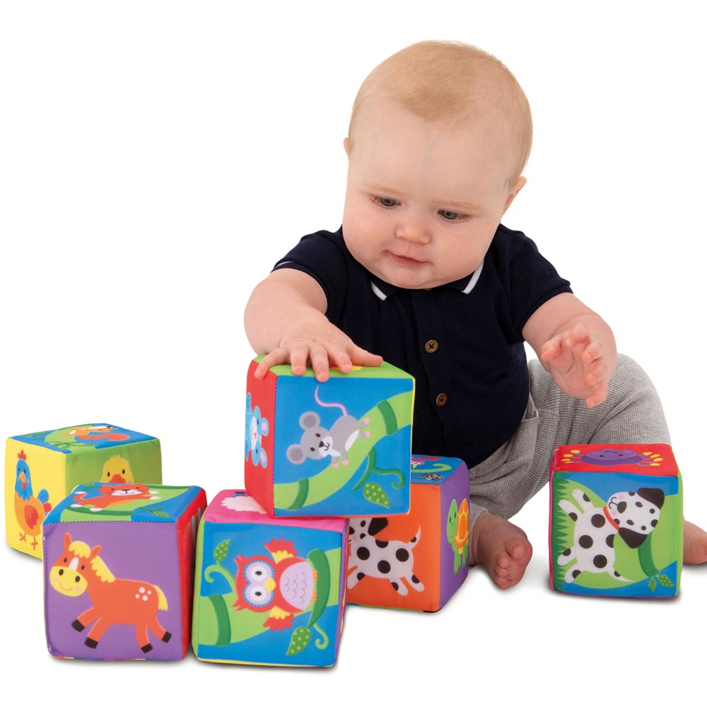 6 cubos de genero rellenos de espuma con imágenes de animales coloridos. Suave y seguro, ideal para apretar, tirar y construir. Lavable a maquina.