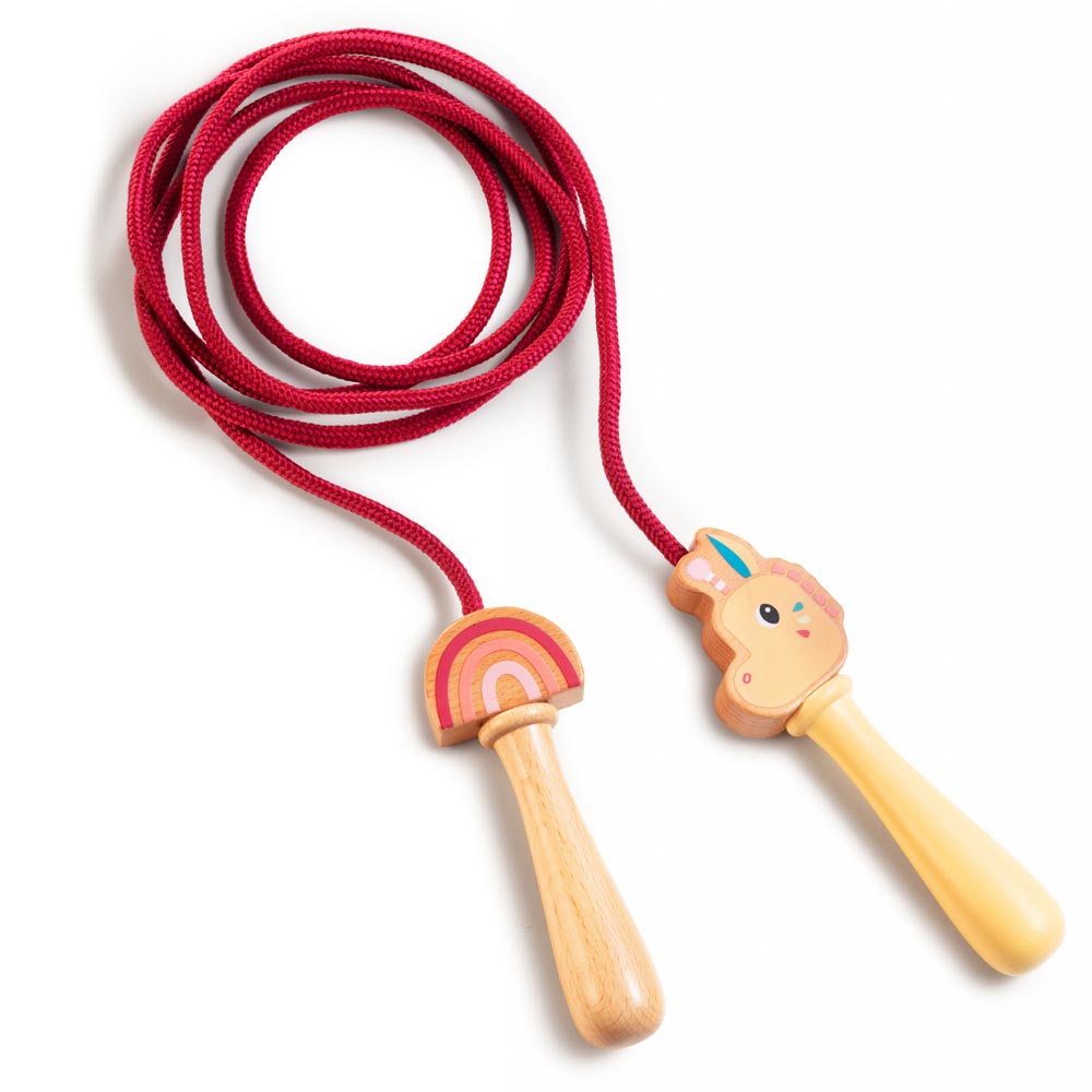 Hermosa cuerda de saltar con los divertidos diseños de Lilliputiens. Mangos de madera. Realizado en material suave y resistente.