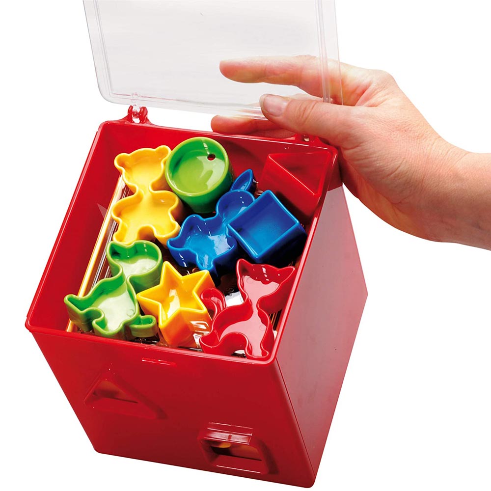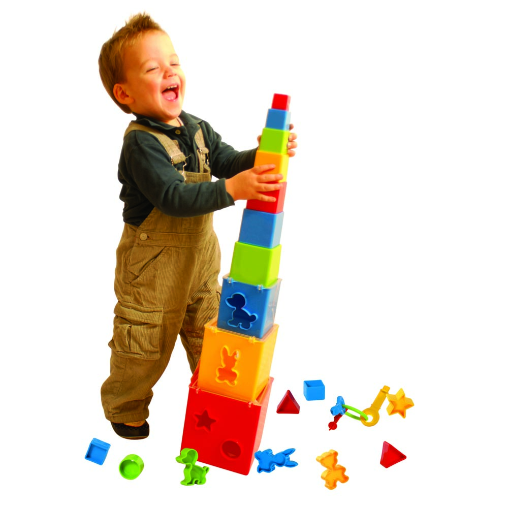 Juego apilable y de encaje de 10 cajas cuadradas. Las cajas más grandes tienen tapa transparente y llave, y presentan figuras para encajar. Además, incluye 7 cajas más pequeñas de colores que se encajan y apilan. El juego contiene 4 formas para encajar, 4 figuras de animales para encajar y 3 llaves. La caja grande mide 14 x 14 x 15 cm, mientras que la caja más pequeña mide 2,5 x 2,5 x 2,8 cm. La forma de encaje circular tiene un diámetro de 4 cm y una altura de 2,5 cm. La figura de encaje, un conejo, mide 7 x 4 x 2,5 cm. La presentación del juguete es una caja dentro de otra.