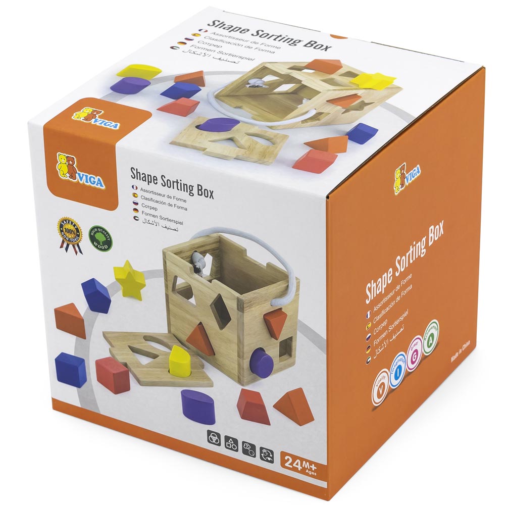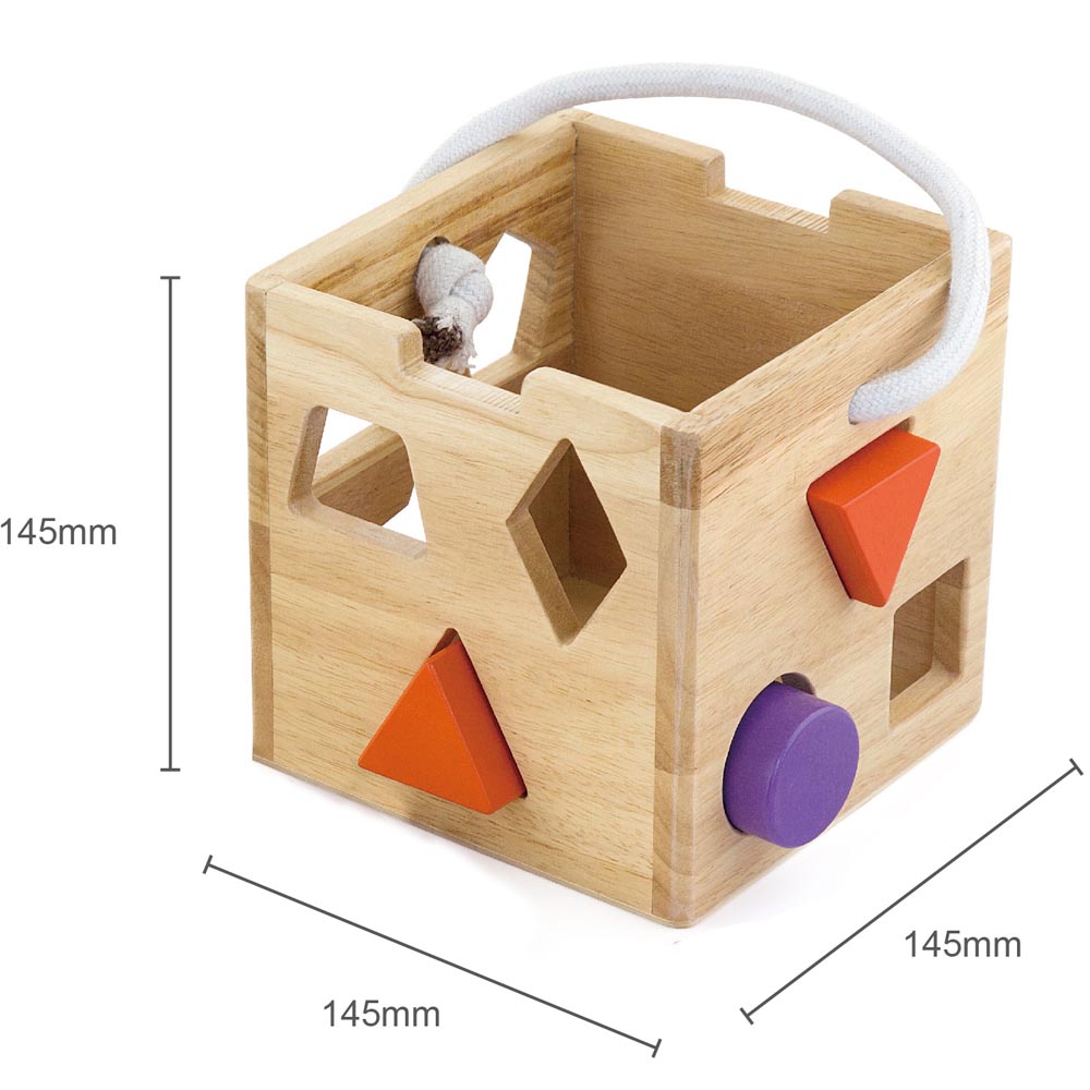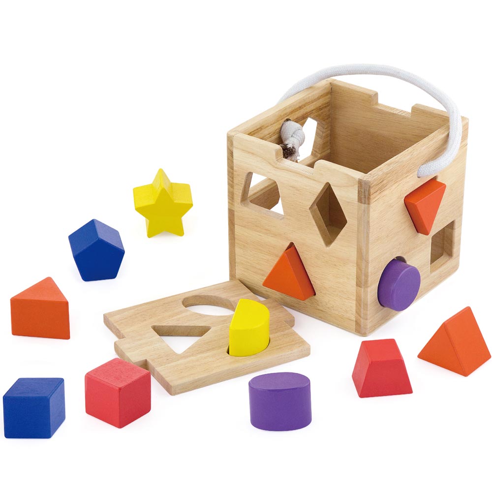 Caja cubo (14,5 x 14,5 cm) de madera natural con tapa y mango para transportar y encajar y clasificar 12 formas multicolores y voluminosas, 4 triángulos (4,5 cm), 1 circulo, 1 ovalo, 1 cuadrado, 1 pentágono, 1 estrella, 1 trapecio y 1 semi circulo y 1 losango.