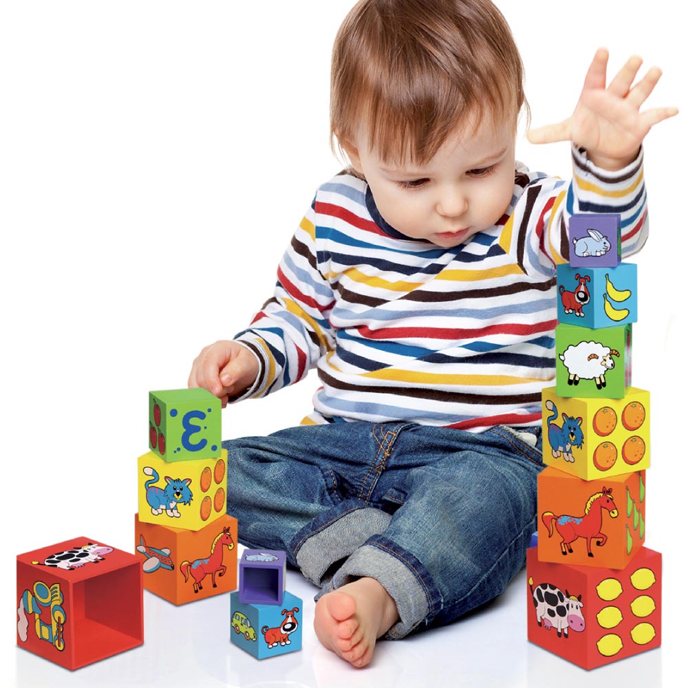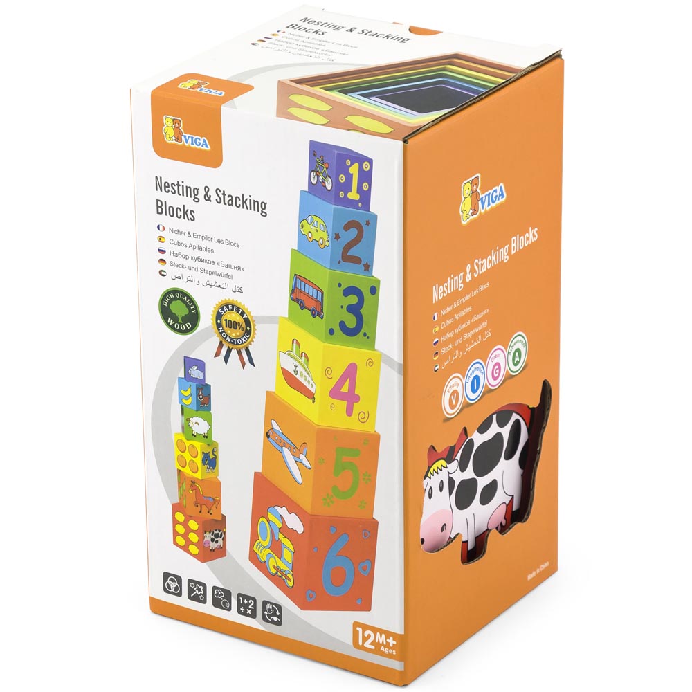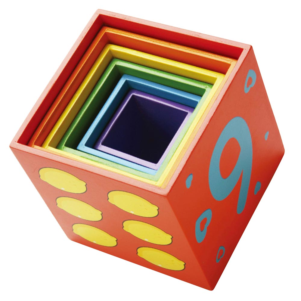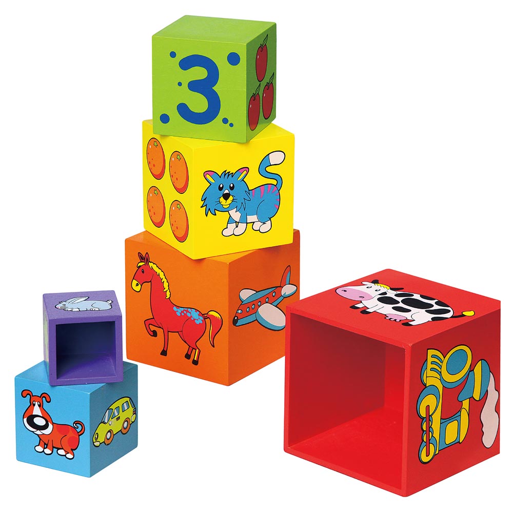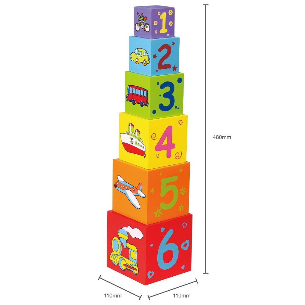 6 cubos de encaje de mayor a menor. Para encajar uno sobre otro y apilar. 4 caras con diferentes diseños y figuras, números de el 1 al 6, cantidad de frutas correspondiente al numero, vehículo de transporte y animales. De diferentes colores para contar del 1 al 6. De excelente calidad y diseño. Cubo grande rojo de 11 x 11 cm. 48 x 11 x 11 cm torre armada.