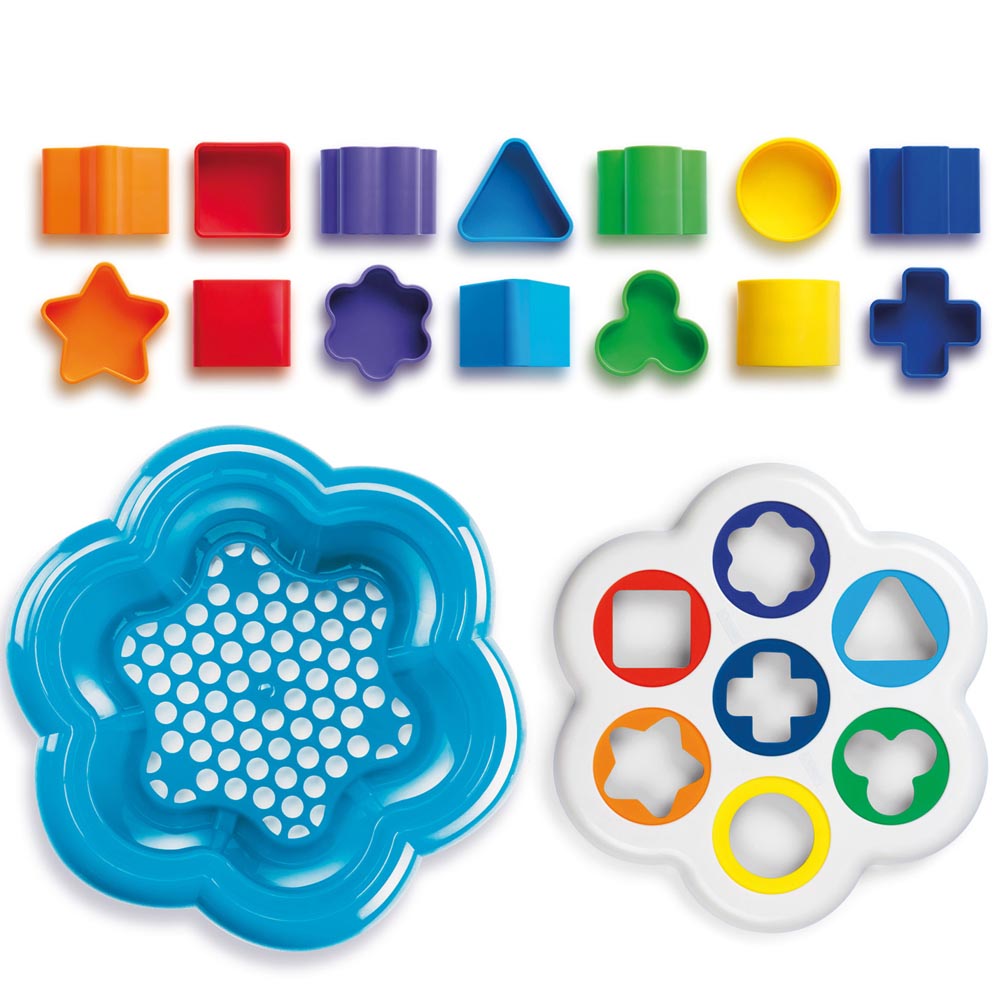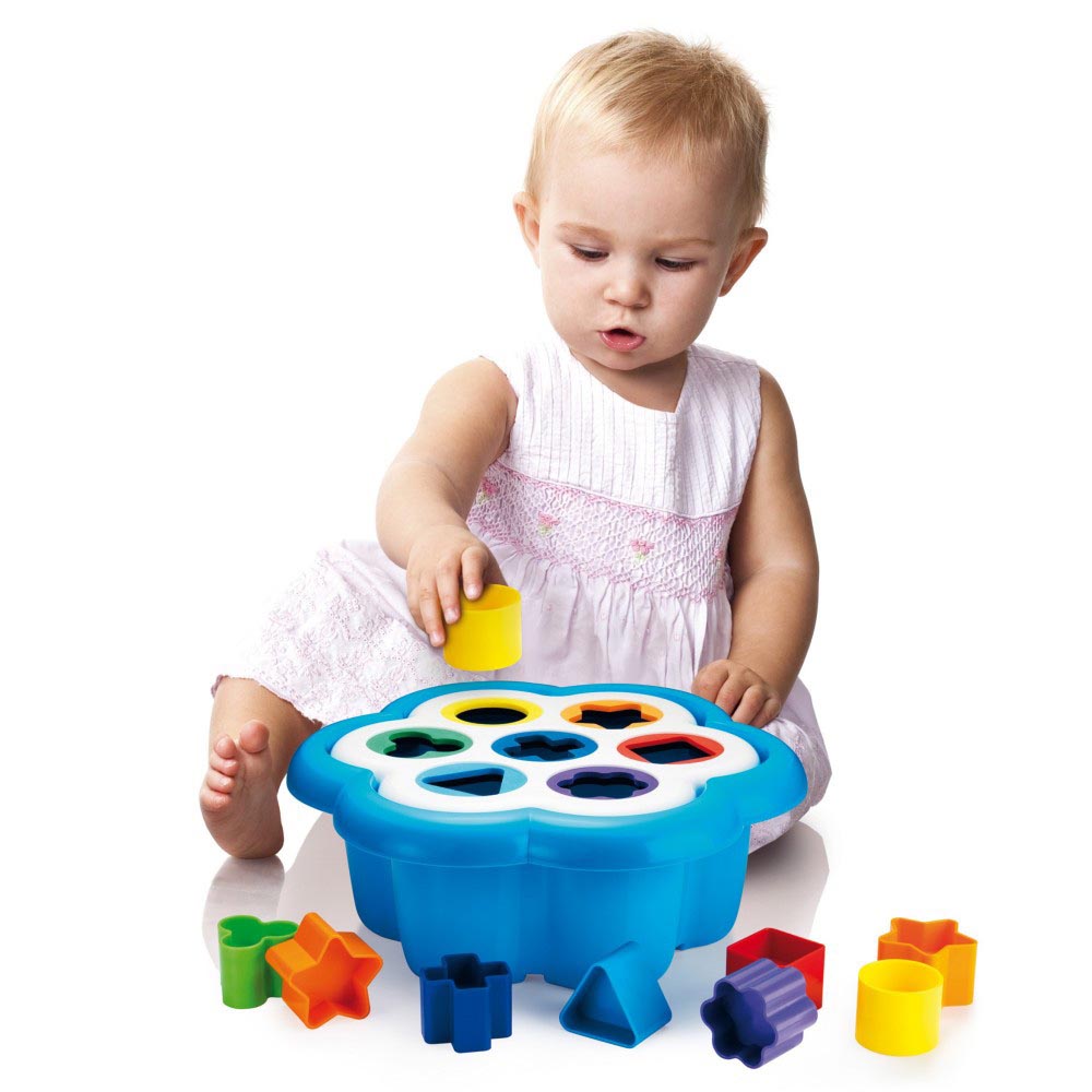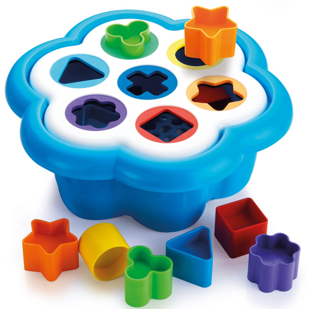 Base de margarita (34 cm diámetro x 14 cm) con tapa y con siete agujeros de diferentes tamaños y colores brillantes, cada uno correspondiente a los 14 bloques (6 x 4 cm diámetro) que su pequeño aprenderá a reconocer. Cada forma ( estrella, cuadrado, flor, triangulo, trébol, circulo y cruz) se coordina con un color diferente. Fortalece coordinación ojo mano, así como habilidades motoras. Plástico resistente y de brillantes colores.