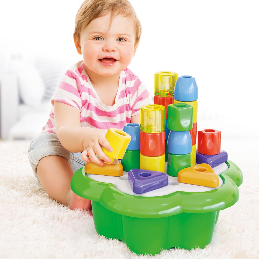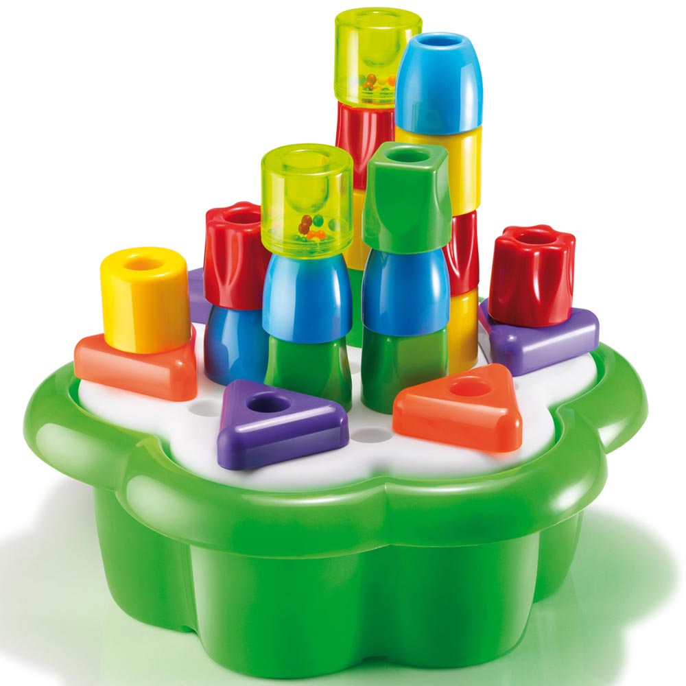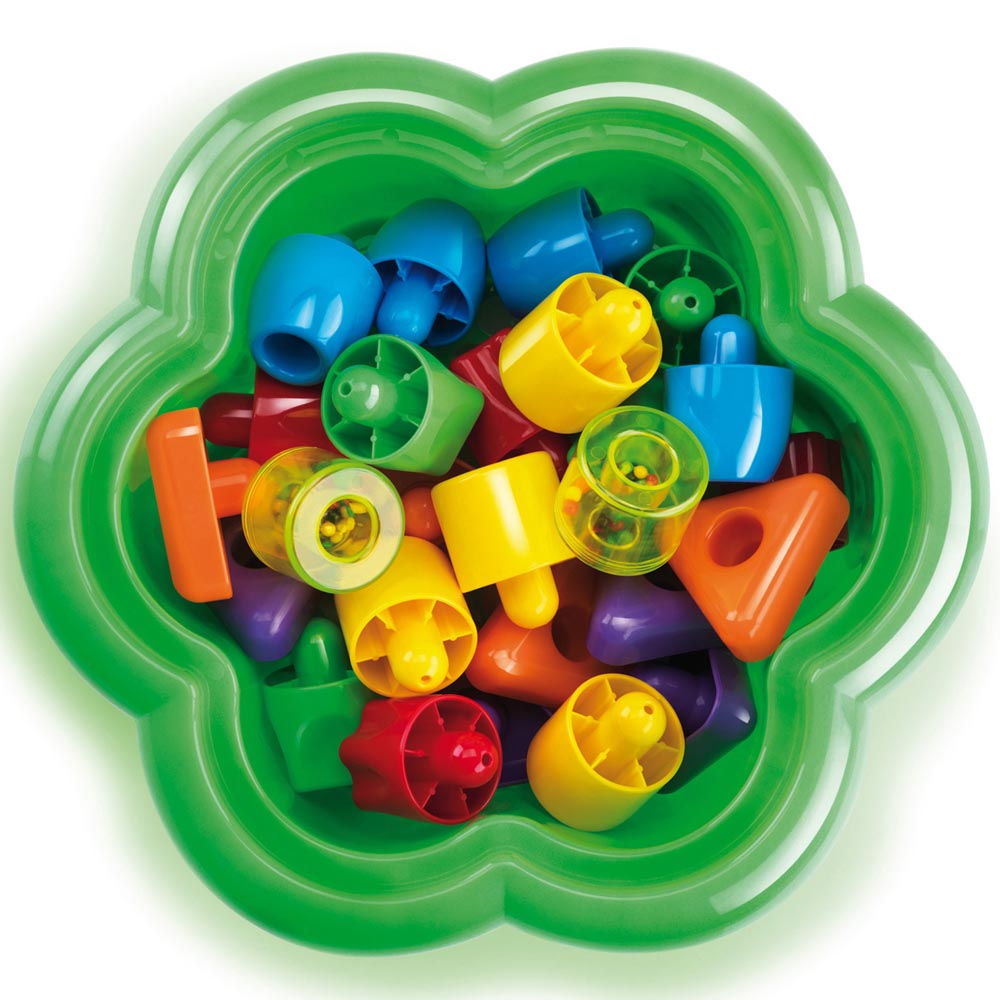 Creado con formas redondas, de material suave y seguro. Caja Daisy ha sido diseñado para los bebes y niños pequeños. Con grandes clavijas gruesas que son divertidos y fáciles de manejar, 4 redondas (6 x 4 cm diámetro), 4 ovaladas (6 x 4 cm diámetro), 4 tuerca (6 x 4 cm diámetro), 4 cuadrados (6 x 4 cm diámetro), 8 triángulos (7 x 7 x 4 cm) y 2 transparentes (6 x 4 cm diámetro) con pelotitas en su interior. El conjunto incluye un gran cubo en forma de flor (34 cm diámetro x 14 cm) con tapa con agujeros para calzar las clavijas para almacenar todas las piezas en su interior.