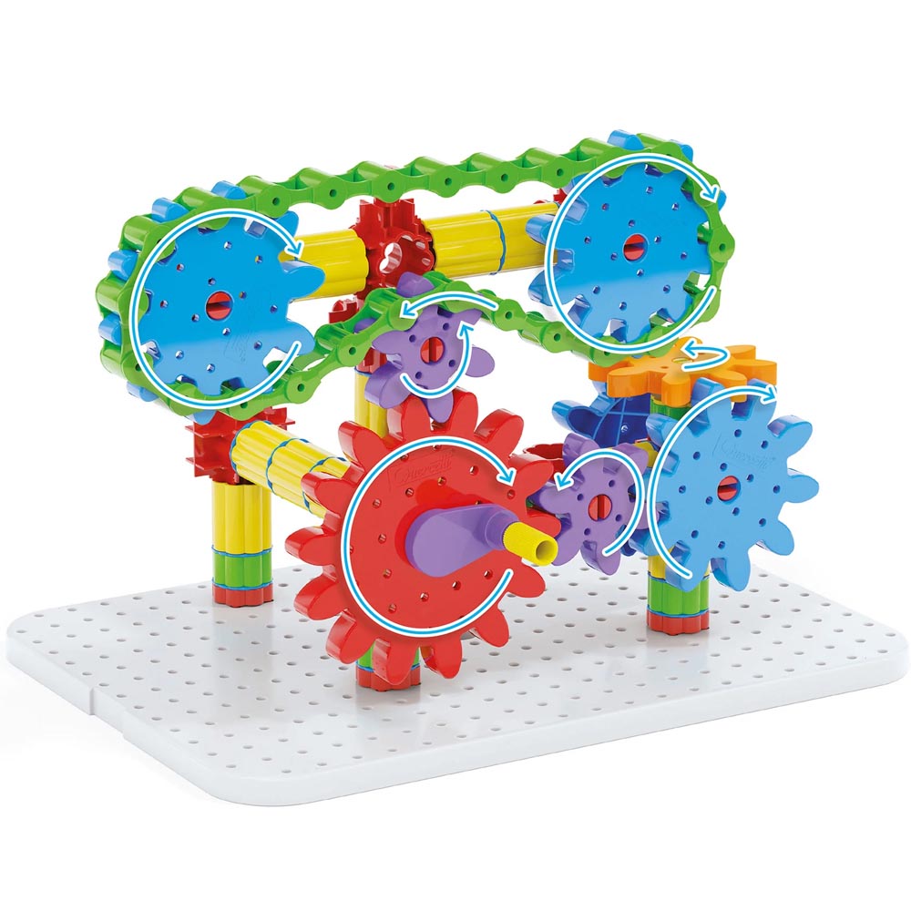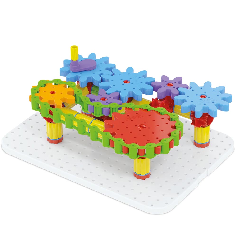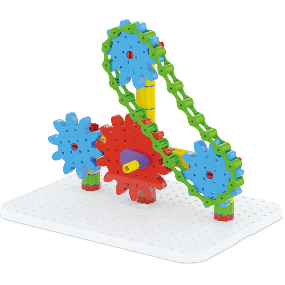 Construye complejas estructuras tridimensionales, conecta los engranajes y ponlo todo en movimiento en una espectacular reacción en cadena. Este ingenioso sistema de construcción cuenta con una cadena de plástico que permite transferir el movimiento entre engranajes que no están conectados. Una forma fantástica de aprender los principios de la mecánica mientras te diviertes. Además, es totalmente irrompible y seguro. Incluye 1 pizarra blanca + 1 trompo, 1 engranaje grande, 5 engranajes medianos, 2 engranajes pequeños, 23 pilares, 20 articulaciones, 1 cadena de 25 eslabones, 8 articulaciones rojas con conector de 4 vías, 9 conectores blancos, 1 álbum con instrucciones y ejemplos. Fabricado en material suave y resistente.